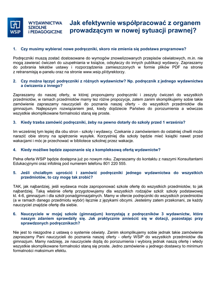 Jak efektywnie współpracować z organem prowadzącym w nowej sytuacji prawnej? 1. Czy musimy wybierać nowe podręczniki, skoro nie zmienia się podstawa programowa? Podręczniki muszą zostać dostosowane do wymogów znowelizowanych przepisów oświatowych, m.in. nie mogą zawierać ćwiczeń do uzupełniania w książce, odsyłaczy do innych publikacji wydawcy. Zapraszamy do pobrania tekstów ustawy i rozporządzenia zamieszczonych w formie plików PDF na stronie z retransmisją e‐panelu oraz na stronie www.wsip.pl/dyrektorzy. 2. Czy można łączyć podręczniki z różnych wydawnictw? Np. podręcznik z jednego wydawnictwa a ćwiczenia z innego? Zapraszamy do naszej oferty, w której proponujemy podręczniki i zeszyty ćwiczeń do wszystkich przedmiotów, w ramach przedmiotów mamy tez różne propozycje, zatem zanim skomplikujemy sobie takie zamówienie zapraszamy nauczycieli do poznania naszej oferty - do wszystkich przedmiotów dla gimnazjum. Najlepszym rozwiązaniem jest, kiedy dojdziecie Państwo do porozumienia a wówczas wszystkie skomplikowane formalności staną się proste. 3. Kiedy trzeba zamówić podręczniki, żeby na pewno dotarły do szkoły przed 1 września? Im wcześniej tym lepiej dla obu stron - szkoły i wydawcy. Czekanie z zamówieniem do ostatniej chwili może narazić obie strony na spiętrzenie wysyłek. Korzystniej dla szkoły będzie mieć książki nawet przed wakacjami i móc je przechować w bibliotece szkolnej przez wakacje. 4. Kiedy możliwe będzie zapoznanie się z kompleksową ofertą wydawnictw? Pełna oferta WSiP będzie dostępna już po nowym roku. Zapraszamy do kontaktu z naszymi Konsultantami Edukacyjnymi oraz infolinią pod numerem telefonu 801 220 555. 5. Jeśli chciałbym uprościć i zamówić podręczniki jednego wydawnictwa do wszystkich przedmiotów, to czy mogę tak zrobić? TAK, jak najbardziej, jeśli wydawca może zaproponować szkole ofertę do wszystkich przedmiotów, to jak najbardziej. Taką właśnie ofertę przygotowujemy dla wszystkich rodzajów szkół: szkoły podstawowej kl. 4-6, gimnazjum i dla szkół ponadgimnazjalnych. Mamy w ofercie podręczniki do wszystkich przedmiotów (a w ramach danego przedmiotu wybór) łącznie z językami obcymi. Jesteśmy zatem przekonani, ze każdy nauczyciel znajdzie ofertę dla siebie. 6. Nauczyciele w mojej szkole (gimnazjum) korzystają z podręczników 3 wydawnictw, które naszym zdaniem sprawdziły się. Jak praktycznie zmieścić się w dotacji, pozostając przy sprawdzonych podręcznikach? Nie jest to niezgodne z ustawą o systemie oświaty. Zanim skomplikujemy sobie jednak takie zamówienie zapraszamy Pani nauczycieli do poznania naszej oferty - oferty WSiP do wszystkich przedmiotów dla gimnazjum. Mamy nadzieję, ze nauczyciele dojdą do porozumienia i wybiorą jednak naszą ofertę i wtedy wszystkie skomplikowane formalności staną się proste. Jedno zamówienie u jednego dostawcy to minimum formalności maksimum efektu. 7. A jeśli obecny podręcznik nie ma miejsc do uzupełniania? Wszystkie podręczniki przeznaczone dla klas 1 gimnazjum na rok szkolny 2015/16 muszą zostać wpisane do nowego wykazu podręczników spełniających wymogi wyznaczone przez nowelizację ustawy o systemie oświaty z dnia 30 maja br., prowadzonego przez MEN. Wnioski dotyczące podręczników WSiP zostały już złożone do MEN i sukcesywnie otrzymują już decyzje o dopuszczeniu do użytku szkolnego. Zapraszamy do pobrania tekstów ustawy i rozporządzenia zamieszczonych w formie plików pdf w prawym dolnym rogu ekranu lub na stronie www.wsip.pl/dyrektorzy. 8. Czy podręczniki będą musiały zostać wpisane na stan biblioteki, a tym samym powiększą stan konta księgowego biblioteki? Podręczniki w ramach realizacji dotacji powinny być ewidencjonowane w bibliotece szkolnej. WSiP planuje przygotowanie materiałów pomagających w ewidencjonowaniu podręczników w bibliotece szkolnej. 9. Czy można wykorzystać dotacje tylko na cześć podręczników, a pozostałe po uzyskaniu zgody rodziców zostałyby przez nich zakupione do własnego użytku? Ustawa o systemie oświaty w brzmieniu nadanym jej nowelizacją z 30.04.2014 nie może być interpretowana jako zakazująca korzystania przez uczniów, na zasadach dobrowolności, z nabytych przez siebie innych materiałów dydaktycznych niż te, które wchodzą w skład zestawu ustalanego przez dyrektora szkoły i nabywanego dla uczniów ze środków publicznych (a także podręczników, o których mowa w art. 22 ad Ustawy, zapewnianych i finansowanych bezpośrednio przez ministra właściwego do spraw oświaty). Wyposażenie uczniów w dodatkowe materiały dydaktyczne może nastąpić z inicjatywy nauczyciela lub rodziców (pod warunkiem aprobaty nauczyciela), a ich zakup może mieć charakter indywidualny lub zorganizowany przez rodziców, również z zastosowaniem zasady solidarnego pokrycia kosztów takich dodatkowych materiałów wobec uczniów znajdujących się w trudnej sytuacji materialnej). 10. W jakim czasie mam wydać kwotę przeznaczoną na ćwiczenia - 25 zł? W terminie między 15 marca a 15 września należy złożyć wniosek do organu prowadzącego szkołę. Dotacja zostanie przekazana szkole między 1 maja a 15 października 2015 r. ale w terminie 14 dni od otrzymania przez JST. Kwoty dotacji – na podręczniki i materiały ćwiczeniowe należy wydać do 31 grudnia 2015r., a rozliczyć do 15 stycznia 2016 r. Warto jednak złożyć wniosek i zamówienie jak najwcześniej, aby podręczniki i materiały ćwiczeniowe trafiły do szkoły przed 1 września 2015r.. 11. Czy mogę od razu zamówić książki u tego wydawcy, którego wskażą nauczyciele, czy musze najpierw wysłać zapytania do kilku innych wydawnictw? W przypadku zamówień do kwoty 30.000 Euro, nie ma konieczności pozyskania oferty od innych wydawców. Można wysłać zamówienie od razu do wybranego wydawcy. To bardzo uprości postępowaniejedno zamówienie, jedna faktura,