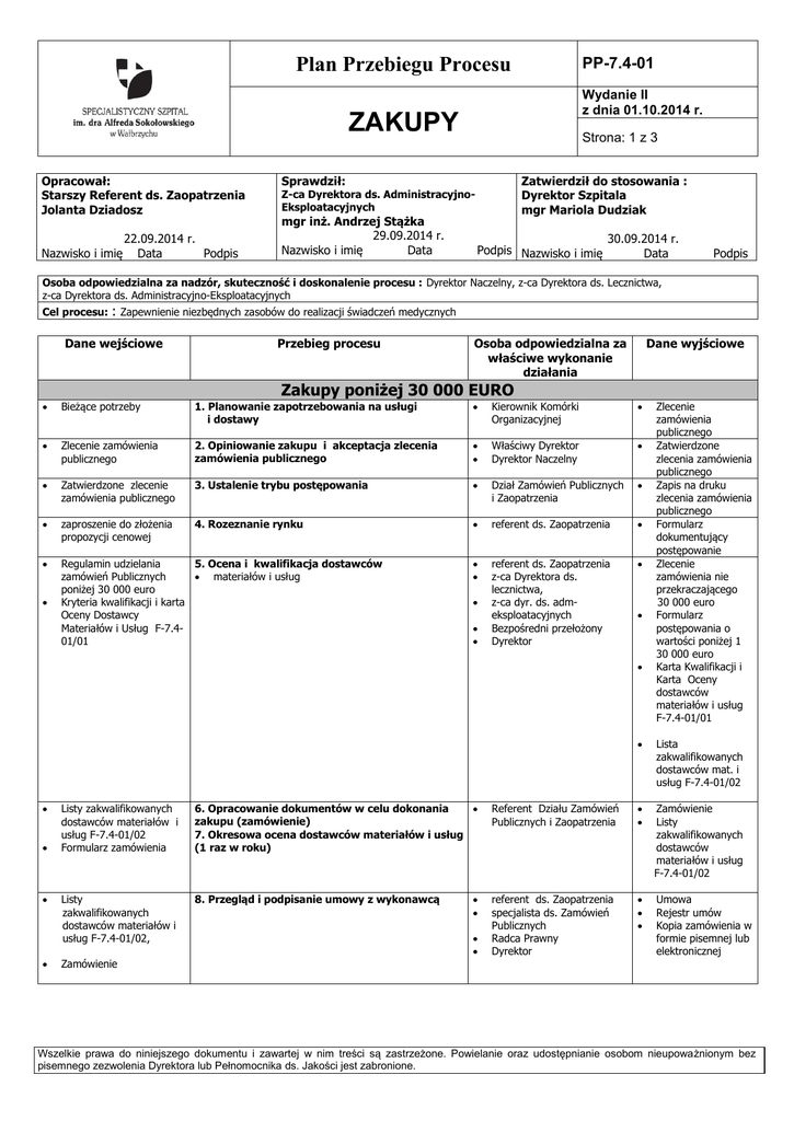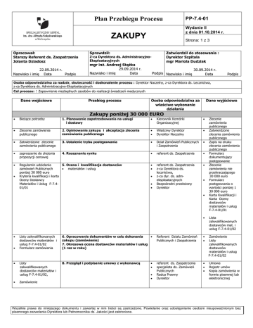 Plan Przebiegu Procesu PP-7.4-01 Wydanie II z dnia 01.10.2014 r. ZAKUPY Opracował: Starszy Referent ds. Zaopatrzenia Jolanta Dziadosz 22.09.2014 r. Nazwisko i imię Data Podpis Strona: 1 z 3 Sprawdził: Zatwierdził do stosowania : Dyrektor Szpitala mgr Mariola Dudziak Z-ca Dyrektora ds. AdministracyjnoEksploatacyjnych mgr inż. Andrzej Stążka 29.09.2014 r. Nazwisko i imię Data Podpis Nazwisko i imię 30.09.2014 r. Data Podpis Osoba odpowiedzialna za nadzór, skuteczność i doskonalenie procesu : Dyrektor Naczelny, z-ca Dyrektora ds. Lecznictwa, z-ca Dyrektora ds. Administracyjno-Eksploatacyjnych Cel procesu: : Zapewnienie niezbędnych zasobów do realizacji świadczeń medycznych Dane wejściowe Przebieg procesu Osoba odpowiedzialna za właściwe wykonanie działania Dane wyjściowe Zakupy poniżej 30 000 EURO Bieżące potrzeby 1. Planowanie zapotrzebowania na usługi i dostawy Kierownik Komórki Organizacyjnej Zlecenie zamówienia publicznego 2. Opiniowanie zakupu i akceptacja zlecenia zamówienia publicznego Właściwy Dyrektor Dyrektor Naczelny Zatwierdzone zlecenie zamówienia publicznego 3. Ustalenie trybu postępowania Dział Zamówień Publicznych i Zaopatrzenia zaproszenie do złożenia propozycji cenowej 4. Rozeznanie rynku referent ds. Zaopatrzenia Regulamin udzielania 5. Ocena i kwalifikacja dostawców zamówień Publicznych materiałów i usług poniżej 30 000 euro Kryteria kwalifikacji i karta Oceny Dostawcy Materiałów i Usług F-7.401/01 referent ds. Zaopatrzenia z-ca Dyrektora ds. lecznictwa, z-ca dyr. ds. admeksploatacyjnych Bezpośredni przełożony Dyrektor Listy zakwalifikowanych dostawców materiałów i usług F-7.4-01/02 Formularz zamówienia 6. Opracowanie dokumentów w celu dokonania zakupu (zamówienie) 7. Okresowa ocena dostawców materiałów i usług (1 raz w roku) Listy zakwalifikowanych dostawców materiałów i usług F-7.4-01/02, 8. Przegląd i podpisanie umowy z wykonawcą Zamówienie Zlecenie zamówienia publicznego Zatwierdzone zlecenia zamówienia publicznego Zapis na druku zlecenia zamówienia publicznego Formularz dokumentujący postępowanie Zlecenie zamówienia nie przekraczającego 30 000 euro Formularz postępowania o wartości poniżej 1 30 000 euro Karta Kwalifikacji i Karta Oceny dostawców materiałów i usług F-7.4-01/01 Lista zakwalifikowanych dostawców mat. i usług F-7.4-01/02 Referent Działu Zamówień Publicznych i Zaopatrzenia Zamówienie Listy zakwalifikowanych dostawców materiałów i usług F-7.4-01/02 referent ds. Zaopatrzenia specjalista ds. Zamówień Publicznych Radca Prawny Dyrektor Umowa Rejestr umów Kopia zamówienia w formie pisemnej lub elektronicznej Wszelkie prawa do niniejszego dokumentu i zawartej w nim treści są zastrzeżone. Powielanie oraz udostępnianie osobom nieupoważnionym bez pisemnego zezwolenia Dyrektora lub Pełnomocnika ds. Jakości jest zabronione. Plan Przebiegu Procesu Wydanie II z dnia 01.10.2014 r. ZAKUPY Umowa Faktury 9. Weryfikacja pod względem jakościowym i ilościowym zakupionych towarów/usług PP-7.4-01 Strona: 2 z 3 pracownik magazynu referent ds. zaopatrzenia specjalista ds. Zamówień Publicznych Użytkownik Zamówienie PZ Karta reklamacji F7.4-01/03 Rejestr reklamacji dostaw F-7.4-01/04 Zakupy powyżej 30 000 EURO Plan finansowo-rzeczowy zadań inwestycyjnych i remontowych, Formularz zlecenia zamówienia publicznego Zlecenia zamówienia publicznego 1. Planowanie zapotrzebowania na usługi i materiały Poszczególne komórki organizacyjne Wymagania Zlecenie zamówienia publicznego 2. Opiniowanie potrzeby zakupu Kierownicy komórek organizacyjnych Zaopiniowane zlecenie zamówienia Zaopiniowane zlecenia zamówienia publicznego Zatwierdzenie zlecenie zamówienia publicznego (inwestycje) Decyzja Dyrektora Plan zakupów Decyzja Dyrektora 3. Akceptacja zlecenia na zakup Właściwy Dyrektor Dyrektor Naczelny Dyrektor Główny księgowy Zatwierdzone zlecenie Decyzje Komórka organizacyjna użytkownika Dyrektor ds. Lecznictwa Z-ca dyrektora ds. admeksploatacyjnych Wniosek Rejestr postępowań Dyrektor Decyzja Dyrektora Komisja Przetargowa zleceniodawca Komisja Przetargowa Protokół 10. Ustalenie trybu przetargu Protokół 11. Opis przedmiotu zamówienia, ustalenie terminu otwarcia ofert Komisja Przetargowa zleceniodawca Projekt SIWZ 12. Zatwierdzenie SIWZ Dyrektor SIWZ 13. Ogłoszenie o postępowaniu Komisja Przetargowa Urząd Oficjalnych Publikacji Wspólnot Europejskich Biuletyn UZP Strona Internetowa Tablica ogłoszeń Prasa lokalna lub o zasięgu ogólnokrajowym Projekt odpowiedzi 4. Zatwierdzenie planu zakupów 5. Wniosek o wszczęcie postępowania przetargowego (opis przedmiotu zakupu) 6. Akceptacja wniosku pod względem finansowym i formalnym Ustawa Prawo zamówień publicznych (art.19 – 21) Ustawa Prawo zamówień publicznych Ustawa Prawo zamówień publicznych Ustawa Prawo zamówień publicznych Regulamin Komisji Przetargowej Protokół Ustawa Prawo zamówień publicznych Regulamin Komisji Przetargowej Ustawa Prawo zamówień publicznych Regulamin Komisji Przetargowej Ustawa Prawo zamówień publicznych Regulamin Komisji Przetargowej SIWZ Projekt odpowiedzi 7. Rejestracja postępowania 8. Powołanie Komisji Przetargowej 9. Ustalenie wartości szacunkowej 14. Pytania do SIWZ 15. Protesty i odwołania Komisja Przetargowa Specjalista z dziedziny objętej pytaniem 16. Akceptacja odpowiedzi Komisja przetargowa Dyrektor Odpowiedź do wszystkich zainteresowanych udziałem w postępowaniu Wszelkie prawa do niniejszego dokumentu i zawartej w nim treści są zastrzeżone. Powielanie oraz udostępnianie osobom nieupoważnionym bez pisemnego zezwolenia Dyrektora lub Pełnomocnika ds. Jakości jest zabronione. Plan Przebiegu Procesu Wydanie II z dnia 01.10.2014 r. ZAKUPY PP-7.4-01 Strona: 3 z 3 17. Otwarcie ofert Komisja przetargowa Protokół 18. Ocena ofert: formalna zgodności z SIWZ Komisja przetargowa Protokół 19. Propozycja wyboru najkorzystniejszej oferty Komisja przetargowa 