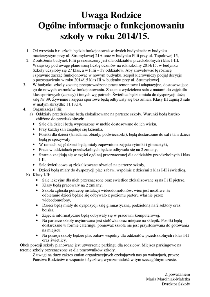 Uwaga Rodzice Ogólne informacje o funkcjonowaniu szkoły w roku 2014/15. 1. Od września b.r. szkoła będzie funkcjonować w dwóch budynkach: w budynku macierzystym przy ul. Strumykowej 21A oraz w budynku Filii przy ul. Topolowej 15, 2. Z założenia budynek Filii przeznaczony jest dla oddziałów przedszkolnych i klas I-III. Wziąwszy pod uwagę planowaną liczbę uczniów na rok szkolny 2014/15, w budynku Szkoły uczyłoby się 27 klas, a w Filii – 37 oddziałów. Aby zniwelować tę różnicę i sprawnie zacząć funkcjonować w nowym budynku, zespół kierowniczy podjął decyzję o pozostawieniu w roku 2014/15 klas III w budynku przy ul. Strumykowej. 3. W budynku szkoły zostaną przeprowadzone prace remontowe i adaptacyjne, dostosowujące go do nowych warunków funkcjonowania. Zostanie wydzielona sala z matami do zajęć dla klas sportowych (zapasy) i innych wg potrzeb. Świetlica będzie miała do dyspozycji dużą salę Nr 39. Żywienie i zajęcia sportowe będą odbywały się bez zmian. Klasy III zajmą 3 sale w małym skrzydle: 11,13,14. 4. Organizacja Filii: a) Oddziały przedszkolne będą zlokalizowane na parterze szkoły. Warunki będą bardzo zbliżone do przedszkolnych: • Sale dla dzieci będą wyposażone w meble dostosowane do ich wieku, • Przy każdej sali znajduje się łazienka, • Posiłki dla dzieci (śniadania, obiady, podwieczorki), będą dostarczane do sal i tam dzieci będą je spożywały • W ramach zajęć dzieci będą miały zapewnione zajęcia rytmiki i gimnastyki, • Praca w oddziałach przedszkolnych będzie odbywała się na 2 zmiany, • Szatnie znajdują się w części ogólnej przeznaczonej dla oddziałów przedszkolnych i klas I-II, • Sale świetlicowe są zlokalizowane również na parterze szkoły, • Dzieci będą miały do dyspozycji plac zabaw, wspólnie z dziećmi z klas I-II i świetlicą. b) Klasy I-II: • Sale lekcyjne dla nich przeznaczone oraz świetlice zlokalizowane są na I i II piętrze, • Klasy będą pracowały na 2 zmiany, • Szkoła zgłosiła potrzebę instalacji wideodomofonów, wiec jest możliwe, że odbieranie dzieci będzie się odbywało z poziomu parteru właśnie przez wideodomofony, • Dzieci będą miały do dyspozycji salę gimnastyczną, podzieloną na 2 sektory oraz boiska, • Zajęcia informatyczne będą odbywały się w pracowni komputerowej, • Na parterze szkoły usytuowana jest stołówka oraz miejsce na sklepik. Posiłki będą dostarczane w formie cateringu, ponieważ szkoła nie jest przystosowana do gotowania na miejscu. • Na posesji szkoły będzie plac zabaw wspólny dla oddziałów przedszkolnych i klas I-II oraz świetlicy. Obok posesji szkoły planowane jest utworzenie parkingu dla rodziców. Miejsca parkingowe na terenie szkoły przeznaczone są dla pracowników szkoły. Z uwagi na duży zakres zmian organizacyjnych czekających nas po wakacjach, proszę Państwa Rodziców o wsparcie i życzliwą wyrozumiałość w tym szczególnym czasie. Z poważaniem Maria Marciniak-Małetka Dyrektor Szkoły