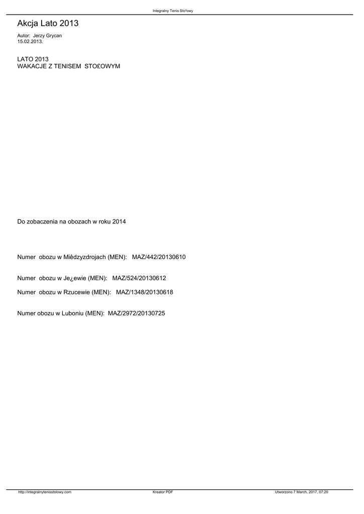 Integralny Tenis Sto³owy Akcja Lato 2013 Autor: Jerzy Grycan 15.02.2013. LATO 2013 WAKACJE Z TENISEM STO£OWYM Do zobaczenia na obozach w roku 2014 Numer obozu w Miêdzyzdrojach (MEN): MAZ/442/20130610 Numer obozu w Je¿ewie (MEN): MAZ/524/20130612 Numer obozu w Rzucewie (MEN): MAZ/1348/20130618 Numer obozu w Luboniu (MEN): MAZ/2972/20130725 http://integralnytenisstolowy.com Kreator PDF Utworzono 7 March, 2017, 07:20 Integralny Tenis Sto³owy Zapraszamy na obozy szkoleniowe dla dzieci i m³odzie¿y Pierwsze kroki od marzenia do mistrzostwa Miêdzyzdroje 1-11.07; Je¿ewo 15-25.07; Rzucewo 1-11.08 Luboñ 15-25.08; Do zobaczenia na obozach w roku 2014 Uczestnicy Ten cykl obozów jest dla dzieci ze szkó³ podstawowych oraz gimnazjalnych w wieku 7- 15 lat. Jest dla ka¿dego kto: (1) marzy o Mistrzostwie w tenisie sto³owym i w ¿yciu, (2) chce siê uczyæ podstaw tego sportu, (3) chce doskonaliæ zarówno swoje cia³o jak i umys³, (4) chce spotkaæ innych pasjonatów z ca³ego kraju (5) wspó³tworzyæ niepowtarzaln± atmosferê uczenia siê i zabawy. Cel obozu Na obozach uczestnicy naucz± siê i udoskonal±: (1) podstawowe umiejêtno¶ci techniczno-taktyczne gry w tenisa sto³owego, (2) rozwin± podstawowe cechy motoryczne, najwa¿niejsze dla swojego etapu rozwojowego, (3) opanuj± elementarne umiejêtno¶ci treningu mentalnego, (4) dowiedz± siê jak sport mo¿e zmieniæ ich ¶wiat na du¿o lepsze miejsce do ¿ycia; Program Na obozach planujemy... trening wykorzystuj±cy najlepsze do¶wiadczenia w szkoleniu mistrzów ¶wiata w tenisie sto³owym 3-6 godzin dziennie, a w tym: (1) naukê i doskonalenie podstawowej techniki gry - uchwytów rakietki, postawy gotowo¶ci, pracy nóg, serwów i odbiorów, uderzeñ atakuj±cych i obronnych itp., (2) æwiczenia wieloma pi³kami rozwijaj±ce sprawno¶æ specjaln±, (3) æwiczenia rozwijaj±ce cechy motoryczne - æwiczenia koordynacyjne, gry i zabawy zwinno¶ciowe i szybko¶ciowe, (4) æwiczenia rozci±gaj±ce i kompensacyjne; trening wykorzystuj±cy najlepsze na ¶wiecie praktyki treningu mentalnego -æwiczenia odporno¶ci psychicznej bêd± wplecione w ca³e zgrupowanie: (1) nauka obserwowania siebie, swojej gry, ale tak¿e swojego cia³a i umys³u; (2) nauka koncentracji na zadaniach szkoleniowych; (3) nauka ró¿nych metod radzenia sobie z emocjami, np. ró¿nych sposobów relaksowania siê i (4) nauka pierwszych kroków do wprowadzania najlepszego stanu psychicznego podczas gry, aby my¶leæ i czuæ siê jak Mistrz Olimpijski; wewnêtrzne gry i zawody - umo¿liwiaj±ce naukê podstawowych zasad taktycznych gry i sztuki wygrywania; aktywny wypoczynek - w ramach aktywnego wypoczynku proponujemy co najmniej po dwie wycieczki na ka¿dym obozie do ustalenia z uczestnikami: http://integralnytenisstolowy.com Kreator PDF Utworzono 7 March, 2017, 07:20 Integralny Tenis Sto³owy · Miêdzyzdroje: (1) Wycieczka do Rezerwatu ¯ubrów na terenie Woliñskiego Parku Narodowego, (2) Wycieczka do Muzeum Figur Woskowych; (3) Wycieczka statkiem Viking po morzu; a oprócz tego (4) Spacery: po Parku Zdrojowym im. F.Chopina, do lasu, na pla¿ê, na molo, po promenadzie gwiazd oraz k±piel w morzu itp.. BRAK JU¯ MIEJSC! · Je¿ewo: (1) Piknik w gospodarstwie agroturystycznym (jazda konna pod okiem instruktora, przeja¿d¿ka bryczk±, grill); (2) Wizyta w Muzeum Wsi Mazowieckiej w Sierpcu (w którym nakrêcano sceny z filmów Pan Tadeusz, Ogniem i mieczem, Szwadron i inne); (3) Odpoczynek nad jeziorem Urszulewskim w miejscowo¶ci Szczutowo, 30km od Je¿ewa pla¿owanie, przeja¿d¿ka motorówk±; (4) Gry i rozrywki ¶wietlicowe (bilard, pi³karzyki, ma³e sto³y do tenisa sto³owego itp.). BRAK JU¯ MIEJSC! · Rzucewo: (1) Odpoczynek nad Zatok± Puck± pla¿owanie; (2) Ognisko z lokalnym kaszubskim gawêdziarzem; (3) Ognisko po³±czone z krótkimi jazdami konnymi w stadninie koni znajduj±cej siê przy pa³acu; (4) Rejs ¿aglówkami na tzw. Suche Rewy, wyspê na ¶rodku Zatoki, po³±czonym z grillem. BRAK JU¯ MIEJSC! · Luboñ: (1) Wycieczka na poznañsk± Maltê, na której znajduje siê Aquapark (Termy Maltañskie): http://www.termymaltanskie.com.pl ; (2) Odwiedzenie Nowego ZOO: http://www.zoo.poznan.pl/ ; (3) Przeja¿d¿ka Kolej± Parkow± Maltank± ; (4) Wycieczka do Muzeum Arkadego Fidlera (podró¿nika i pisarza) z ciekawymi eksponatami z ró¿nych kontynentów i zaskakuj±cymi rze?bami w parku http://www.fiedler.pl/ ; (5) odwiedzenie Poznañskiej Cytadeli, która by³a najwiêkszym fortem artyleryjskim w Europie, a obecnie jest uwielbianym przez poznaniaków parkiem; (6) Zwiedzanie Starego Miasta w Poznaniu ( m.in. ratusz ze s³awnymi poznañskimi kozio³kami i hejna³em). Kadra Dzieæmi zaopiekuj± siê profesjonalni trenerzy, nauczyciele i pedagodzy (uczestnicy programu Od marzenia do Mistrzostwa FUNdamenty 1, FUNdamenty 2 oraz FUNdamenty 3 ): · trener Jerzy Grycan - trener klasy mistrzowskiej, trener mentalny, wieloletni trener kadr narodowych Polski i Australii, jego wychowankowie zdobyli setki medali na mistrzostwach krajowych i miêdzynarodowych, autor ksi±¿ki Integralny tenis sto³owy; · trenerka Magdalena Górowska - trenerka II klasy, wieloletnia reprezentantka Polski, wielokrotna Mistrzyni Polski we wszystkich kategoriach wiekowych; · trenerka Anna Bednarska-Wnêk - trenerka I klasy, nauczyciel dyplomowany wf-u i jêzyka angielskiego, s³uchaczka psychologii sportu, reprezentantka kraju, wyszkoli³a mistrzyniê Polski juniorek, trenerka pierwszoligowego zespo³u kobiet AZS Politechnika Wroc³aw; http://integralnytenisstolowy.com Kreator PDF Utworzono 7 March, 2017, 07:20 Integralny Tenis Sto³owy · trener Tomasz Redzimski - trener II klasy, g³ówny trener klubu Bogoria Grodzisk Mazowiecki, najlepszego klubu w ostatnich latach, mistrz Polski i wielokrotny medalista mistrzostw Polski; · zespó³ do¶wiadczonych trenerów i pedagogów z ca³ego kraju którzy od trzech lat wspó³pracuj± w ramach programu Od marzenia do Mistrzostwa" FUNdament