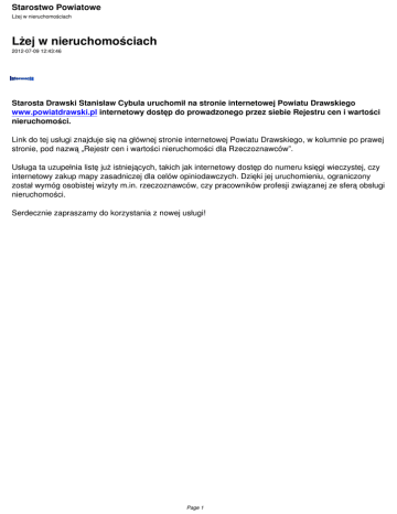 Starostwo Powiatowe Lżej w nieruchomościach Lżej w nieruchomościach 2012-07-09 12:43:46 Starosta Drawski Stanisław Cybula uruchomił na stronie internetowej Powiatu Drawskiego www.powiatdrawski.pl internetowy dostęp do prowadzonego przez siebie Rejestru cen i wartości nieruchomości. Link do tej usługi znajduje się na głównej stronie internetowej Powiatu Drawskiego, w kolumnie po prawej stronie, pod nazwą „Rejestr cen i wartości nieruchomości dla Rzeczoznawców”. Usługa ta uzupełnia listę już istniejących, takich jak internetowy dostęp do numeru księgi wieczystej, czy internetowy zakup mapy zasadniczej dla celów opiniodawczych. Dzięki jej uruchomieniu, ograniczony został wymóg osobistej wizyty m.in. rzeczoznawców, czy pracowników profesji związanej ze sferą obsługi nieruchomości. Serdecznie zapraszamy do korzystania z nowej usługi! Page 1