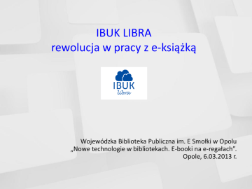 IBUK LIBRA rewolucja w pracy z e-książką Wojewódzka Biblioteka Publiczna im. E Smołki w Opolu „Nowe technologie w bibliotekach. E-booki na e-regałach”. Opole, 6.03.2013 r. IBUK – platforma w dwóch wersjach • Odbiorcy indywidualni www.ibuk.pl - sklep internetowy z e-książkami (epub, pdf, mobi, tytuły on-line) i audiobookami - 14 000 tytułów - ceny atrakcyjne dla użytkowników - ustalona pozycja na rynku (odwiedziło nas już ponad 5 milionów osób!) • Odbiorcy instytucjonalni - www.libra.ibuk.pl - biblioteki akademickie, publiczne, pedagogiczne, instytucje edukacyjne, firmy - szybko rosnące zainteresowanie wersją korporacyjną ibuka Ibuk Libra • • • • 5 lat na rynku (pod nazwą Ibuk Libra od XII 2012 r.) dostęp czasowy online do pełnych tekstów publikacji ponad 150 aktywnych umów ok. 110 uczelni różnego typu (uniwersytety klasyczne i przymiotnikowe, politechniki, uczelnie medyczne, zawodowe, prywatne, akademie pedagogiczne itd.) • ponad 30 bibliotek publicznych i pedagogicznych, w tym kilka konsorcjów bibliotek publicznych (Dolnośląski Zasób Biblioteczny, Opolskie Biblioteki Publiczne, Konsorcjum Mazowieckich Bibliotek Publicznych i in.) • biblioteki specjalistyczne (np. GUS, NBP) • łącznie dostęp do wykupionych zasobów mają czytelnicy ponad 200 bibliotek Księgozbiór w ofercie online • najlepsze polskie wydawnictwa akademickie, naukowe i profesjonalne; wydawcy literatury popularnej • wszystkie dziedziny nauki, różne typy publikacji: - podręczniki akademickie - książki naukowe i popularnonaukowe - monografie - czasopisma naukowe - materiały pokonferencyjne • literatura piękna, dla dzieci i młodzieży, literatura faktu, podręczniki i lektury szkolne, poradniki, przewodniki i in. • wyjątkowa oferta – większość publikacji w wersji elektronicznej dostępna wyłącznie w ibuku Jak to działa? książki kupione książki wypożyczone fragmenty notatki własne dokumenty Klient może korzystać z wykupionego dostępu na dowolnym urządzeniu wyposażonym w przeglądarkę internetową. Wystarczy, że zaloguje się do swojego konta w myIBUK Rewolucja w pracy z treścią książki • Tworzenie zakładek • Podkreślanie i zaznaczanie tekstu • Tagowanie fragmentów książki (np. ważne, wskazówka, egzamin) • Tworzenie i eksport notatek • Generowanie bibliografii • Przeszukiwanie pełnotekstowe, wyszukiwanie wewnątrztekstowe • Prezentacja książki w trybie optymalnym dla urządzenia oraz w trybie zgodnym z wersją papierową • Dostęp do słowników i encyklopedii z bazy Wydawnictwa Naukowego PWN • Praca w trybie kompendium Zaawansowane funkcje Przeszukiwanie treści książek Czytelnik ma możliwość wyszukiwania potrzebnych informacji w wykupionych podręcznikach przeszukując ich treść. Można wpisać słowa, pojęcia, całe frazy, a IBUK przedstawi wyniki wyszukiwania wraz z kontekstem. Zaawansowane funkcje Zakreślanie tekstu, własne notatki, tagowanie Można podkreślać, zakreślać, zaznaczać ważne fragmenty w książkach na swoim koncie. Czytelnik może dodawać tagi, tworzyć zakładki i robić notatki na bieżąco. W IBUKu praca z tekstem to przyjemność. http://vimeo.com/53587389 Zaawansowane funkcje Przeglądanie zaznaczonych treści Ibuk pozwala szybko przeglądać tylko zaznaczone przez siebie fragmenty książek lub selekcjonować zakreślone treści według tagów. Zaawansowane funkcje Dzielenie się notatkami Każdy użytkownik może dzielić się materiałami. W IBUKu może robić własne notatki bezpośrednio w podręcznikach i wymieniać się nimi z wszystkimi użytkownikami zasobów uczelnianych lub posiadaczami konta IBUK Plus. Zaznaczaj, zapisuj, wysyłaj! Zaawansowane funkcje Sprawdzanie definicji Jeżeli w swoich książkach natrafisz na nieznane pojęcia lub słowa w obcym języku, możesz błyskawicznie sprawdzić ich definicję w encyklopedii lub znaczenie w słowniku. IBUK LIBRA gwarantuje dostęp do słowników i encyklopedii z bazy Wydawnictwa Naukowego PWN. Korzyści dla bibliotek • stworzenie własnej, unikalnej bazy publikacji elektronicznych w języku polskim, z zawartością dostosowaną do potrzeb czytelników • nowoczesny wizerunek w oczach czytelników: przyciągnięcie do biblioteki młodego czytelnika • optymalizacja wykorzystania miejsca magazynowego • uzupełnienie tradycyjnego księgozbioru • zawsze zadowolony klient – książka w ciągłym dostępie • szybki dostęp do nowości; publikacje niszowe / wyczerpane nakłady IBUK LIBRA w Opolu i woj. opolskim • region opolski otwarty na nowe technologie • 4177 dostępnych publikacji elektronicznych w woj. opolskim - Uniwersytet Opolski - Opolskie Biblioteki Publiczne – WBP Opole i 15 bibliotek publicznych - PMWSZ Opole - PWSZ Nysa • w okresie 1.01.-28.02.2013 r. czytelnicy woj.opolskiego w ramach Ibuk Libra przeczytali 114 761 stron e-książek, a więc 1945 stron dziennie Ekskluzywne konto Premium (Ibuk Plus) Wygodny abonament: 25 publikacji w cenie 99 zł, na semestr Dodatkowe funkcjonalności: • dodawanie materiałów własnych do konta myIBUK • praca w trybie projektu / wirtualnej teczki oraz konspektu • możliwość czytania offline • cytaty Zapraszamy do współpracy!!! Anna Radoszewska email: [email protected] tel. 502 796 061