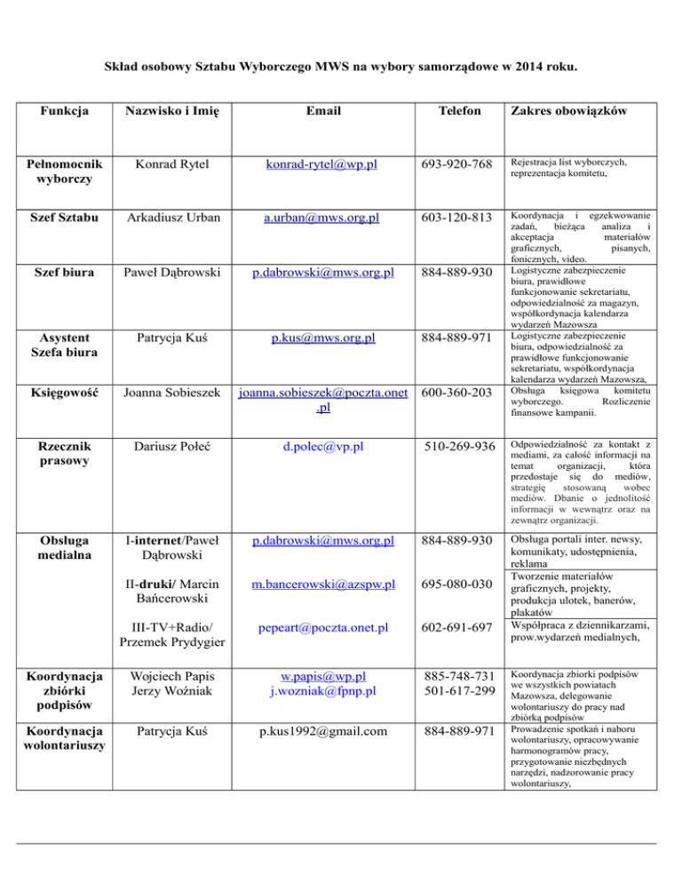 Skład osobowy Sztabu Wyborczego MWS na wybory samorządowe w 2014 roku. Funkcja Nazwisko i Imię Email Telefon Zakres obowiązków Pełnomocnik wyborczy Konrad Rytel [email protected] 693-920-768 Rejestracja list wyborczych, reprezentacja komitetu, Szef Sztabu Arkadiusz Urban [email protected] 603-120-813 Szef biura Paweł Dąbrowski [email protected] 884-889-930 Asystent Szefa biura Patrycja Kuś [email protected] 884-889-971 Księgowość Joanna Sobieszek Koordynacja i egzekwowanie zadań, bieżąca analiza i akceptacja materiałów graficznych, pisanych, fonicznych, video. Logistyczne zabezpieczenie biura, prawidłowe funkcjonowanie sekretariatu, odpowiedzialność za magazyn, współkordynacja kalendarza wydarzeń Mazowsza Logistyczne zabezpieczenie biura, odpowiedzialność za prawidłowe funkcjonowanie sekretariatu, współkordynacja kalendarza wydarzeń Mazowsza, Obsługa księgowa komitetu wyborczego. Rozliczenie finansowe kampanii. Rzecznik prasowy Dariusz Połeć [email protected] 510-269-936 Odpowiedzialność za kontakt z mediami, za całość informacji na temat organizacji, która przedostaje się do mediów, strategię stosowaną wobec mediów. Dbanie o jednolitość informacji w wewnątrz oraz na zewnątrz organizacji. Obsługa medialna I-internet/Paweł Dąbrowski [email protected] 884-889-930 II-druki/ Marcin Bańcerowski [email protected] 695-080-030 III-TV+Radio/ Przemek Prydygier [email protected] 602-691-697 Obsługa portali inter. newsy, komunikaty, udostępnienia, reklama Tworzenie materiałów graficznych, projekty, produkcja ulotek, banerów, plakatów Współpraca z dziennikarzami, prow.wydarzeń medialnych, Koordynacja zbiórki podpisów Wojciech Papis Jerzy Woźniak [email protected] [email protected] 885-748-731 501-617-299 Koordynacja wolontariuszy Patrycja Kuś [email protected] 884-889-971 [email protected] 600-360-203 .pl Koordynacja zbiorki podpisów we wszystkich powiatach Mazowsza, delegowanie wolontariuszy do pracy nad zbiórką podpisów Prowadzenie spotkań i naboru wolontariuszy, opracowywanie harmonogramów pracy, przygotowanie niezbędnych narzędzi, nadzorowanie pracy wolontariuszy, Program wyborczy Jerzy Zdrzałka [email protected] 601-563-990 Przygotowanie programu wyborczego, wprowadzanie poprawek, Koordynator ds. wyborów Wojciech Krajewski [email protected] 510-273-677 Kompletowanie list kandydatów do sejmiku, łącznik pomiędzy poszczególnymi okręgami wyborczymi, Koordynowanie działań wyborczych MWS w okręgu, kompletowanie list kandydatów do sejmiku, ścisła współpraca z Koordynatorem ds. wyborów(Wojciech Krajewski) Koordynatorzy okręgów wyborczych Okręg 1 Wioletta Krzyżanowska 507-953-483 Okręg 2 Wojciech Papis [email protected] 885-748-731 Okręg 3 Arkadiusz Urban [email protected] 603-120-813 Okręg 4 Paweł Połanecki [email protected] 601-258-789 Okręg 5 Krzysztof Górak [email protected] 601-808-160 Okręg 6 Kaszyński Wojciech Okręg 7 Mariusz Ambroziak mambroziak@amaconsulting. pl 501-778-002 Dystrybucja Marcin Bańcerowski [email protected] 695-080-030 Kalendarz wydarzeń na Mazowszu Andrzej Chyłek/ Patrycja Kuś [email protected] [email protected] 606-115-980 884-889-971 Obsługa fotograficzna Paweł Małaczewski [email protected] 690-955-850 Sprawy formalnoprawne Infolinia Państwowej Komisji Wyborczej 667-679-977 22 695-61-37 Organizacja wszelkich akcji dystrybucji materiałów wyborczych, zabezpieczenie akcji bezpośrednich z udziałem MWS, zabezpieczenie happeningów. Koordynacja i wyszukiwanie wydarzeń na Mazowszu wartych udziału MWS, aktualizacja kalendarza wydarzeń, udostępnienie dla wszystkich członków Fotografowanie wydarzeń, akcji z udziałem kandydatów
