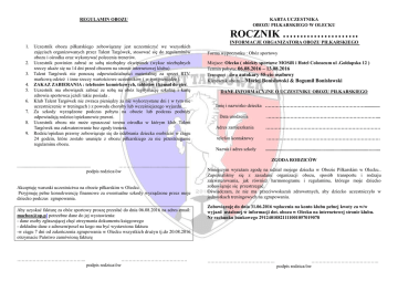 REGULAMIN OBOZU KARTA UCZESTNIKA OBOZU PIŁKARSKIEGO W OLECKU ROCZNIK …………………. 1. Uczestnik obozu piłkarskiego zobowiązany jest uczestniczyć we wszystkich zajęciach organizowanych przez Talent Targówek, stosować się do regulaminów obozu i ośrodka oraz wykonywać polecenia trenerów. 2. Uczestnik powinien zabrać ze sobą niezbędny ekwipunek (wykaz niezbędnych rzeczy ukaże się na 14 dni przed obozem na stronie internetowej klubu) 3. Talent Targówek nie ponoszą odpowiedzialności materialnej za sprzęt RTV, markową odzież i inne rzeczy wartościowe uczestników ( w tym pieniądze ). 4. ZAKAZ ZABIERANIA : telefonów komórkowych, tabletów i konsol do gier. 5. Uczestnik ma obowiązek zabrać ze sobą na obóz legitymację szkolną i kartę zdrowia sportowca jeżeli takie posiada . 6. Klub Talent Targówek nie zwraca pieniędzy za nie wykorzystane dni ( w tym nie uczestniczenie w treningach ) z powodu choroby lub wcześniejszego wyjazdu. 7. Za szkody wyrządzone podczas pobytu na obozie lub podczas podróży odpowiadają rodzice/opiekunowie prawni. 8. Uczestnik obozu nie może opuszczać terenu ośrodka w którym klub Talent Targówek ma zakwaterowanie bez zgody trenera. 9. Rodzic/opiekun prawny zobowiązuje się do odebrania dziecka osobiście w ciągu 24 godzin, które zostało usunięte z obozu piłkarskiego za nie przestrzeganie regulaminu obozu. INFORMACJE ORGANIZATORA OBOZU PIŁKARSKIEGO Forma wypoczynku : Obóz sportowy Miejsce: Olecko ( obiekty sportowe MOSiR i Hotel Colosseum ul .Gołdapska 12 ) Termin pobytu: 06.08.2016 – 13.08.2016 Transport : dwa autokary 55-cio osobowy Kierownik obozu – Maciej Bonisławski & Bogumił Bonisławski DANE INFORMACYJNE O UCZESTNIKU OBOZU PIŁKARSKIEGO Imię i nazwisko dziecka ………………………………………………………............. Data urodzenia ..……………………………………………………………... Adres zamieszkania ………………………………………………………………. telefon kontaktowy ……………………………………………………………… Nazwa i adres szkoły ................................................................................................. ZGODA RODZICÓW .............................................................. ………................................................ podpis rodzica/ów Akceptuję warunki uczestnictwa na obozie piłkarskim w Olecku Przyjmuję pełne konsekwencję finansowe za ewentualne szkody wyrządzone przez moje dziecko podczas zgrupowania. Aby uzyskać fakturę za obóz sportowy proszę przesłać do dnia 06.08.2016 na adres email: [email protected] potrzebne dane do jej wystawienia: - dane osoby zgłaszającej chęć otrzymania dokumentu księgowego - dokładne dane z adresem/pesel na kogo ma być wystawiona faktura -w ciągu 7 dni od zakończenia zgrupowania w Olecku wszystkich drużyn tj.do 20.08.2016 otrzymacie Państwo zamówioną fakturę …………………………………….. …………………………………… podpis rodzica/ów Niniejszym wyrażam zgodę na udział mojego dziecka w Obozie Piłkarskim w Olecku.. Zapoznaliśmy się z zasadami organizacji obozu, sposób transportu i rodzaju zakwaterowania, jak również harmonogramu i regulaminu, którego moje dziecko zobowiązuje się przestrzegać. Oświadczam, że nie ma przeciwwskazań zdrowotnych, aby dziecko uczestniczyło w jednostkach treningowych na zgrupowaniu. Zobowiązuję do dnia 31.06.2016 wpłacenia na konto klubu pełnej kwoty za w/w wyjazd ustalonej w informacji dot. obozu w Olecku na internetowej stronie klubu. Nr rachunku bankowego 29124010821111001057019078 ……………………………………. ……………………………………. podpis rodzica/ów INFORMACJA RODZICÓW (OPIEKUNÓW) O STANIE ZDROWIA DZIECKA INFORMACJA RODZICÓW O DZIECKU 1. Imię i nazwisko dziecka ....................................................................................................... 2. Przebyte choroby zakaźne (podać, w którym roku życia, lub wpisać „nie”) : ……………………………………………………………………………………………….. …..…………………………………………………………………………………………… ……………………………………………………………………………………………….. 3. U dziecka występowały w ostatnim roku lub występują obecnie (*właściwe podkreślić): Drgawki, utraty przytomności, zaburzenia równowagi, omdlenia, częste bóle głowy, lęki nocne, trudności w zasypianiu, tiki, moczenia nocne, częste bóle brzucha, wymioty, krwawienia z nosa, przewlekły kaszel, (lub katar, anginy), duszność, bóle stawów, szybkie męczenie się, niedosłuch, inne ................................................................................................. 4. Dziecko jest *: nieśmiałe, ma trudności w nawiązywaniu kontaktów, nadpobudliwe, inne informacje o usposobieniu i zachowaniu dziecka. 5. Dziecko jest uczulone * : tak, nie, jeśli tak podać na co ...................................................... .................................................................................................................................................. 6. Dziecko nosi* : okulary, aparat ortodontyczny, wkładki ortopedyczne, inne aparaty ................................................................................................................................... 7. Jazdę samochodem znosi * : dobrze, źle. 8. Inne uwagi o zdrowiu dziecka ............................................................................................. ………………………………………………………………………………………………. 9.Wyrażamy zgodę na hospitalizację, leczenie lub zabiegi operacyjne w przypadku nieszczęśliwego wypadku naszego dziecka. W razie z