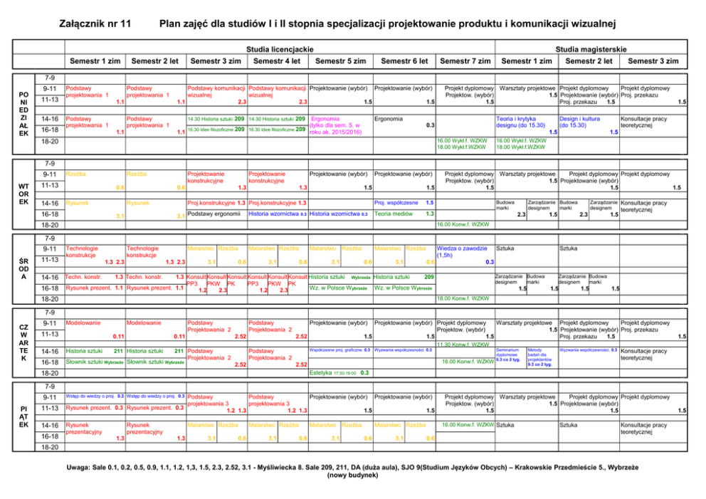 Załącznik nr 11 Plan zajęć dla studiów I i II stopnia specjalizacji projektowanie produktu i komunikacji wizualnej Studia licencjackie Semestr 1 zim Semestr 2 let Semestr 3 zim Semestr 4 let Studia magisterskie Semestr 5 zim Semestr 6 let Semestr 7 zim Semestr 1 zim Semestr 2 let Semestr 3 zim 7-9 PO NI ED ZI AŁ EK 9-11 11-13 14-16 16-18 Podstawy projektowania 1 Podstawy projektowania 1 1.1 Podstawy projektowania 1 Podstawy komunikacji Podstawy komunikacji Projektowanie (wybór) Projektowanie (wybór) wizualnej wizualnej 1.1 2.3 2.3 1.5 1.5 Podstawy projektowania 1 1.1 14.30 Historia sztuki 209 14.30 Historia sztuki 209 1.1 16.30 Idee filozoficzne 209 16.30 Idee filozoficzne Ergonomia (tylko dla sem. 5. w 209 roku ak. 2015/2016) Projekt dyplomowy Warsztaty projektowe Projekt dyplomowy Projekt dyplomowy Projektow. (wybór) 1.5 Projektowanie (wybór) Proj. przekazu 1.5 Proj. przekazu 1.5 Ergonomia Teoria i krytyka designu (do 15.30) 0.3 Design i kultura (do 15.30) 1.5 16.00 Wykł.f. WZKW 18.00 Wykł.f.WZKW 18-20 1.5 Konsultacje pracy teoretycznej 1.5 16.00 Wykł.f. WZKW 18.00 Wykł.f.WZKW 7-9 9-11 WT OR EK Rzeźba 11-13 14-16 Rzeźba 0.6 Rysunek 16-18 Projektowanie konstrukcyjne Projektowanie konstrukcyjne 0.6 Rysunek 1.3 1.3 Historia wzornictwa 0.3 Projektowanie (wybór) 1.5 Proj.konstrukcyjne 1.3 Proj.konstrukcyjne 1.3 3.1 Podstawy ergonomii 3.1 Projektowanie (wybór) Historia wzornictwa 0.3 1.5 Proj. współczesne 1.5 Teoria mediów 1.3 Projekt dyplomowy Warsztaty projektowe Projekt dyplomowy Projekt dyplomowy Projektow. (wybór) 1.5 Projektowanie (wybór) 1.5 1.5 1.5 Budowa marki Zarządzanie Budowa designem marki 2.3 1.5 2.3 Zarządzanie Konsultacje pracy designem teoretycznej 1.5 16.00 Konw.f. WZKW 18-20 7-9 9-11 ŚR OD A 11-13 Technologie konstrukcje 1.3 2.3 14-16 Techn. konstr. 16-18 Technologie konstrukcje Malarstwo Rzeźba 1.3 2.3 3.1 Malarstwo Rzeźba 0.6 3.1 Malarstwo 0.6 Rzeźba 3.1 Malarstwo Rzeźba 0.6 3.1 Wiedza o zawodzie Sztuka (1,5h) 0.6 0.3 Sztuka Zarządzanie Budowa designem marki 1.3 Techn. konstr. 1.3 Konsult Konsult Konsult Konsult Konsult Konsult Historia sztuki Wybrzeże Historia sztuki 209 PP3 PKW PK PP3 PKW PK Rysunek prezent. 1.1 Rysunek prezent. 1.1 Wz. w Polsce W ybrzeże Wz. w Polsce W ybrzeże 1.2 2.3 1.2 2.3 1.5 Zarządzanie Budowa designem marki 1.5 1.5 1.5 18.00 Konw.f. WZKW 18-20 7-9 CZ W AR TE K 9-11 Modelowanie 11-13 Modelowanie 0.11 Podstawy Projektowania 2 0.11 Podstawy Projektowania 2 2.52 Projektowanie (wybór) Projektowanie (wybór) Projekt dyplomowy Warsztaty projektowe Projekt dyplomowy Projekt dyplomowy Projektow. (wybór) 1.5 Projektowanie (wybór) Proj. przekazu 1.5 1.5 1.5 Proj. przekazu 1.5 2.52 1.5 11.30 Konw.f. WZKW 14-16 Historia sztuki 16-18 Słownik sztuki Wybrzeże Słownik sztuki Wybrzeże 211 Historia sztuki 211 Podstawy Współczesne proj. graficzne. 0.3 Podstawy Projektowania 2 Projektowania 2 2.52 Wyzwania współczesności. 0.3 16.00 Konw.f. WZKW 2.52 18-20 Estetyka 17:30-19:00 Seminarium dyplomowe 0.3 co 2 tyg. Metody badań dla projektantów 0.3 co 2 tyg. Wyzwania współczesności. 0.3 Konsultacje pracy teoretycznej 0.3 7-9 PI ĄT EK 9-11 Wstęp do wiedzy o proj. 0.3 Wstęp do wiedzy o proj. 0.3 11-13 Rysunek prezent. 0.3 Rysunek prezent. 0.3 14-16 Rysunek prezentacyjny 16-18 Rysunek prezentacyjny 1.3 Podstawy Podstawy Projektowanie (wybór) Projektowanie (wybór) projektowania 3 projektowania 3 1.2 1.3 1.2 1.3 1.5 1.5 Malarstwo Rzeźba 1.3 3.1 Malarstwo Rzeźba 0.6 3.1 Malarstwo 0.6 3.1 Rzeźba 16.00 Konw.f. WZKW Sztuka Malarstwo Rzeźba 0.6 3.1 Projekt dyplomowy Warsztaty projektowe Projekt dyplomowy Projekt dyplomowy Projektow. (wybór) 1.5 Projektowanie (wybór) 1.5 1.5 Sztuka Konsultacje pracy teoretycznej 0.6 18-20 Uwaga: Sale 0.1, 0.2, 0.5, 0.9, 1.1, 1.2, 1,3, 1.5, 2.3, 2.52, 3.1 - Myśliwiecka 8. Sale 209, 211, DA (duża aula), SJO 9(Studium Języków Obcych) – Krakowskie Przedmieście 5., Wybrzeże (nowy budynek) 1.5