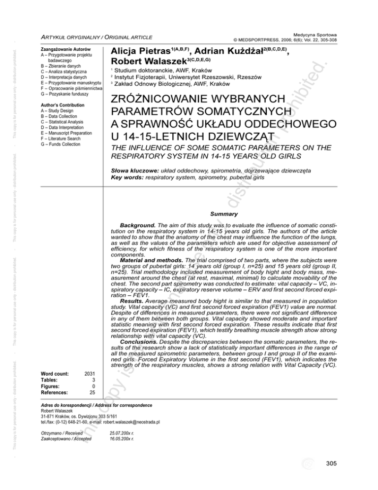 - 2 3 ZRÓ¯NICOWANIE WYBRANYCH PARAMETRÓW SOMATYCZNYCH A SPRAWNOŒÆ UK£ADU ODDECHOWEGO U 14-15-LETNICH DZIEWCZ¥T Author’s Contribution A – Study Design B – Data Collection C – Statistical Analysis D – Data Interpretation E – Manuscript Preparation F – Literature Search G – Funds Collection THE INFLUENCE OF SOME SOMATIC PARAMETERS ON THE RESPIRATORY SYSTEM IN 14-15 YEARS OLD GIRLS ibu -d istr S³owa kluczowe: uk³ad oddechowy, spirometria, dojrzewaj¹ce dziewczêta Key words: respiratory system, spirometry, pubertal girls nly Summary 2031 3 0 25 op Word count: Tables: Figures: References: y is - for pe rs on al us This copy is for personal use only - distribution prohibited. - eo Background. The aim of this study was to evaluate the influence of somatic constitution on the respiratory system in 14-15 years old girls. The authors of the article wanted to show that the anatomy of the chest may influence the function of the lungs, as well as the values of the parameters which are used for objective assessment of efficiency, for which fitness of the respiratory system is one of the more important components. Material and methods. The trial comprised of two parts, where the subjects were two groups of pubertal girls: 14 years old (group I, n=25) and 15 years old (group II, n=25). Trial methodology included measurement of body hight and body mass, measurement around the chest (at rest, maximal, minimal) to calculate movability of the chest. The second part spirometry was conducted to estimate: vital capacity – VC, inspiratory capacity – IC, expiratory reserve volume – ERV and first second forced expiration – FEV1. Results. Average measured body hight is similar to that measured in population study. Vital capacity (VC) and first second forced expiration (FEV1) value are normal. Despite of differences in measured parameters, there were not significant difference in any of them between both groups. Vital capacity showed moderate and important statistic meaning with first second forced expiration. These results indicate that first second forced expiration (FEV1), which testify breathing muscle strength show strong relationship with vital capacity (VC). Conclusions. Despite the discrepancies between the somatic parameters, the results of the research show a lack of statistically important differences in the range of all the measured spirometric parameters, between group I and group II of the examined girls. Forced Expiratory Volume in the first second (FEV1), which indicates the strength of the respiratory muscles, shows a strong relation with Vital Capacity (VC). Th is c Adres do korespondencji / Address for correspondence Robert Walaszek 31-871 Kraków, os. Dywizjonu 303 5/161 tel./fax: (0-12) 648-21-60, e-mail: [email protected] Otrzymano / Received Zaakceptowano / Accepted 25.07.200x r. 16.05.200x r. - This copy is for personal use only - distribution prohibited. Studium doktoranckie, AWF, Kraków Instytut Fizjoterapii, Uniwersytet Rzeszowski, Rzeszów Zak³ad Odnowy Biologicznej, AWF, Kraków tio np roh ibit This copy is for personal use only - distribution prohibited. 1 This copy is for personal use only - distribution prohibited. - Alicja Pietras1(A,B,F), Adrian Ku¿d¿a³2(B,C,D,E), Robert Walaszek3(C,D,E,G) Zaanga¿owanie Autorów A – Przygotowanie projektu badawczego B – Zbieranie danych C – Analiza statystyczna D – Interpretacja danych E – Przygotowanie manuskryptu F – Opracowanie piœmiennictwa G – Pozyskanie funduszy ed . Medycyna Sportowa © MEDSPORTPRESS, 2006; 6(6); Vol. 22, 305-308 ARTYKU£ ORYGINALNY / ORIGINAL ARTICLE 305 z gimnazjów krakowskich. Do badañ zakwalifikowano tylko osoby zdrowe (na podstawie karty zdrowia dziecka) i systematycznie uczestnicz¹ce w zajêciach wychowania fizycznego. Spoœród nich ¿adna nie bra³a udzia³u w dodatkowych zajêciach sportowych. Badania wykonano w dwóch etapach. Pierwszy obejmowa³ pomiar parametrów somatycznych, wykorzystuj¹c standardowy zestaw antropometryczny. Zmierzono wysokoœæ i masê cia³a oraz obwody klatki piersiowej (spoczynkowy, maksymalny, minimalny). Na podstawie uzyskanych wartoœci obliczono ruchomoœæ klatki piersiowej (RKP). W drugim etapie dokonano badania spirometrycznego, podczas którego okreœlono: pojemnoœæ ¿yciow¹ p³uc (VC), pojemnoœæ wdechow¹ (IC), objêtoœæ wydechow¹ zapasow¹ (ERV) i maksymaln¹ pojemnoœæ wydechow¹ jednosekundow¹ (FEV1). Wykorzystano w tym celu aparat abcPNEUMOmini produkcji krajowej. W przebiegu badania uwzglêdniono temperaturê otoczenia, ciœnienie i wilgotnoœæ powietrza atmosferycznego. Badani przystêpowali do badañ w³aœciwych po uprzednim instrukta¿u, pokazie i badaniu próbnym. tio np roh ibit ibu -d istr nly eo al on pe rs Materia³ i metody y is for Badaniom poddano dwie grupy dziewcz¹t (skompletowane na zasadzie dobrowolnoœci z zachowaniem anonimowoœci) w okresie pokwitania: grupê I stanowi³o 25 dziewcz¹t 14-letnich, a II – 25 dziewcz¹t 15-letnich. Kryterium ostatecznego podzia³u stanowi³ wiek kalendarzowy, a nie klasa szkolna, do której uczêszcza³y badane. Obie grupy rekrutowa³y siê Th is c op Tab. 1. Wysokoœæ i masa cia³a badanych dziewcz¹t Tab. 1. Body height and body weight of the studing girls 306 Wyniki W grupie I badanych dziewcz¹t œrednia wysokoœæ cia³a wynosi³a 160,2 cm, a œrednia masa cia³a 43,5 kg. Grupa 15-latek mierzy³a i wa¿y³a œrednio, odpowiednio, 162,2 cm i 50,2 kg (Tab. 1). Wysokoœæ i masa cia³a reprezentatywnej grupy dzieci i m³odzie¿y œrodowiska krakowskiego kszta³tuj¹ siê na ogó³ poni¿ej poziomu charakterystycznego dla innych du¿ych miast polskich. Jednak od ok. 14 r. ¿. ró¿nice miêdzy badanymi grupami zanikaj¹ (wiêksza zmiennoœæ wyników w grupie m³odszej). Analiza porównawcza badanych dziewcz¹t wykaza³a natomiast, ¿e œrednie arytmetyczne wysokoœci cia³a s¹ zbli¿one do wartoœci uzyskanych w badaniach Chrzanowskiej [16]. Œrednie o