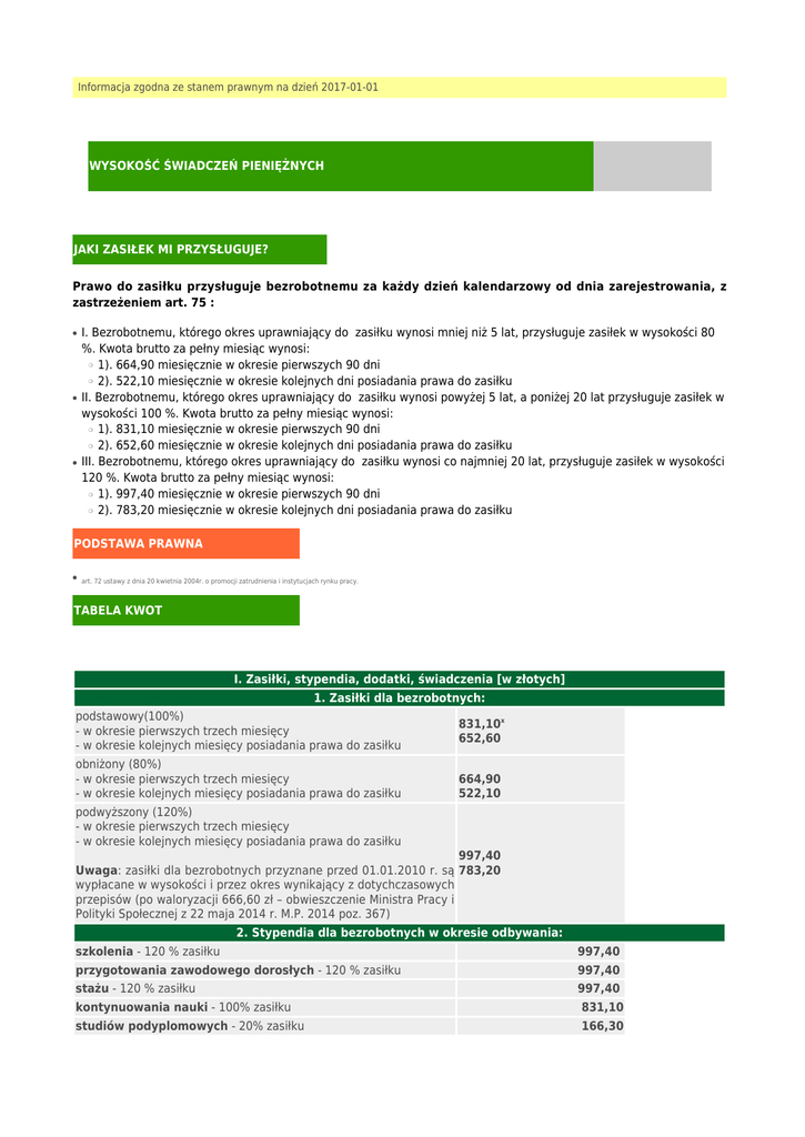 Informacja zgodna ze stanem prawnym na dzień 2017-01-01 WYSOKOŚĆ ŚWIADCZEŃ PIENIĘŻNYCH JAKI ZASIŁEK MI PRZYSŁUGUJE? Prawo do zasiłku przysługuje bezrobotnemu za każdy dzień kalendarzowy od dnia zarejestrowania, z zastrzeżeniem art. 75 : ● I. Bezrobotnemu, którego okres uprawniający do zasiłku wynosi mniej niż 5 lat, przysługuje zasiłek w wysokości 80 %. Kwota brutto za pełny miesiąc wynosi: 1). 664,90 miesięcznie w okresie pierwszych 90 dni 2). 522,10 miesięcznie w okresie kolejnych dni posiadania prawa do zasiłku II. Bezrobotnemu, którego okres uprawniający do zasiłku wynosi powyżej 5 lat, a poniżej 20 lat przysługuje zasiłek w wysokości 100 %. Kwota brutto za pełny miesiąc wynosi: 1). 831,10 miesięcznie w okresie pierwszych 90 dni 2). 652,60 miesięcznie w okresie kolejnych dni posiadania prawa do zasiłku III. Bezrobotnemu, którego okres uprawniający do zasiłku wynosi co najmniej 20 lat, przysługuje zasiłek w wysokości 120 %. Kwota brutto za pełny miesiąc wynosi: 1). 997,40 miesięcznie w okresie pierwszych 90 dni 2). 783,20 miesięcznie w okresie kolejnych dni posiadania prawa do zasiłku ❍ ❍ ● ❍ ❍ ● ❍ ❍ PODSTAWA PRAWNA ● art. 72 ustawy z dnia 20 kwietnia 2004r. o promocji zatrudnienia i instytucjach rynku pracy. TABELA KWOT I. Zasiłki, stypendia, dodatki, świadczenia [w złotych] 1. Zasiłki dla bezrobotnych: podstawowy(100%) - w okresie pierwszych trzech miesięcy - w okresie kolejnych miesięcy posiadania prawa do zasiłku obniżony (80%) - w okresie pierwszych trzech miesięcy - w okresie kolejnych miesięcy posiadania prawa do zasiłku 831,10x 652,60 664,90 522,10 podwyższony (120%) - w okresie pierwszych trzech miesięcy - w okresie kolejnych miesięcy posiadania prawa do zasiłku 997,40 Uwaga: zasiłki dla bezrobotnych przyznane przed 01.01.2010 r. są 783,20 wypłacane w wysokości i przez okres wynikający z dotychczasowych przepisów (po waloryzacji 666,60 zł – obwieszczenie Ministra Pracy i Polityki Społecznej z 22 maja 2014 r. M.P. 2014 poz. 367) 2. Stypendia dla bezrobotnych w okresie odbywania: szkolenia - 120 % zasiłku 997,40 przygotowania zawodowego dorosłych - 120 % zasiłku 997,40 stażu - 120 % zasiłku 997,40 kontynuowania nauki - 100% zasiłku 831,10 studiów podyplomowych - 20% zasiłku 166,30 3. Dodatek aktywizacyjny (do 50% zasiłku) Dla osób, które w okresie posiadania prawa do zasiłku dla bezrobotnych, podjęły zatrudnienie lub inną pracę zarobkową 415,60 4. Refundacja kosztów opieki nad dzieckiem lub osoba zależną (do 50 % zasiłku) Bezrobotnemu posiadającemu co najmniej jedno dziecko do 6 roku życia lub niepełnosprawne do 18 roku życia – w przypadku 415,60 podjęcia zatrudnienia, innej pracy zarobkowej, szkolenia, stażu lub przygotowania zawodowego dorosłych 5. Świadczenie z tytułu wykonywania prac społecznie użytecznych Osobie wykonującej prace społecznie użyteczne min. 8,10/godz. Zasiłki i świadczenia nie zostały zwaloryzowane od 1 czerwca 2016 r. ponieważ średnioroczny wskaźnik wzrostu cen towarów i usług konsumpcyjnych ogółem w 2015 r. w stosunku do 2014 r , wyniósł 99,4%. Od zasiłku dla bezrobotnych powiatowe urzędy pracy opłacają składki na ubezpieczenie emerytalne i rentowe w łącznej wysokości - 27,52 %x, a od stypendiów za okres odbywania szkolenia, stażu lub przygotowania zawodowego dorosłych, dodatkowo na ubezpieczenie wypadkowe - 0,9 %, tj. w łącznej wysokości - ok. 28,4 % - kwotę składki na ubezpieczenia wypadkowe PUP oblicza stopą procentową obowiązującą go w danym roku składkowym. II. Maksymalne kwoty, jakie mogą byc refundowane z Funduszu Pracy pracodawcom z tytułu zatrudnienia skierowanego bezrobotnego (miesięcznie - w zł.) w ramach: 1. prac interwencyjnych (refundacja wynagrodzenia, nagród i składek na ubezpieczenia społeczne) - w pełnym wymiarze czasu pracy (831,10 + 149,60 *) 980,70 - w pełnym wymiarze - refundacja za co drugi miesiąc od kwoty minimalnego wynagrodzenia (2.000,00 + 360,00*) Uwaga: do zawartych przed 01.01.2010r. umów o zorganizowanie prac interwencyjnych należy przyjmować wysokość refundacji określoną w zawartej umowie, przez cały okres jej trwania. 2.360,00 2. robót publicznych - refundacja za każdy miesiąc [50 % przec. wynagrodzenia + składki na ubezpieczenia społeczne od wynagrodzenia podlegającego 2.392,47 refundacji - (2.027,52 + 346,95*], - refundacja za co drugi miesiąc [100 % przec. wynagrodzenia + 4.784,95 składki (4.055,04 + 729,91*] 3. Jednorazowa refundacja pracodawcy kosztów opłacenia składek na ubezpieczenia społeczne - za zatrudnionego przez okres co najmniej 12 miesięcy 6.000,00 bezrobotnego (do 300 % minimalnego wynagrodzenia) 4. Refundacja za prace społecznie użyteczne (60% świadczenia) Pracodawcy organizującemu prace społeczne użyteczne max 4,86/za godz 5. Jednorazowa premia po przygotowaniu zawodowym dorosłych - (art. 53j ustawy) za każdy pełny miesiąc programu 483,30 6. Premia za zatrudnienie bezrobotnego do 30 roku życia - który otrzymał bon stażowy 1513,50 */ składki opłacane przez pracodawcę w wysokości ok. 18 %; kwota zarówno składki na ubezpieczenie społeczne jak też łączna kwota podlegająca refundacji z Funduszu Pracy - uzależniona jest od wysokości składki na ubezpieczenie wypadkowe płaconej przez pracodawcę, która jest zróżnicowana (od 0,67 % do 3,60 % lub inna ustalona przez ZUS) Refundacji na ubezpieczenie wypadkowe podlega kwota w wysokości faktycznie opłaconej od refundowanego wynagrodzenia. III. Środki na podjęcie działalności gospodarczej oraz wyposażenie stanowiska pracy dla bezrobotnego oraz pożyczka na sfinansowanie kosztów szkolenia - z Funduszu Pracy. 1.Przyznanie bezrobotnemu środków na podjęcie działalności gospodarczej a) działalności samodzielnej (do 600 % przeciętnego wynagrodzenia) 24.330,24 b) w ramach tworzonej spółdzielni socjalnej (do 400 % 16.220,16 przeciętn