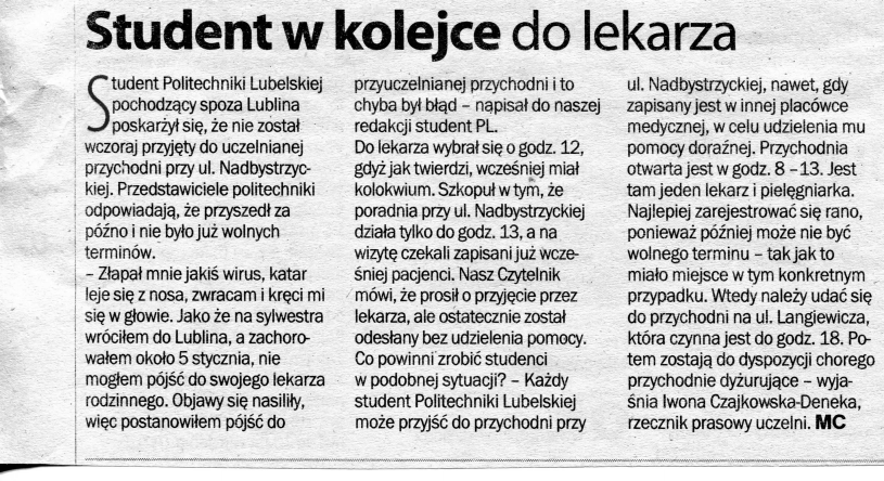 Student w kolejce do lekarza S przyuczelnianej przychodni i to chyba byt W^d - napisat do naszej redakcji student PL Do lekarza wybrat siQ o godz. 12, gdyzjaktwierdzi, wczesniej mial kolokwium. Szkopul w tym, ze poradnia przy ul. Nadbystrzyckiej dziaia tyiko do godz. 13, a na wizytQ czekali zapisani juz wczeterm i now. sniej pacjenci. Nasz C^elnik - Ztapal mnie jakis wirus, katar !eje siQ z nosa, zwracam i krQci mi mowi, ze prosit o przyjQcie przez siQ w gtowie. Jako ze na sylwestra lekarza, ale ostatecznie zostal wrocitem do Lublina, a zachoro- odesteny bez udzielenia pomocy. Co powinni zrobic studenci watem okolo 5 stycznia, nie moglem pojsc do swojego lekarza w podobnej sytuacji? - Kazdy student Politechniki Lubelskiej rodzinnego. ObjawysiQ nasilily, moze przyjsc do przychodni przy wiQC postanowilem pojsc do tudent Politechniki Lubelskiej pochodz^cy spoza Lublina poskarzyl siQ, ze nie zostal wczoraj przyjQty do uczelnianej przychodni piTy ul. Nadbystrzyckiej. Przedstawiciele politechniki odpowiadaj^, ze przyszedt za pozno i nie byto juz wolnych ul. Nadbystrzyckiej, nawet, gdy zapisany jest w innej placowce medycznej, w celu udzielenia mu pomocy doraznej. Przychodnia otwarta jest w godz. 8 -13. Jest tarn jeden lekarz i pielQgniarka. Najlepiej zarejestrowac siQ rano, poniewaz pozniej moze nie bye wolnego terminu - tak jak to mialo miejsce w tym konkretnym , przypadku. Wtedy nalezy udac siQ do przychodni na uL Langiewicza, ktora czynna jest do godz. 18. Potem zostaj^ do dyspozycji chorego przychodnle dyzuruj^ce - wyjasnia Iwona Czajkowska-Deneka, rzecznik prasowy uczelni. MC