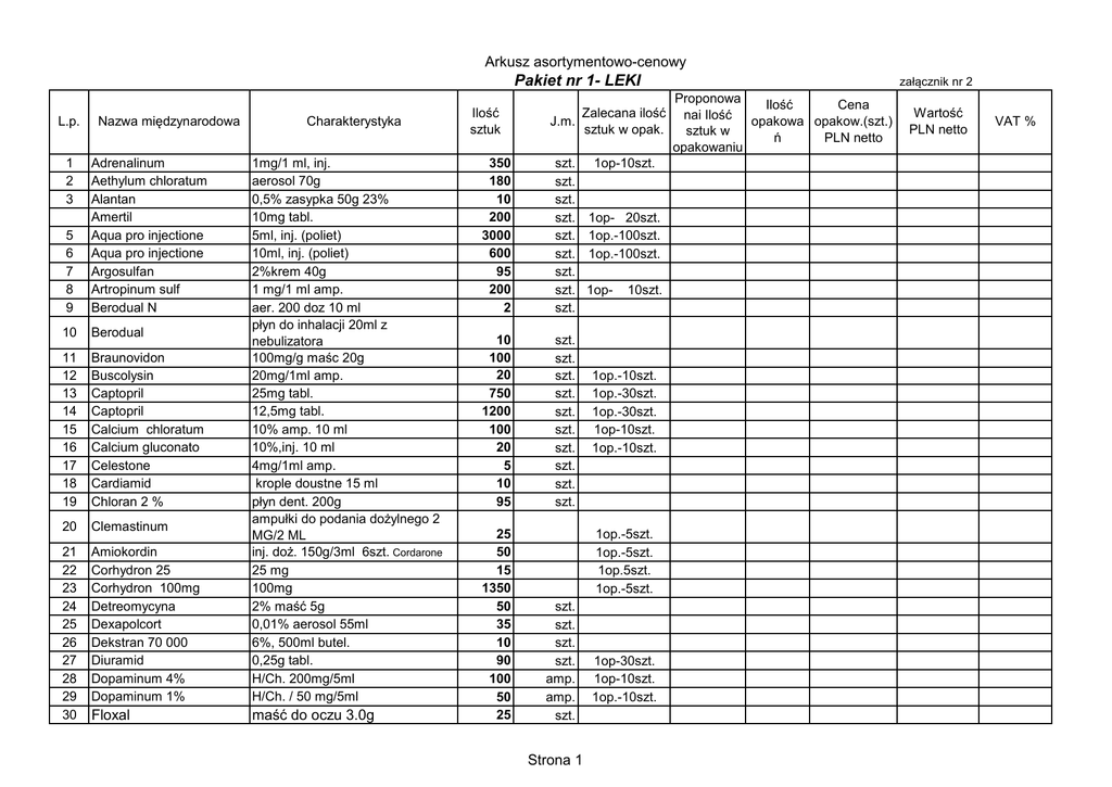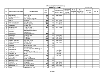 Arkusz asortymentowo-cenowy Pakiet nr 1- LEKI L.p. 1 2 3 Nazwa międzynarodowa Charakterystyka 5 6 7 8 9 Adrenalinum Aethylum chloratum Alantan Amertil Aqua pro injectione Aqua pro injectione Argosulfan Artropinum sulf Berodual N 10 Berodual 11 12 13 14 15 16 17 18 19 Braunovidon Buscolysin Captopril Captopril Calcium chloratum Calcium gluconato Celestone Cardiamid Chloran 2 % 20 Clemastinum 21 22 23 24 25 26 27 28 29 30 Amiokordin Corhydron 25 Corhydron 100mg Detreomycyna Dexapolcort Dekstran 70 000 Diuramid Dopaminum 4% Dopaminum 1% 1mg/1 ml, inj. aerosol 70g 0,5% zasypka 50g 23% 10mg tabl. 5ml, inj. (poliet) 10ml, inj. (poliet) 2%krem 40g 1 mg/1 ml amp. aer. 200 doz 10 ml płyn do inhalacji 20ml z nebulizatora 100mg/g maśc 20g 20mg/1ml amp. 25mg tabl. 12,5mg tabl. 10% amp. 10 ml 10%,inj. 10 ml 4mg/1ml amp. krople doustne 15 ml płyn dent. 200g ampułki do podania dożylnego 2 MG/2 ML inj. doż. 150g/3ml 6szt. Cordarone 25 mg 100mg 2% maść 5g 0,01% aerosol 55ml 6%, 500ml butel. 0,25g tabl. H/Ch. 200mg/5ml H/Ch. / 50 mg/5ml Floxal maść do oczu 3.0g Ilość sztuk 350 180 10 200 3000 600 95 200 2 10 100 20 750 1200 100 20 5 10 95 25 50 15 1350 50 35 10 90 100 50 25 Proponowa Ilość Cena Zalecana ilość nai Ilość J.m. opakowa opakow.(szt.) sztuk w opak. sztuk w ń PLN netto opakowaniu szt. 1op-10szt. szt. szt. szt. 1op- 20szt. szt. 1op.-100szt. szt. 1op.-100szt. szt. szt. 1op- 10szt. szt. szt. szt. szt. szt. szt. szt. szt. szt. szt. szt. 1op.-10szt. 1op.-30szt. 1op.-30szt. 1op-10szt. 1op.-10szt. 1op.-5szt. 1op.-5szt. 1op.5szt. 1op.-5szt. szt. szt. szt. szt. amp. amp. szt. Strona 1 1op-30szt. 1op-10szt. 1op.-10szt. załącznik nr 2 Wartość PLN netto VAT % 31 32 33 34 35 36 37 38 39 40 41 42 43 44 45 20 mg/2 ml, inj. 40mg tabl. 5% 500ml 20 % 10ml, inj. smak pomarańczowy 1% (10mg/g) krem 15g 0,16% syrop 250g 100mg/2ml,inj. maść 1,2J./G 20G płyn 20 g tabl.100 100mg/2ml amp. 10% aer. 38g 2% żel typu U 30g 2% żel typu A 30g 54 55 56 57 58 59 60 61 Furosemidum Furosemidum Glucosum Glucosum Glukoza płynna Hydrocortisonum Hydroxyzinum Hydroxyzinum Iruxol mono Jodyna 3 % Kaladyum Ketonal Lidocain Lignocainum h/chlor Lignocainum h/chlor Lignocainum h/chlor.z noradr.2% Lignocainum h/chlor. Linomag maść Mentowal Metocard Metoclopramidum Metronidazol 0,5% Natrium bicarbonicum 8,4% Natrium chloratum Natrium chloratum Natrium chloratum Natrium chloratum Natrium chloratum Neomycinum Neomycinum Neospasmina 62 Nitromint 0,4mg/doze aerosol 11g(200 DOZ) 63 64 65 Galospa No-spa Oxycort 40mg tabl. 40 mg/2 ml. inj. aerosol 55ml 46 47 48 49 50 51 52 53 2%, 2 ml, inj. 2%, 2 ml, inj. 30g 65% krople 5g 50mg tabl. 10mg.tabl 100 ml inj, doż. 20ml amp. 0,9%, 5 ml inj. 0,9% 10 ml inj. 10%, 10ml inj. 0,9% but. stojąca 500ml 0,9% but. stojąca 250ml 6,8 mg/ml. aerosol 55ml 0,5% maść do oczu 3g syrop 150g 225 450 50 120 50 5 30 35 10 10 500 250 20 200 150 amp. 1op-5szt. szt. 1op.-30szt. fiol. amp. 1op.-10szt. sasz. 1op.-10szt. szt. szt. amp. 1 op.-5szt. szt. szt. tabl. 1op.-100szt. amp. 1 op-10szt. szt. szt. szt. 50 7000 30 10 300 150 200 amp. amp. szt. szt. szt. szt. szt. 1op-10szt. 1op.-10szt. 150 10.000 30 500 120 95 160 50 10 amp. amp. szt. szt. szt. szt. szt. szt. szt. 1op-10szt. 1op-100szt. 1op.-10szt. 1op-100szt. 40 300 100 110 szt. szt. szt. szt. Strona 2 1op.-30szt. 1op.-50szt. 1op.-20szt. 1op.-5szt. maść do oczu 3g 4,63% aerosol 130ml 20 mg/1 ml, 2 ml amp. 0,5g tabl. 0,1g/2ml amp. 300mg tabl. 40mg tabl. 91 92 93 Oxycort “A” Panthenol Papaverinum h/chlor. Paracetamol Phenazolinum Polopiryna S Propranolol Płyn Fizj.Wieloelektrol. Izot. Pulmicort zawiesina do inhalacji z nebulizatora Pyralginum Pyralginum Sachol stomatologiczny Salbutamol WZF Silol 350 F Solcoseryl Solcoseryl Solcoseryl Solcoseryl Sol gentianae (roztwór spirytusowy 2 % Sol gentianae (roztwór spirytusowy 1 % Sorbonit Theospirex Poltram Biotrombina 400 j.m.DST.miejsc Ventolin płyn do inhalacji z nebulizatora 0,2% Vit 500mg Vitacon Xylocaine 94 Ostenisept z atomizerem płyn 250ml 95 96 Ostenisept Kalium hypermangan. płyn 1000ml 1op-5g 66 67 68 69 70 71 72 73 74 75 76 77 78 79 80 81 82 83 84 85 86 87 88 89 90 500ml butel. 125 mg/ml op. 20 poj.a' 2 ml 2,5g/5ml amp. 0,5g tabl. żel d/j. ust 10g 0,5 mg /ml.inj. aerosol 100 ml pasta dentystyczna 5g 4,15 mg/g żel 20g 2,07 mg/g maść 20g 20% żel do oczu 5g 20 ml 20 ml 10 mg tabl. 20 ml 100mg/2ml amp. 400 jm, inj.+ rozp. 2mg/ml 500mg/5ml amp. 10mg/ml amp. 2% 50ml. fiol. 15 15 120 400 200 240 300 szt. szt, szt, szt, szt, szt, szt, 1op.-10szt. 1op.-20szt. 1op.-10szt. 1op.-20szt. 1op.-50szt. 70 szt, . 6 100 240 15 100 15 25 15 25 5 szt. amp. szt. szt. amp. szt. szt. szt. szt. szt. 10 litr 5 600 10 20 litr szt szt. szt. 1op-60szt. 1op-5szt. 1op-5szt. 25 szt. 1op.-5szt. 60 20 20 250 amp. szt. szt. szt. 1op.-20szt. 1op-10szt. 1op.-10szt. 1op -5szt. 15 5 15 szt. szt. op. Strona 3 1op-5szt. 1op-6szt. 1op.-10szt. 97 98 Gaziki jałowe nasączone ajkoholem do dezynfekcji, sóry i ran Torecan wym: 120mmx40mm 6,5 mg/ml amp. RAZEM: 9000 10 szt. 1op.-100szt. szt. 1op.-5szt. …………………………………………………………………………………………………… (podpis i pieczętka osoby (osób) upowaznionej(ych) do reprezentowania Wykonawcy) Strona 4 Wartość w PLN brutto Strona 5 Strona 6 Strona 7 ykonawcy) Strona 8