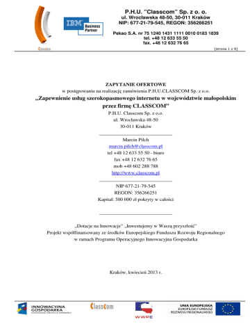 P.H.U. ”Classcom” Sp. z o. o. ul. Wrocławska 48-50, 30-011 Kraków NIP: 677-21-79-545, REGON: 356266251 Pekao S.A. nr 75 1240 1431 1111 0010 0183 1839 tel. +48 12 633 55 50 fax. +48 12 632 76 65 [strona 1 z 9] ZAPYTANIE OFERTOWE w postępowaniu na realizację zamówienia P.H.U.CLASSCOM Sp. z o.o. „Zapewnienie usług szerokopasmowego internetu w województwie małopolskim przez firmę CLASSCOM” P.H.U. Classcom Sp. z o.o. ul. Wrocławska 48-50 30-011 Kraków _____________________________ Marcin Pilch [email protected] tel +48 12 633 55 50 - biuro fax +48 12 632 76 65 mob +48 602 288 788 http://www.classcom.pl _____________________________ NIP 677-21-79-545 REGON: 356266251 Kapitał: 500 000 zł pokryty w całości _____________________________ „Dotacje na Innowacje” „Inwestujemy w Waszą przyszłość” Projekt współfinansowany ze środków Europejskiego Funduszu Rozwoju Regionalnego w ramach Programu Operacyjnego Innowacyjna Gospodarka Kraków, kwiecień 2013 r. P.H.U. ”Classcom” Sp. z o. o. ul. Wrocławska 48-50, 30-011 Kraków NIP: 677-21-79-545, REGON: 356266251 Pekao S.A. nr 75 1240 1431 1111 0010 0183 1839 tel. +48 12 633 55 50 fax. +48 12 632 76 65 [strona 2 z 9] 1. Zamawiający P.H.U. Classcom Sp. z o.o. ul. Wrocławska 48-50 30-011 Kraków 2. Tryb udzielenia zamówienia Postępowanie prowadzone jest z zachowaniem zasady równego traktowania, uczciwej konkurencji, efektywności, jawności i przejrzystości. Do zapytania mają zastosowanie przepisy Kodeksu Cywilnego (Dz.U. 1964r Nr 16 poz. 93 ze zm). 3. Informacje ogólne Zamówienie jest realizowane w ramach projektu: „Zapewnienie dostępu do Internetu w województwie małopolskim przez firmę "CLASSCOM” w ramach działania 8.4. „Zapewnienie dostępu do Internetu na etapie „ostatniej mili” osi priorytetowej 8. „Społeczeństwo informacyjne – zwiększenie innowacyjności gospodarki” Programu Operacyjnego Innowacyjna Gospodarka 2007-2013. 4. Opis przedmiotu zamówienia Przedmiotem zamówienia, które ma zostać wykonane w wyniku wyboru najkorzystniejszej oferty, jest wykonanie kompleksowych prac projektowych i budowlano-montażowych dla sieci szerokopasmowej (w tym uzyskanie wszelkich zgód, opracowanie dokumentacji projektowej, budowa, zapewnienie dostawy towarów i świadczenia usług zgodnie ze specyfikacją przedstawioną w Tabeli nr 1 poniżej) składającej się z części światłowodowej: węzła internetowego, infrastruktury FTTH (napowietrznej, ziemnej, budynkowej), szkieletu oraz baz dostępowych. Sieć szerokopasmowa funkcjonować będzie w województwie małopolskim na obszarze miejscowości w powiecie wielickim, sklasyfikowanych, jako „białe plamy” na mapie informatycznej: Powiat Wielicki Gmina Wieliczka Biskupice Miejscowość Byszyce, Dobranowice, Gorzków, Grajów, Jankówka, Koźmice Małe, Pawlikowice, Podstolice, Rożnowa, Siercza, Sygneczów Bodzanów, Przebieczany, Sułów, Szczygłów, Tomaszkowice, Biskupice P.H.U. ”Classcom” Sp. z o. o. ul. Wrocławska 48-50, 30-011 Kraków NIP: 677-21-79-545, REGON: 356266251 Pekao S.A. nr 75 1240 1431 1111 0010 0183 1839 tel. +48 12 633 55 50 fax. +48 12 632 76 65 [strona 3 z 9] Aby zapewnić użytkownikom szerokopasmowy internet w w/w miejscowościach konieczne jest wykonanie infrastruktury przesyłowej w Krakowie-Podgórzu, Wieliczce, Grabówkach, Mietniowie i Raciborsku w celu dostarczenia sygnału internetowego z węzła komunikacyjnego do obszarów świadczenia usługi. Hurtowym punktem dystrybucji sygnału internetowego będzie ACK Cyfronet w Krakowie, ul. Wielicka. Sygnał internetowy zostanie przekazany za pośrednictwem gotowej kanalizacji teletechnicznej (Kraków, Wieliczka) oraz budowanych linii napowietrznych (Wieliczka, Grabówki, Mietniów, Raciborsko) najkrótszą drogą do sieci dostępowych. Zamawiający wytypował już obszary dogodne pod względem technicznym dla zlokalizowania sieci szkieletowej, jak również węzła internetowego dla części światłowodowej sieci. Poglądowy schemat sieci umieszczono w załączniku nr 1 (mapa) do niniejszego zapytania. 5. Przedmiot zapytania ofertowego (przedmiot zamówienia) Prace objęte niniejszym zapytaniem ofertowym obejmują: 5.1. W zakresie projektowania i budowy sieci światłowodowej prace obejmują w szczególności: a) Przeprowadzenie niezbędnych wizji technicznych – (inwentaryzacja do celów projektowych). b) Opracowanie koncepcji przebiegu sieci światłowodowej FTTH na obszarze inwestycji. c) Przygotowanie dokumentacji formalnoprawnej i technicznej niezbędnej do realizacji zamówienia, uzyskania odpowiednich zgód, zezwoleń i uzgodnień a w tym: ˗ zakup map i wypisów, ˗ uzyskanie zgód właścicieli działek , ˗ wykonanie pełnej dokumentacji projektowej, ˗ rejestracja/zgłoszenie inwestycji w odpowiednich organach urzędowych. 5.2. Zakup i montaż infrastruktury technicznej niezbędnej do realizacji przedsięwzięcia, w następującej ilości (Tabela nr 1): Towary oraz roboty budowlane i montażowe objęte zapytaniem Liczba jednostek ADAPTER SC/APC JEDNOMODOWY, SIMPLEX, CERAMICZNA FERRULA 408.00 ADSS KABEL SM 24F*09/125 G.652D PE 2T12F 4000N SPAN 80-100M 19100.00 ADSS KABEL SM 24F*09/125 G.652D PE 4T6F 4000N SPAN 80-100M 61638.00 ADSS KABEL SM 48F*09/125 G.652D PE 4T12F 4000N SPAN 80-100M 1297.00 GNIAZDO ABONENCKIE NATYNKOWE VFTO-A LUB VTFO-B 1- PORTOWE Z ADAPTEREM SC/APC SX, BEZ PIGTAILA 1157.00 P.H.U. ”Classcom” Sp. z o. o. ul. Wrocławska 48-50, 30-011 Kraków NIP: 677-21-79-545, REGON: 356266251 Pekao S.A. nr 75 1240 1431 1111 0010 0183 1839 tel. +48 12 633 55 50 fax. +48 12 632 76 65 [strona 4 z 9] KASETA ŚWIATŁOWODOWA DLA 12 WŁÓKIEN Z OCHRANIACZEM DO PRZEŁĄCZNIC 34.00 OSŁONKA SPAWÓW TERMOKURCZLIWA 45mm 3017.00 PATCHCORD 2,5M 09/125 SM SCA/SCA G657A 2,8MM SIMPLEX GOLD 1253.00 PIGTAIL 2M 09/125 SM SC/APC G652 0,9MM ŻÓŁTY BUFFER STANDARD 408.00 PIGTAIL 1m 09/125 SM ITU652CD SC/APC BUFFOR 900um 1157.00 PLC Spliter steelbox 900mm 