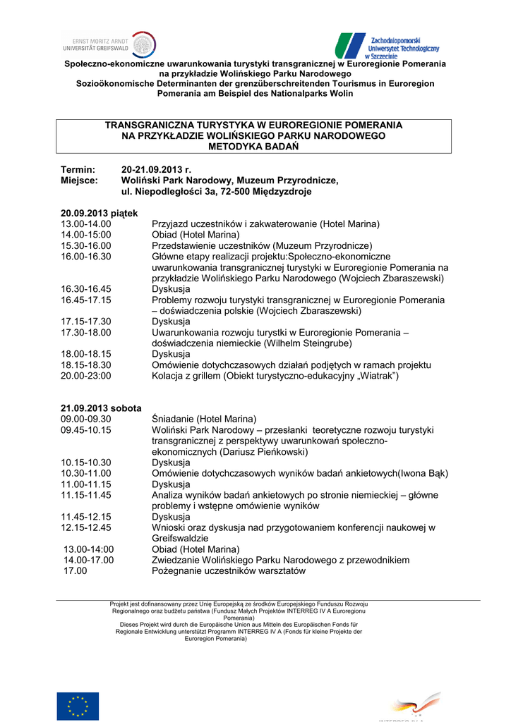 Społeczno-ekonomiczne uwarunkowania turystyki transgranicznej w Euroregionie Pomerania na przykładzie Wolińskiego Parku Narodowego Sozioökonomische Determinanten der grenzüberschreitenden Tourismus in Euroregion Pomerania am Beispiel des Nationalparks Wolin TRANSGRANICZNA TURYSTYKA W EUROREGIONIE POMERANIA NA PRZYKŁADZIE WOLIŃSKIEGO PARKU NARODOWEGO METODYKA BADAŃ Termin: Miejsce: 20-21.09.2013 r. Woliński Park Narodowy, Muzeum Przyrodnicze, ul. Niepodległości 3a, 72-500 Międzyzdroje 20.09.2013 piątek 13.00-14.00 14.00-15:00 15.30-16.00 16.00-16.30 16.30-16.45 16.45-17.15 17.15-17.30 17.30-18.00 18.00-18.15 18.15-18.30 20.00-23:00 21.09.2013 sobota 09.00-09.30 09.45-10.15 10.15-10.30 10.30-11.00 11.00-11.15 11.15-11.45 11.45-12.15 12.15-12.45 13.00-14:00 14.00-17.00 17.00 Przyjazd uczestników i zakwaterowanie (Hotel Marina) Obiad (Hotel Marina) Przedstawienie uczestników (Muzeum Przyrodnicze) Główne etapy realizacji projektu:Społeczno-ekonomiczne uwarunkowania transgranicznej turystyki w Euroregionie Pomerania na przykładzie Wolińskiego Parku Narodowego (Wojciech Zbaraszewski) Dyskusja Problemy rozwoju turystyki transgranicznej w Euroregionie Pomerania – doświadczenia polskie (Wojciech Zbaraszewski) Dyskusja Uwarunkowania rozwoju turystki w Euroregionie Pomerania – doświadczenia niemieckie (Wilhelm Steingrube) Dyskusja Omówienie dotychczasowych działań podjętych w ramach projektu Kolacja z grillem (Obiekt turystyczno-edukacyjny „Wiatrak”) Śniadanie (Hotel Marina) Woliński Park Narodowy – przesłanki teoretyczne rozwoju turystyki transgranicznej z perspektywy uwarunkowań społecznoekonomicznych (Dariusz Pieńkowski) Dyskusja Omówienie dotychczasowych wyników badań ankietowych(Iwona Bąk) Dyskusja Analiza wyników badań ankietowych po stronie niemieckiej – główne problemy i wstępne omówienie wyników Dyskusja Wnioski oraz dyskusja nad przygotowaniem konferencji naukowej w Greifswaldzie Obiad (Hotel Marina) Zwiedzanie Wolińskiego Parku Narodowego z przewodnikiem PoŜegnanie uczestników warsztatów Projekt jest dofinansowany przez Unię Europejską ze środków Europejskiego Funduszu Rozwoju Regionalnego oraz budŜetu państwa (Fundusz Małych Projektów INTERREG IV A Euroregionu Pomerania) Dieses Projekt wird durch die Europäische Union aus Mitteln des Europäischen Fonds für Regionale Entwicklung unterstützt Programm INTERREG IV A (Fonds für kleine Projekte der Euroregion Pomerania) Społeczno-ekonomiczne uwarunkowania turystyki transgranicznej w Euroregionie Pomerania na przykładzie Wolińskiego Parku Narodowego Sozioökonomische Determinanten der grenzüberschreitenden Tourismus in Euroregion Pomerania am Beispiel des Nationalparks Wolin DER GRENZÜBERSCHREITENDE TOURISMUS AM BEISPIEL DES NATIONALPARKS WOLIN IN DER EUROREGION POMERANIA FORSCHUNG METHODE Termin: Ort: 20-21.09.2013 Woliński Park Narodowy, Muzeum Przyrodnicze, ul. Niepodległości 3a, 72-500 Międzyzdroje 20.09.2013 Freitag 13:00-14:00 14:00-15:00 15:30-16:00 16:00-16:30 16:30-16:45 16:45-17:15 17:15-17:30 17:30-18:00 18:00-18:15 18:15-18:30 20:00-23:00 Ankunft der Teilnehmer und Beziehen der Unterkünfte (Hotel Marina) Mittagessen (Hotel Marina) Vorstellung der Teilnehmer (Muzeum Przyrodnicze) Wichtigste Etappen des Projektes: Sozioökonomische Determinanten des grenzüberschreitenden Tourismus in der Euroregion Pomerania, am Beispiel des Nationalparks Wolin (Wojciech Zbaraszewski ) Diskussion Probleme und Herausforderungen bei der Entwicklung des grenzüberschreitenden Tourismus in der Euroregion Pomerania – Erfahrungen auf der polnischen Seite (Wojciech Zbaraszewski) Diskussion Determinanten der grenzüberschreitenden Entwicklung des Tourismus in der Euroregion Pomerania - die Erfahrungen auf der deutschen Seite (Wilhelm Steingrube) Diskussion Vorstellen und Erläutern der bereits durchgeführten Aktivitäten im Rahmen des Projekts Abendessen mit gemütlichem beisammensein (grillen) – (Obiekt turystyczno-edukacyjny „Wiatrak”) 21.09.2013 Samstag 09:00-09:30 Frühstück (Hotel Marina) 09:45-10:15 Wolin National Park - theoretische Prämissen der grenzüberschreitenden Entwicklung des Tourismus, aus der sozioökonomischen Perspektive (Dariusz Pieńkowski) 10:15-10:30 Diskussion 10:30-11:00 Analyse der Ergebnisse der Umfrage auf polnischer Seite (Iwona Bąk) 11:00-11:15 Diskussion 11:15 -11:45 Analyse der Ergebnisse der Umfrage auf deutscher Seite 11:45-12:15 Diskussion 12:15-12:45 Fazit und Diskussion über die Vorbereitung einer wissenschaftlichen Konferenz in Greifswald 13:00-14:00 Mittagessen (Hotel Marina) 14:00-17:00 Besuch des Wolinski Nationalpark mit deutschsprachigem Reiseleiter 17:00 Verabschiedung Projekt jest dofinansowany przez Unię Europejską ze środków Europejskiego Funduszu Rozwoju Regionalnego oraz budŜetu państwa (Fundusz Małych Projektów INTERREG IV A Euroregionu Pomerania) Dieses Projekt wird durch die Europäische Union aus Mitteln des Europäischen Fonds für Regionale Entwicklung unterstützt Programm INTERREG IV A (Fonds für kleine Projekte der Euroregion Pomerania) Społeczno-ekonomiczne uwarunkowania turystyki transgranicznej w Euroregionie Pomerania na przykładzie Wolińskiego Parku Narodowego Sozioökonomische Determinanten der grenzüberschreitenden Tourismus in Euroregion Pomerania am Beispiel des Nationalparks Wolin Miejsce/Ort: Muzeum Przyrodnicze Wolińskiego Parku Narodowego ul. Niepodległości 3a, 72-500 Międzyzdroje Hotel/Hotel: Hotel Marina (100 m od/von Muzeum Przyrodniczego) ul. Gryfa Pomorskiego 1, 72-500 Międzyzdroje http://www.marinahotel.az.pl Kolacja/Abendessen: Obiekt turystyczno-edukacyjny „Wiatrak” (550 m od/von Muzeum Przyrodniczego) ul. Leśna 15, 72-500 Międzyzdroje Kontakt/Ansprechpartner: Wojciech Zbaraszewski ZUT w Szczecinie, Wydział Ekonomiczny ul. Janickiego 31, 71-270 Szczecin [email protected] Tel +48 506 836 245 Projekt jest dofinansowany przez Unię Europejską ze środków Europejs
