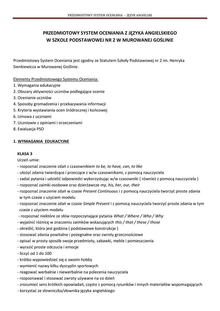 PRZEDMIOTOWY SYSTEM OCENIANIA - JĘZYK ANGIELSKI PRZEDMIOTOWY SYSTEM OCENIANIA Z JĘZYKA ANGIELSKIEGO W SZKOLE PODSTAWOWEJ NR 2 W MUROWANEJ GOŚLINIE Przedmiotowy System Oceniania jest zgodny ze Statutem Szkoły Podstawowej nr 2 im. Henryka Sienkiewicza w Murowanej Goślinie. Elementy Przedmiotowego Systemu Oceniania: 1. Wymagania edukacyjne 2. Obszary aktywności uczniów podlegające ocenie 3. Ocenianie uczniów 4. Sposoby gromadzenia i przekazywania informacji 5. Kryteria wystawiania ocen śródrocznej i koocowej 6. Umowa z uczniami 7. Uczniowie z opiniami i orzeczeniami 8. Ewaluacja PSO 1. WYMAGANIA EDUKACYJNE KLASA 3 Uczeo umie: - rozpoznad znaczenie zdao z czasownikiem to be, to have, can, to like - ułożyd zdania twierdzące i przeczące z w/w czasownikami, z pomocą nauczyciela - zadad pytania i udzielid odpowiedzi wykorzystując w/w czasowniki ( również z pomocą nauczyciela ) - rozpoznad zaimki osobowe oraz dzierżawcze my, his, her, our, their - rozpoznad znaczenie zdao w czasie Present Continuous i z pomocą nauczyciela tworzyd proste zdania w tym czasie z użyciem modelu - rozpoznad znaczenie zdao w czasie Simple Present i z pomocą nauczyciela tworzyd proste zdania w tym czasie z użyciem modelu - rozpoznad niektóre ze słów rozpoczynające pytania What / Where / Who / Why - wyjaśnid różnicę w znaczeniu zaimków wskazujących this / that / these / those - określid, która jest godzina ( podstawowe konstrukcje ) - stosowad zdania powitalne i pożegnalne oraz zwroty grzecznościowe - opisad w prosty sposób swoje przedmioty, zabawki, meble i pomieszczenia - wyrazid proste odczucia i emocje - liczyd od 1 do 100 - krótko wypowiedzied się o swoim hobby - wymienid nazwy kilku dyscyplin sportowych - reagowad werbalnie i niewerbalnie na polecenia nauczyciela - rozpoznawad i stosowad zwroty używane na co dzieo - zrozumied sens krótkich opowiadao, często z pomocą rysunków i innych materiałów wspomagających - korzystad ze słowniczka/słownika języka angielskiego PRZEDMIOTOWY SYSTEM OCENIANIA - JĘZYK ANGIELSKI - wypowiadad się po polsku na wybrane tematy kulturowe ( angielskie święta, tradycje, obyczaje ) - śpiewad piosenki zawarte w podręczniku - korzystad z CD-ROMu dołączonego do podręcznika English Adventure 3 KLASA 4 Gramatyka Uczeo: - posługuje się liczbami od 1 do 100 - posługuje się przedimkami nieokreślonymi a / an oraz liczbą mnogą w odniesieniu do osób i przedmiotów w klasie - pyta o numer telefonu - podaje numer telefonu - posługuje się alfabetem angielskim - literuje wyrazy - posługuje się zaimkami osobowymi i dzierżawczymi oraz dopełniaczem ’s - używa czasownika to be w zdaniach twierdzących, przeczących i pytających - określa, co posiadają różne osoby - stosuje have got / has got w odniesieniu do osób i zwierząt - posługuje się przymiotnikami do opisu przedmiotów - pyta o godzinę, podaje czas - posługuje się czasem Present Simple w odniesieniu do codziennych czynności oraz ulubionych zajęd - stosuje przyimki at, in i on dla określenia czasu - określa położenie sprzętów i przedmiotów posługując się przyimkami miejsca - posługuje się konstrukcją There is / There are dla określenia położenia przedmiotów i miejsc - posługuje się can / can’t w odniesieniu do swoich umiejętności oraz umiejętności innych osób Słownictwo Uczeo: - przedstawia się - wita się i żegna - zwraca się uprzejmie do różnych osób, stosując odpowiednie tytuły - nazywa przedmioty znajdujące się w klasie - nazywa kolory - pyta o nazwy przedmiotów i o znaczenie wyrazów - wydaje polecenia dotyczące zachowania w klasie i reaguje na nie - nazywa wybrane kraje - nazywa członków rodziny - nazywa dni tygodnia - pyta o adres, zapisuje i podaje adres - nazywa kontynenty, oceany, rzeki, góry, pustynie; podaje ich położenie - prezentuje swoją rodzinę - nazywa urządzenia elektroniczne - nazywa zwierzątka domowe - nazywa przedmioty szkolne - wypowiada się na temat planu lekcji - nazywa niektóre części ciała ludzi I zwierząt - prezentuje swoją szkołę PRZEDMIOTOWY SYSTEM OCENIANIA - JĘZYK ANGIELSKI - nazywa meble i inne sprzęty w pokoju - nazywa codzienne czynności i zajęcia wykonywane w wolnym czasie - przedstawia różne sposoby spędzania wolnego czasu - nazywa pomieszczenia w domu oraz elementy wyposażenia - nazywa miejsca i budynki w mieście, określa ich położenie za pomocą przyimków - opisuje pomieszczenia w domu - nazywa dyscypliny sportowe - nazywa instrumenty muzyczne - posiada wiedzę kulturową o wybranych elementach życia w Wielkiej Brytanii, przedstawionych w podręczniku Steps in English 1 KLASA 5 Gramatyka Uczeo: - zna i stosuje czasownik have got w formach osobowych i różnych typach zdao - potrafi odmienid przez osoby czasowniki be. Zna zasadę tworzenia zdao pytajacych, przeczących oraz udzielania odpowiedzi zadanych od tych czasowników - potrafi tworzyd podstawowe zdania twierdzące, pytające i przeczące w czasie teraźniejszym Simple Present; wie kiedy używa się tego czasu i zna przysłówki częstotliwości - potrafi tworzyd podstawowe zdania twierdzące, pytające i przeczące w czasie Present Continuous; wie kiedy używa się tego czasu - potrafi rozpoznawad podstawowe wypowiedzi w czasie przeszłym Simple Past; wie kiedy używa się tego czasu; tworzy formy regularne i zna nieregularne formy czasowników - zna zaimki osobowe i dzierżawcze, potrafi je przetłumaczyd na język polski i poprawnie użyd w zdaniu - wie jak tworzy się liczbę mnogą rzeczowników, rozpoznaje podstawowe wyjątki - używa czasownika modalnego can wyrażającego umiejętności - zna wyrażenie would like to - rozróżnia grupy rzeczowników policzalnych i niepoliczalnych - wie co to jest przedimek nieokreślony a / an i zna zasady jego użycia - wie kiedy używamy przedimka określonego the oraz spójnika because - rozpoznaje zwroty określające ilośd przedmiotów some / any / a li
