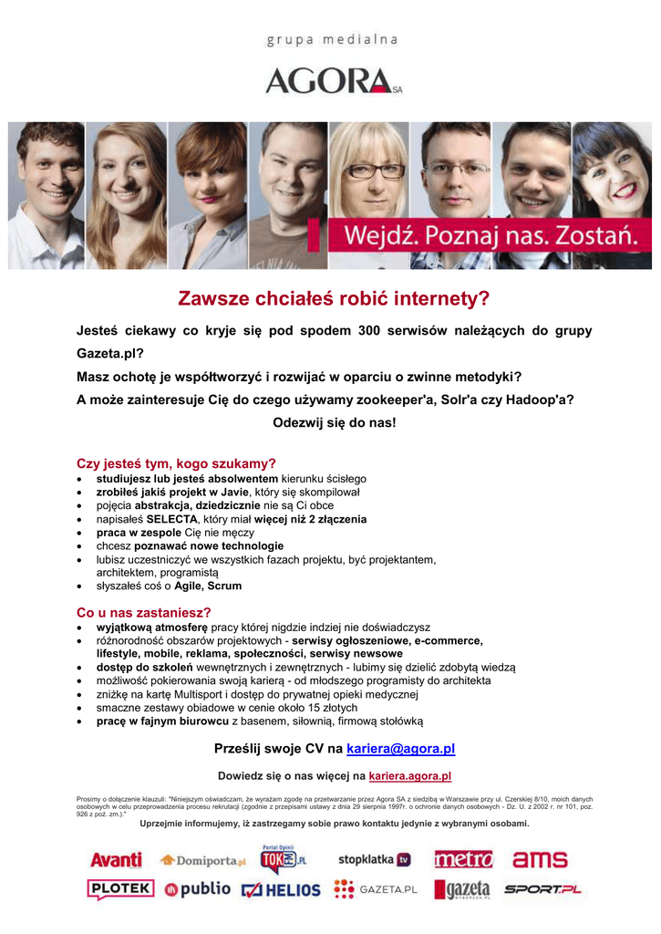 Zawsze chciałeś robić internety? Jesteś ciekawy co kryje się pod spodem 300 serwisów należących do grupy Gazeta.pl? Masz ochotę je współtworzyć i rozwijać w oparciu o zwinne metodyki? A może zainteresuje Cię do czego używamy zookeeper'a, Solr'a czy Hadoop'a? Odezwij się do nas! Czy jesteś tym, kogo szukamy? studiujesz lub jesteś absolwentem kierunku ścisłego zrobiłeś jakiś projekt w Javie, który się skompilował pojęcia abstrakcja, dziedzicznie nie są Ci obce napisałeś SELECTA, który miał więcej niż 2 złączenia praca w zespole Cię nie męczy chcesz poznawać nowe technologie lubisz uczestniczyć we wszystkich fazach projektu, być projektantem, architektem, programistą słyszałeś coś o Agile, Scrum Co u nas zastaniesz? wyjątkową atmosferę pracy której nigdzie indziej nie doświadczysz różnorodność obszarów projektowych - serwisy ogłoszeniowe, e-commerce, lifestyle, mobile, reklama, społeczności, serwisy newsowe dostęp do szkoleń wewnętrznych i zewnętrznych - lubimy się dzielić zdobytą wiedzą możliwość pokierowania swoją karierą - od młodszego programisty do architekta zniżkę na kartę Multisport i dostęp do prywatnej opieki medycznej smaczne zestawy obiadowe w cenie około 15 złotych pracę w fajnym biurowcu z basenem, siłownią, firmową stołówką Prześlij swoje CV na [email protected] Dowiedz się o nas więcej na kariera.agora.pl Prosimy o dołączenie klauzuli: "Niniejszym oświadczam, że wyrażam zgodę na przetwarzanie przez Agora SA z siedzibą w Warszawie przy ul. Czerskiej 8/10, moich danych osobowych w celu przeprowadzenia procesu rekrutacji (zgodnie z przepisami ustawy z dnia 29 sierpnia 1997r. o ochronie danych osobowych - Dz. U. z 2002 r. nr 101, poz. 926 z poź. zm.)." Uprzejmie informujemy, iż zastrzegamy sobie prawo kontaktu jedynie z wybranymi osobami.