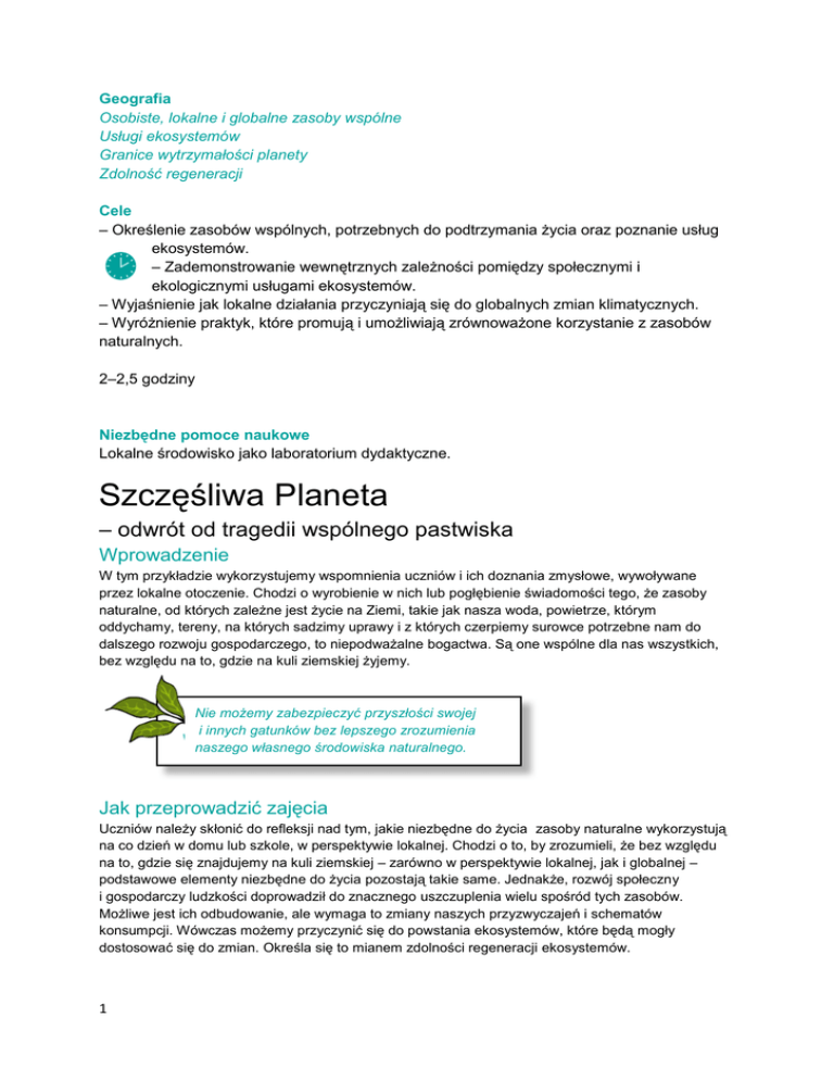 Geografia Osobiste, lokalne i globalne zasoby wspólne Usługi ekosystemów Granice wytrzymałości planety Zdolność regeneracji Cele – Określenie zasobów wspólnych, potrzebnych do podtrzymania życia oraz poznanie usług ekosystemów. – Zademonstrowanie wewnętrznych zależności pomiędzy społecznymi i ekologicznymi usługami ekosystemów. – Wyjaśnienie jak lokalne działania przyczyniają się do globalnych zmian klimatycznych. – Wyróżnienie praktyk, które promują i umożliwiają zrównoważone korzystanie z zasobów naturalnych. 2–2,5 godziny Niezbędne pomoce naukowe Lokalne środowisko jako laboratorium dydaktyczne. Szczęśliwa Planeta – odwrót od tragedii wspólnego pastwiska Wprowadzenie W tym przykładzie wykorzystujemy wspomnienia uczniów i ich doznania zmysłowe, wywoływane przez lokalne otoczenie. Chodzi o wyrobienie w nich lub pogłębienie świadomości tego, że zasoby naturalne, od których zależne jest życie na Ziemi, takie jak nasza woda, powietrze, którym oddychamy, tereny, na których sadzimy uprawy i z których czerpiemy surowce potrzebne nam do dalszego rozwoju gospodarczego, to niepodważalne bogactwa. Są one wspólne dla nas wszystkich, bez względu na to, gdzie na kuli ziemskiej żyjemy. Nie możemy zabezpieczyć przyszłości swojej i innych gatunków bez lepszego zrozumienia naszego własnego środowiska naturalnego. Jak przeprowadzić zajęcia Uczniów należy skłonić do refleksji nad tym, jakie niezbędne do życia zasoby naturalne wykorzystują na co dzień w domu lub szkole, w perspektywie lokalnej. Chodzi o to, by zrozumieli, że bez względu na to, gdzie się znajdujemy na kuli ziemskiej – zarówno w perspektywie lokalnej, jak i globalnej – podstawowe elementy niezbędne do życia pozostają takie same. Jednakże, rozwój społeczny i gospodarczy ludzkości doprowadził do znacznego uszczuplenia wielu spośród tych zasobów. Możliwe jest ich odbudowanie, ale wymaga to zmiany naszych przyzwyczajeń i schematów konsumpcji. Wówczas możemy przyczynić się do powstania ekosystemów, które będą mogły dostosować się do zmian. Określa się to mianem zdolności regeneracji ekosystemów. 1 Poniższe karty zadaniowe pomogą uczniom dokładnie zrozumieć najważniejsze założenia następujących koncepcji: wspólne bogactwa indywidualne, lokalne i globalne, usługi ekosystemów, granice wytrzymałości planety oraz zdolność regeneracji ekosystemu. Karta zadaniowa nr 1 Odkrywamy, co jest nam samym niezbędne do przetrwania Jest to zadanie do wykonania na zewnątrz. Uczniowie odnotowują doznania, które wywołuje lokalne otoczenie. Spisują jak działa ono na ich zmysł wzroku, powonienia, słuchu, dotyku. Uczniowie powinni następnie wyjaśnić, dlaczego na co dzień potrzebują takich zasobów naturalnych jak powietrze, woda, energia i pożywienie. Powinni zastanowić się wspólnie, czy takie same potrzeby mają ludzie mieszkający w innych częściach świata oraz kto jest właścicielem tych zasobów na poziomie lokalnym i globalnym. Karta zadaniowa nr 2 Aby zrozumieć usługi ekosystemów i granice wytrzymałości planety Przy pomocy modeli “Ja i moje potrzeby w butelce” oraz ”Ziemia w butelce” można wyjaśnić granice wytrzymałości planety. Uczniowie mogą przedyskutować zagrożenia dla wspólnych zasobów naturalnych, analizując wybrane zdjęcia. Karta zadaniowa nr 3 Co ty możesz zrobić dla poprawy sytuacji, włączając w to zmianę klimatu? To zadanie skłania uczniów do zastanowienia się nad tym, jak mogą zaangażować się w działania, które promują zrównoważone wykorzystanie zasobów przez jednostki oraz grupy, takie jak ich klasa, rodzina, społeczność. Chodzi o to, by zachęcić ich do aktywności i promowania zrównoważonego wykorzystywania niezbędnych do życia bogactw naturalnych w ich własnym otoczeniu. 2
