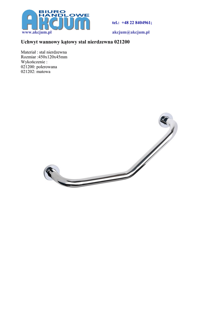 tel.: +48 22 8404961; www.akcjum.pl [email protected] Uchwyt wannowy kątowy stal nierdzewna 021200 Materiał : stal nierdzewna Rozmiar :450x120x45mm Wykończenie : 021200: polerowana 021202: matowa