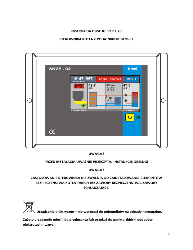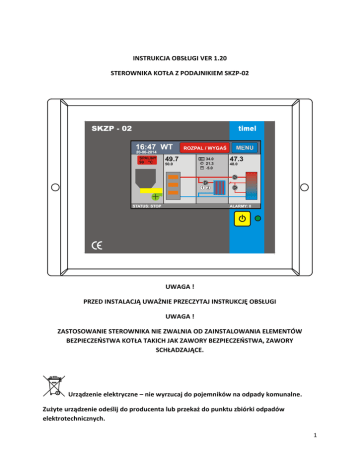 INSTRUKCJA OBSŁUGI VER 1.20 STEROWNIKA KOTŁA Z PODAJNIKIEM SKZP-02 UWAGA ! PRZED INSTALACJĄ UWAŻNIE PRZECZYTAJ INSTRUKCJĘ OBSŁUGI UWAGA ! ZASTOSOWANIE STEROWNIKA NIE ZWALNIA OD ZAINSTALOWANIA ELEMENTÓW BEZPIECZEŃSTWA KOTŁA TAKICH JAK ZAWORY BEZPIECZEŃSTWA, ZAWORY SCHŁADZAJĄCE. Urządzenie elektryczne – nie wyrzucaj do pojemników na odpady komunalne. Zużyte urządzenie odeślij do producenta lub przekaż do punktu zbiórki odpadów elektrotechnicznych. 1 SPIS TREŚCI Opis urządzenia oraz zastosowanie………………………………………………………………. 3 Instalacja …………………………………………………………………………………………………….. 4 Podstawowe zasady obsługi ………………………………………………………………………… 8 Palnik …………………………………………………………………………………………………………… 13 Kocioł ………………………………………………………………………………………………………….. 17 Układ ogrzewania (CO)………………………………………………………………………………….18 Układ ciepłej wody użytkowej (CWU) ………………………………………………….………. 24 Inne ustawienia …………………………………………………………………………………………... 26 Rozpalanie …………………………………………………………………………………………….……..27 Wygaszanie …………….…………………………………………………………………………….……..28 Kalibracja ekranu….….…………………………………………………………………………….……..28 Dane techniczne …………………………………………………………………………………………. 29 2 OPIS URZĄDZENIA ORAZ ZASTOSOWANIE Sterownik SKZP-02 jest uniwersalnym sterownikiem kotła z podajnikiem ślimakowym. Układ automatyzuje i nadzoruje proces spalania paliwa w kotle. Dodatkowo sterownik pozwala na kontrolę temperatury kotła, powrotu, temperatury obwodu centralnego ogrzewania (CO), temperatury ciepłej wody użytkowej (CWU), temperatury pokojowej oraz jest wyposażony w regulator pogodowy. Regulator jest nowoczesną konstrukcją wyposażony między innymi w wydajny 32 bitowy mikroprocesor ARM, kolorowy, dotykowy ekran o przekątnej 4,3 cala, układ synchronizacji załączania odbiorników z siecią zasilającą, intuicyjny interfejs użytkownika. Cechy układu: nowoczesny interfejs dotykowy z kolorowym wyświetlaczem 4,3 cala szybki procesor ARM dokładny pomiar temperatur realizowany 12 bitowym przetwornikiem ADC pomiar temperatury spalin za pomocą sondy PT-1000 (opcja) wbudowany regulator temperatury pokojowej (opcja) wbudowany regulator pogodowy (opcja) możliwość sterowania zaworem mieszającym w układzie CO funkcja ochrony temperatury powrotu nadzór CWU z priorytetem lub bez priorytetu licznik spalonego paliwa płynne sterowanie wentylatorem nadmuchu sterowanie dwoma pompami CO oraz pompą CWU sterowanie pompą cyrkulacyjną CWU wbudowane programy czasowe do sterowania temperaturą pokojową i CWU oraz pompą cyrkulacyjną zapisywanie historii zdarzeń wbudowany tryb instalatora, zabezpieczający przed niepowołanym dostępem płynna modulacja mocy palnika w zależności od zapotrzebowania na ciepło nieulotna pamięć nastaw i parametrów graficzny rejestrator parametrów pracy do 12 godzin wstecz 3 INSTALACJA UWAGA ! PRZED PRZYSTĄPIENIEM DO INSTALACJI NALEŻY ODŁĄCZYĆ ZASILANIE STEROWNIKA - ISTNIEJE RYZYKO PORAŻENIA PRĄDEM ! PODŁĄCZENIA POWINNA DOKONYWAĆ OSOBA Z ODPOWIEDNIMI UPRAWNIENIAMI ELKTRYCZNYMI. PODŁĄCZENIE MECHANICZNE Sterownik jest dostarczany z metalowymi kątownikami umożliwiającymi montaż bezpośrednio na kotle. Przykręcamy sterownik do kotła za pomocą czterech blachowkrętów. PODŁĄCZENIE ELEKTRYCZNE PODŁĄCZENIE POMP, PODAJNIKA, DMUCHAWY Wszystkie odbiorniki podłączamy do odpowiednich wyjść w tylnej części sterownika. Zastosowano standardowe wyjścia typu C13 - C14 (tzw. Przewody komputerowe). 4 Jeśli Twoja pompa nie posiada przewodu z wtykiem C13, użyj standardowego przewodu komputerowego lub wykorzystaj dołączone wtyczki C14. Od strony pompy podłącz wg opisu kolorów przewodów: KOLORY PRZEWODÓW POMP: niebieski – N, brązowy – L, żółto-zielony - UZIEMIENIE CZUJNIKI: Dostarczone czujniki nie są przeznaczone do zanurzania w cieczach. Przy montażu należy zapewnić jak najlepszy styk metalowej końcówki czujnika z obiektem mierzonym. Można użyć miedzianej lub aluminiowej taśmy klejącej do zwiększenia średnicy czujnika. Czujnik kotła – umieszczamy w specjalnym otworze pomiarowym na kotle. Otwór pomiarowy najczęściej umiejscowiony jest w górnej części kotła przy wyjściu wody zasilającej. To najważniejszy czujnik w całym systemie, dlatego należy upewnić się, że jest prawidłowo zainstalowany. Prawidłowo zainstalowany czujnik kotła. Powierzchnia czujnika przylega do ścianek kieszeni. Użyto miedzianej taśmy, nawiniętej na czujnik. Czujnik temperatury podajnika – umieszczamy na podajniku ślimakowym. Często podajniki mają dedykowaną kieszeń pomiarową, wtedy umieszczamy czujnik w kieszeni. Ten czujnik kontroluje temperaturę podajnika, Jeśli temperatura jest wyższa od 70 °C, to podajnik zostaje uruchomiony na 15 minut, aby wypchnąć żar w kierunku paleniska. Zapobiega to możliwości zapalenia się paliwa w zasobniku. Jednocześnie zgłaszany jest alarm „Przegrzanie podajnika”. Podczas przegrzania sterownik wchodzi w tryb WYGASZANIE i po 15 minutach pracy podajnika przechodzi do trybu STOP. Czujnik ciepłej wody użytkowej (CWU) - umieszczamy w kieszeni pomiarowej zasobnika ciepłej wody. Czujnik PT-1000 (czujnik temperatury spalin) – 