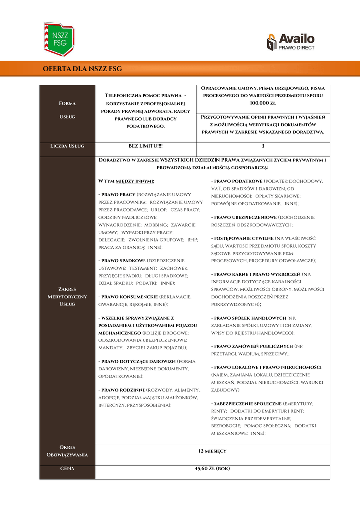 OFERTA DLA NSZZ FSG Opracowanie umowy, pisma urzędowego, pisma Forma Usług Telefoniczna pomoc prawna - procesowego do wartości przedmiotu sporu korzystanie z profesjonalnej 100.000 zł porady prawnej adwokata, radcy Przygotowywanie opinii prawnych i wyjaśnień prawnego lub doradcy z możliwością weryfikacji dokumentów podatkowego. Liczba Usług prawnych w zakresie wskazanego doradztwa. BEZ LIMITU!!!! 3 Doradztwo w zakresie WSZYSTKICH DZIEDZIN PRAWA związanych życiem prywatnym i prowadzoną działalnością gospodarczą: W tym między innymi: - prawo podatkowe (podatek: dochodowy, VAT, od spadków i darowizn, od - prawo pracy (rozwiązanie umowy przez pracownika; rozwiązanie umowy przez pracodawcę; urlop; czas pracy; - prawo ubezpieczeniowe (dochodzenie wynagrodzenie; mobbing; zawarcie roszczeń odszkodowawczych; delegacje; zwolnienia grupowe; BHP; sądu, wartość przedmiotu sporu, koszty - prawo spadkowe (dziedziczenie procesowych, procedury odwoławcze); sądowe, przygotowywanie pism - prawo karne i prawo wykroczeń (np. przyjęcie spadku; długi spadkowe; Usług - postępowanie cywilne (np. właściwość praca za granicą; inne); ustawowe; testament; zachowek, Merytoryczny podwójne opodatkowanie; inne); godziny nadliczbowe; umowy; wypadki przy pracy; Zakres nieruchomości; opłaty skarbowe; dział spadku; podatki; inne); informacje dotyczące karalności - prawo konsumenckie (reklamacje, dochodzenia roszczeń przez gwarancje, rękojmie, inne); pokrzywdzonych); - wszelkie sprawy związane z - prawo spółek handlowych (np. posiadaniem i użytkowaniem pojazdu zakładanie spółki, umowy i ich zmiany, mechanicznego (kolizje drogowe; wpisy do rejestru handlowego); sprawców, możliwości obrony, możliwości odszkodowania ubezpieczeniowe; - prawo zamówień publicznych (np. mandaty; zbycie i zakup pojazdu); przetargi, wadium, sprzeciwy); - prawo dotyczące darowizn (forma - prawo lokalowe i prawo nieruchomości darowizny, niezbędne dokumenty, opodatkowanie); (najem, zamiana lokalu, dziedziczenie - prawo rodzinne (rozwody, alimenty, zabudowy) mieszkań, podział nieruchomości, warunki adopcje, podział majątku małżonków, intercyzy, przysposobienia); - zabezpieczenie społeczne (emerytury; renty; dodatki do emerytur i rent; świadczenia przedemerytalne; bezrobocie; pomoc społeczna; dodatki mieszkaniowe; inne); Okres Obowiązywania CENA 12 miesięcy 45,60 ZŁ (rok) AVAILO - PRAWO DIRECT Dla funkcjonariuszy i pracowników straży granicznej SZANOWNI PAŃSTWO, odpowiadając na zapotrzebowanie środowiska funkcjonariuszy i pracowników straży granicznej nszz fsg wspólnie z availo sp. z o.o. przygotował specjalną ofertę produktu - usługa prawna mecenas direct. w każdej sytuacji, w której funkcjonariusz nie wie czy przysługują mu jakieś prawa, jakich świadczeń może oczekiwać, prowadzi spór z zakładem ubezpieczeń czy też urzędem, zmarł ktoś w rodzinie i trzeba uregulować kwestie majątkowe lub po prostu sprzedaje samochód i potrzebuje skonstruować umowę - będzie mógł skorzystać z pomocy prawnika. to znakomita propozycja dla pracowników oraz członków komisji zakładowych chcących zabezpieczyć swoje interesy. Oferta dla nszz fsg dotyczy wszelkich porad prawnych związanych z wykonywanym zawodem, życiem prywatnym oraz prowadzoną działalnością gospodarczą. INFORMACJI NA TEMAT USŁUGI UDZIELAJĄ: AVAILO SP. Z O.O: AGNIESZKA KOWALIK, m: +48 512 910 011, [email protected] JOANNA JURCZAK, m: +48 884 911 177, [email protected] KILKA SŁÓW O AVAILO misją availo jest upowszechnienie usług prawnych direct, w możliwie najniższej cenie, dzięki zastosowaniu najnowszych technologii telekomunikacyjnych oraz informatycznych, przy zachowaniu najwyższych standardów etycznych i stałym podnoszeniu kwalifikacji swoich pracowników. usługa wspomagana jest przez zastosowanie zaawansowanych technologicznie systemów informatycznych, dzięki którym możliwa jest natychmiastowa wymiana informacji. AVAILO TO dostępność. upowszechnienie usług prawnych w polsce, po cenie z góry znanej klientowi. innowacyjność. wprowadzanie nowych, skutecznych rozwiązań na polski rynek usług prawnych opartych na użyciu nowych technologii. profesjonalizm. najwyższa jakość usług świadczonych klientom przez wyspecjalizowanych prawników, radców prawnych i doradców podatkowych, najlepszych w swojej dziedzinie. skuteczność. szybka identyfikacja zagrożeń oraz sprawne rozwiązanie problemu, dzięki zastosowaniu własnych technologii informatycznych. indywidualne podejście do klienta. jasna i zrozumiała komunikacja z klientem w celu zapewnienia kompleksowej pomocy prawnej. uczciwość i rzetelność. rozwiązanie problemu od początku do końca przy zastosowaniu przejrzystego cennika oraz jasnych zasad korzystania z usług. STANDARDY ŚWIADCZENIA USŁUG Telefoniczna pomoc prawna - korzystanie z profesjonalnej porady prawnej adwokata, radcy prawnego lub doradcy podatkowego. W ramach porady w jednej sprawie nasz zespół prawny przeanalizuje sprawę oraz dokumenty potrzebne do udzielenia prawidłowej porady a będących w posiadaniu Klienta i wskaże: Forma Usług możliwe rozwiązania - jeśli prawo przewiduje ich kilka, najkorzystniejszy dla Klienta sposób rozwiązania problemu podstawy prawne – Klient dowie się, jakie przepisy odnoszą się do jego sprawy, instytucje prawne – organy/podmioty uprawnione/zobowiązane do podjęcia działań w danej sprawie; argumenty za i przeciw - podamy, jak bronić się przed ewentualnymi zarzutami drugiej strony, udostępnianie aktualnych i historycznych aktów prawnych wzory odpowiednich pism – BEZ LIMITU, odpowiedzi na pytania dodatkowe informacje o wysokości kosztów sądowych i procedurach w danej sprawie; informacje o właściwości sądów i innych organów w danej sprawie Opracowanie umowy, pisma urzędowego, pisma procesowego do określonej wartości przedmiotu sporu Przygotowywanie opinii prawnych i wyjaś