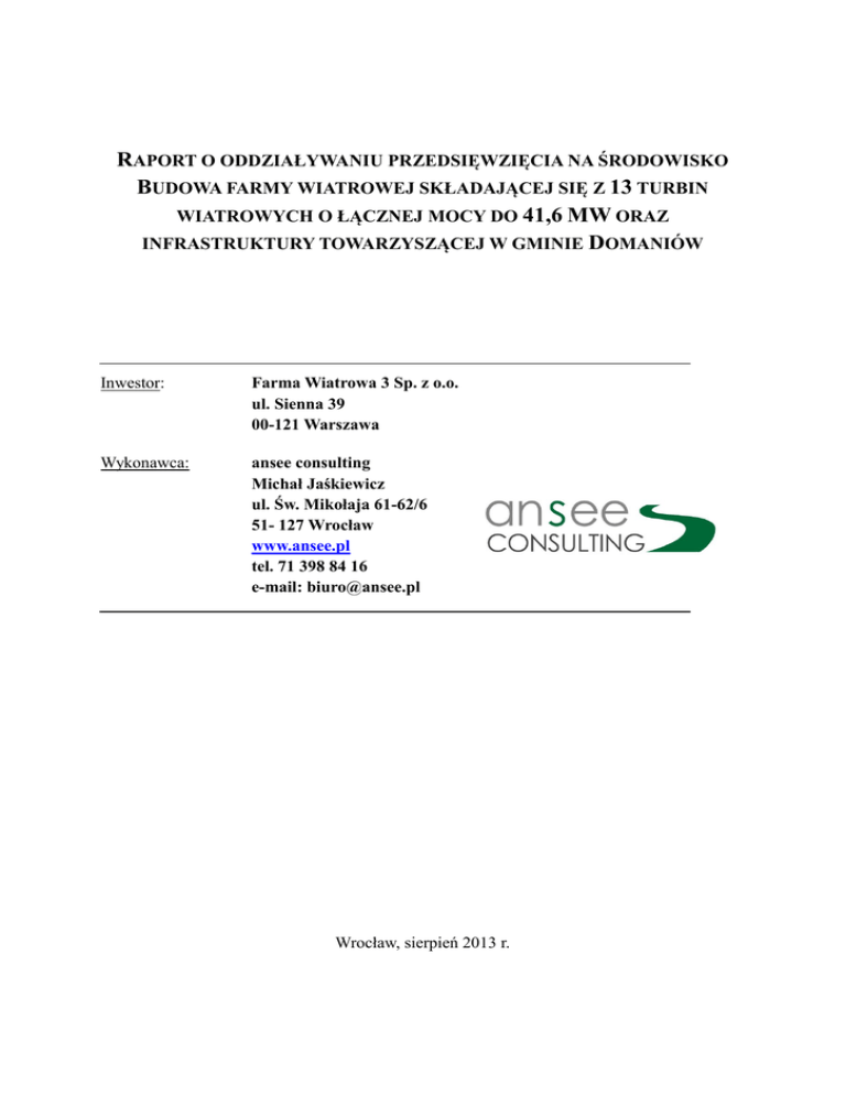 RAPORT O ODDZIAŁYWANIU PRZEDSIĘWZIĘCIA NA ŚRODOWISKO BUDOWA FARMY WIATROWEJ SKŁADAJĄCEJ SIĘ Z 13 TURBIN WIATROWYCH O ŁĄCZNEJ MOCY DO 41,6 MW ORAZ INFRASTRUKTURY TOWARZYSZĄCEJ W GMINIE DOMANIÓW Inwestor: Farma Wiatrowa 3 Sp. z o.o. ul. Sienna 39 00-121 Warszawa Wykonawca: ansee consulting Michał Jaśkiewicz ul. Św. Mikołaja 61-62/6 51- 127 Wrocław www.ansee.pl tel. 71 398 84 16 e-mail: [email protected] Wrocław, sierpień 2013 r. RAPORT O ODDZIAŁYWANIU PRZEDSIĘWZIĘCIA NA ŚRODOWISKO BUDOWA FARMY WIATROWEJ SKŁADAJĄCEJ SIĘ Z 13 TURBIN WIATROWYCH O ŁĄCZNEJ MOCY DO 41,6 MW ORAZ INFRASTRUKTURY TOWARZYSZĄCEJ W GMINIE DOMANIÓW ___________________________________________________________________________________________________________________________________________________________________________________________________________________________________________________________________________________________________________________________________________________________________________________________________________________________________________________________________________________________________________________________________________________________________________________________________________________________________________________________________________________________________________________________________________________________________________________________________________________________________________________________________________________________________________________________________________________________________________________________________________________________________________________________________________________________________________________________________________________________________________________________________________________________________________________________________________________________________________ Współautorzy: mgr Sylwia Cygan ochrona środowiska mgr inż. Kamil Drejer specjalista GIS, ochrona środowiska mgr Anna Haplicznik chiropterolog mgr Paweł Grochowski ornitolog Autor Raportu: ____________________ mgr Michał Roszyk kierownik projektu ochrona środowiska mgr Joanna Pomorska - Grochowska entomolog mgr Aleksandra Kolanek herpetolog mgr Katarzyna Kuraczycka botanik mgr Grzegorz Swacha botanik mgr Sebastian Świerszcz botanik mgr inż. Robert Szmigiel opracowanie kartograficzne Piotr Woźniak wizualizacje fotograficzne _______________________________________________________________________________________________________ ansee consulting www.ansee.pl ul. Św. Mikołaja 61-62/6 51-127 Wrocław Strona 2 z 211 RAPORT O ODDZIAŁYWANIU PRZEDSIĘWZIĘCIA NA ŚRODOWISKO BUDOWA FARMY WIATROWEJ SKŁADAJĄCEJ SIĘ Z 13 TURBIN WIATROWYCH O ŁĄCZNEJ MOCY DO 41,6 MW ORAZ INFRASTRUKTURY TOWARZYSZĄCEJ W GMINIE DOMANIÓW ___________________________________________________________________________________________________________________________________________________________________________________________________________________________________________________________________________________________________________________________________________________________________________________________________________________________________________________________________________________________________________________________________________________________________________________________________________________________________________________________________________________________________________________________________________________________________________________________________________________________________________________________________________________________________________________________________________________________________________________________________________________________________________________________________________________________________________________________________________________________________________________________________________________________________________________________________________________________________________ Spis treści: 1 Informacje wstępne ............................................................................................................... 13 1.1 Tytuł opracowania .......................................................................................................... 13 1.2 Informacje o Inwestorze ................................................................................................. 13 1.3 Podstawy i cel opracowania Raportu ............................................................................. 13 1.4 Zakres Raportu ............................................................................................................... 14 1.5 Główne założenia i cele budowy elektrowni wiatrowych .............................................. 19 1.6 Materiały wyjściowe ...................................................................................................... 21 1.6.1 Akty prawne ............................................................................................................ 21 1.1.1 Wykorzystane materiały .......................................................................................... 23 2 Opis projektowanego przedsięwzięcia .................................................................................. 27 2.1 Lokalizacja przedsięwzięcia ........................................................................................... 27 2.2 Ustalenia miejscowych planów zagospodarowania przestrzennego .............................. 29 2.3 Charakterystyka całego przedsięwzięcia i warunki użytkowania terenu w fazie budowy i eksploatacji oraz likwidacji ................................................................................................ 29 2.3.1 Podstawowe dane o przedsięwzięciu ...................................................................... 29 2.3.2 Warunki wykorzystania terenu 