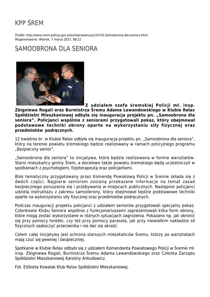 KPP ŚREM Źródło: http://www.srem.policja.gov.pl/w24/prewencja/124742,Samoobrona-dla-seniora.html Wygenerowano: Wtorek, 7 marca 2017, 08:12 SAMOOBRONA DLA SENIORA Z udziałem szefa śremskiej Policji mł. insp. Zbigniewa Rogali oraz Burmistrza Śremu Adama Lewandowskiego w Klubie Relax Spółdzielni Mieszkaniowej odbyła się inauguracja projektu pn. „Samoobrona dla seniora”. Policjanci wspólnie z seniorami przygotowali pokaz, który obejmował podstawowe techniki obrony oparte na wykorzystaniu siły fizycznej oraz przedmiotów podręcznych. 12 kwietnia br. w Klubie Relax odbyła się inauguracja projektu pn. „Samoobrona dla seniora”, który na terenie powiatu śremskiego będzie realizowany w ramach policyjnego programu „Bezpieczny senior”. „Samoobrona dla seniora” to inicjatywa, która będzie realizowana w formie warsztatów. Starsi mieszkańcy gminy Śrem, a docelowo także powiatu śremskiego będą uczestniczyli w spotkaniach z psychologiem, fizjoterapeutą oraz policjantami. Blok tematyczny przygotowany przez Komendę Powiatową Policji w Śremie składa się z dwóch części. Najpierw seniorom zostaną przekazane informacje na temat zasad bezpiecznego poruszania się i przebywania w miejscach publicznych. Następnie policjanci udzielą instruktażu z zakresu samoobrony, który obejmował będzie podstawowe techniki oparte na wykorzystaniu siły fizycznej oraz przedmiotów podręcznych. Podczas inauguracji projektu policjanci z udziałem seniorów przygotowali specjalny pokaz. Członkowie Klubu Seniora wspólnie z funkcjonariuszami zaprezentowali kilka form obrony, które mogą zostać wykorzystane w różnych sytuacjach zagrożenia. Pokazano np. jak obronić się przy pomocy torebki, czy też przy pomocy parasola, jak przy niewielkim nakładzie sił fizycznych zaskoczyć przeciwnika i nie dać się okraść. Celem całej inicjatywy jest ochrona starszych mieszkańców Śremu, którzy po warsztatach mają czuć się pewniej i bezpieczniej. Spotkanie w Klubie Relax odbyło się z udziałem Komendanta Powiatowego Policji w Śremie mł. insp. Zbigniewa Rogali, Burmistrza Śremu Adama Lewandowskiego oraz Członka Zarządu Spółdzielni Mieszkaniowej Karoliny Ankudowicz. Fot. Elżbieta Kowalak Klub Relax Spółdzielni Mieszkaniowej. Ocena: 0/5 (0) Tweetnij