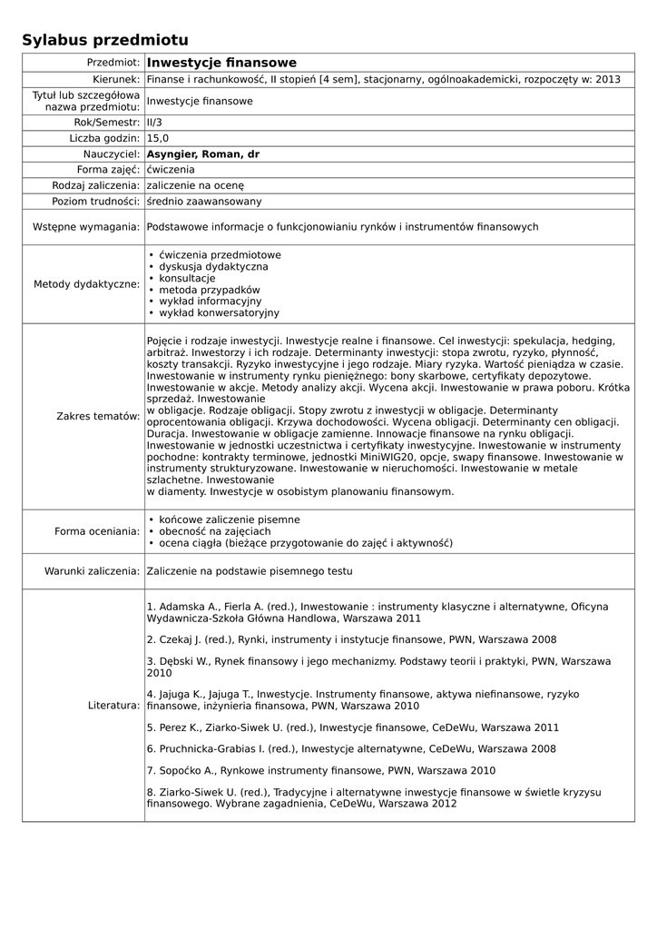 Sylabus przedmiotu Przedmiot: Inwestycje finansowe Kierunek: Finanse i rachunkowość, II stopień [4 sem], stacjonarny, ogólnoakademicki, rozpoczęty w: 2013 Tytuł lub szczegółowa Inwestycje finansowe nazwa przedmiotu: Rok/Semestr: II/3 Liczba godzin: 15,0 Nauczyciel: Asyngier, Roman, dr Forma zajęć: ćwiczenia Rodzaj zaliczenia: zaliczenie na ocenę Poziom trudności: średnio zaawansowany Wstępne wymagania: Podstawowe informacje o funkcjonowianiu rynków i instrumentów finansowych • • • Metody dydaktyczne: • • • ćwiczenia przedmiotowe dyskusja dydaktyczna konsultacje metoda przypadków wykład informacyjny wykład konwersatoryjny Pojęcie i rodzaje inwestycji. Inwestycje realne i finansowe. Cel inwestycji: spekulacja, hedging, arbitraż. Inwestorzy i ich rodzaje. Determinanty inwestycji: stopa zwrotu, ryzyko, płynność, koszty transakcji. Ryzyko inwestycyjne i jego rodzaje. Miary ryzyka. Wartość pieniądza w czasie. Inwestowanie w instrumenty rynku pieniężnego: bony skarbowe, certyfikaty depozytowe. Inwestowanie w akcje. Metody analizy akcji. Wycena akcji. Inwestowanie w prawa poboru. Krótka sprzedaż. Inwestowanie w obligacje. Rodzaje obligacji. Stopy zwrotu z inwestycji w obligacje. Determinanty Zakres tematów: oprocentowania obligacji. Krzywa dochodowości. Wycena obligacji. Determinanty cen obligacji. Duracja. Inwestowanie w obligacje zamienne. Innowacje finansowe na rynku obligacji. Inwestowanie w jednostki uczestnictwa i certyfikaty inwestycyjne. Inwestowanie w instrumenty pochodne: kontrakty terminowe, jednostki MiniWIG20, opcje, swapy finansowe. Inwestowanie w instrumenty strukturyzowane. Inwestowanie w nieruchomości. Inwestowanie w metale szlachetne. Inwestowanie w diamenty. Inwestycje w osobistym planowaniu finansowym. • końcowe zaliczenie pisemne Forma oceniania: • obecność na zajęciach • ocena ciągła (bieżące przygotowanie do zajęć i aktywność) Warunki zaliczenia: Zaliczenie na podstawie pisemnego testu 1. Adamska A., Fierla A. (red.), Inwestowanie : instrumenty klasyczne i alternatywne, Oficyna Wydawnicza-Szkoła Główna Handlowa, Warszawa 2011 2. Czekaj J. (red.), Rynki, instrumenty i instytucje finansowe, PWN, Warszawa 2008 3. Dębski W., Rynek finansowy i jego mechanizmy. Podstawy teorii i praktyki, PWN, Warszawa 2010 4. Jajuga K., Jajuga T., Inwestycje. Instrumenty finansowe, aktywa niefinansowe, ryzyko Literatura: finansowe, inżynieria finansowa, PWN, Warszawa 2010 5. Perez K., Ziarko-Siwek U. (red.), Inwestycje finansowe, CeDeWu, Warszawa 2011 6. Pruchnicka-Grabias I. (red.), Inwestycje alternatywne, CeDeWu, Warszawa 2008 7. Sopoćko A., Rynkowe instrumenty finansowe, PWN, Warszawa 2010 8. Ziarko-Siwek U. (red.), Tradycyjne i alternatywne inwestycje finansowe w świetle kryzysu finansowego. Wybrane zagadnienia, CeDeWu, Warszawa 2012