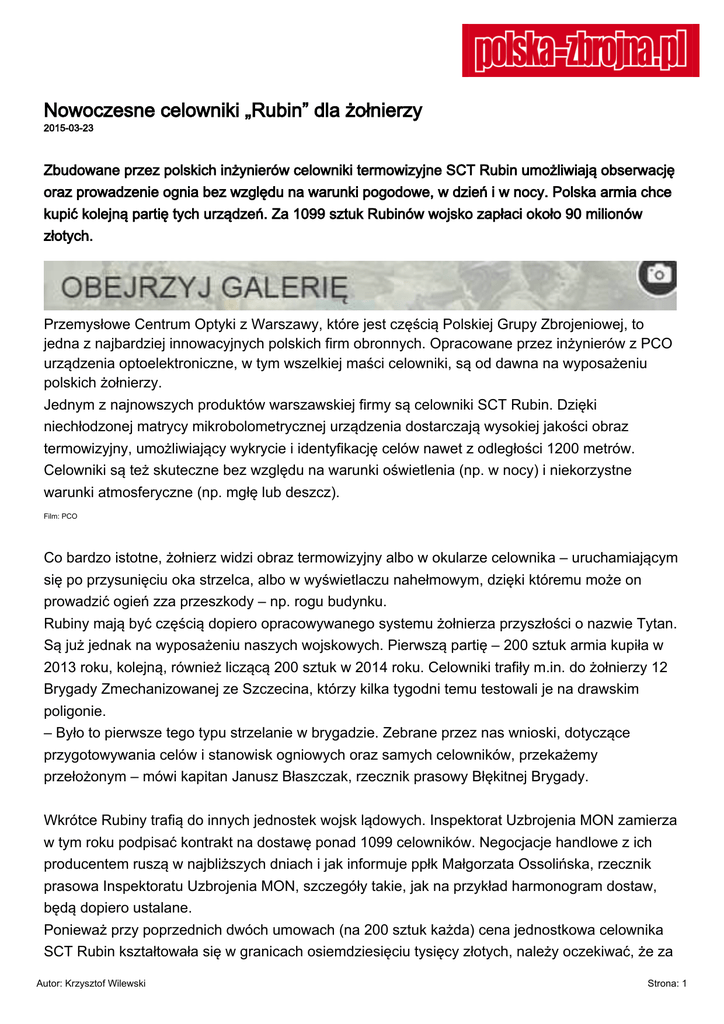 Nowoczesne celowniki „Rubin” dla żołnierzy 2015-03-23 Zbudowane przez polskich inżynierów celowniki termowizyjne SCT Rubin umożliwiają obserwację oraz prowadzenie ognia bez względu na warunki pogodowe, w dzień i w nocy. Polska armia chce kupić kolejną partię tych urządzeń. Za 1099 sztuk Rubinów wojsko zapłaci około 90 milionów złotych. Przemysłowe Centrum Optyki z Warszawy, które jest częścią Polskiej Grupy Zbrojeniowej, to jedna z najbardziej innowacyjnych polskich firm obronnych. Opracowane przez inżynierów z PCO urządzenia optoelektroniczne, w tym wszelkiej maści celowniki, są od dawna na wyposażeniu polskich żołnierzy. Jednym z najnowszych produktów warszawskiej firmy są celowniki SCT Rubin. Dzięki niechłodzonej matrycy mikrobolometrycznej urządzenia dostarczają wysokiej jakości obraz termowizyjny, umożliwiający wykrycie i identyfikację celów nawet z odległości 1200 metrów. Celowniki są też skuteczne bez względu na warunki oświetlenia (np. w nocy) i niekorzystne warunki atmosferyczne (np. mgłę lub deszcz). Film: PCO Co bardzo istotne, żołnierz widzi obraz termowizyjny albo w okularze celownika – uruchamiającym się po przysunięciu oka strzelca, albo w wyświetlaczu nahełmowym, dzięki któremu może on prowadzić ogień zza przeszkody – np. rogu budynku. Rubiny mają być częścią dopiero opracowywanego systemu żołnierza przyszłości o nazwie Tytan. Są już jednak na wyposażeniu naszych wojskowych. Pierwszą partię – 200 sztuk armia kupiła w 2013 roku, kolejną, również liczącą 200 sztuk w 2014 roku. Celowniki trafiły m.in. do żołnierzy 12 Brygady Zmechanizowanej ze Szczecina, którzy kilka tygodni temu testowali je na drawskim poligonie. – Było to pierwsze tego typu strzelanie w brygadzie. Zebrane przez nas wnioski, dotyczące przygotowywania celów i stanowisk ogniowych oraz samych celowników, przekażemy przełożonym – mówi kapitan Janusz Błaszczak, rzecznik prasowy Błękitnej Brygady. Wkrótce Rubiny trafią do innych jednostek wojsk lądowych. Inspektorat Uzbrojenia MON zamierza w tym roku podpisać kontrakt na dostawę ponad 1099 celowników. Negocjacje handlowe z ich producentem ruszą w najbliższych dniach i jak informuje ppłk Małgorzata Ossolińska, rzecznik prasowa Inspektoratu Uzbrojenia MON, szczegóły takie, jak na przykład harmonogram dostaw, będą dopiero ustalane. Ponieważ przy poprzednich dwóch umowach (na 200 sztuk każda) cena jednostkowa celownika SCT Rubin kształtowała się w granicach osiemdziesięciu tysięcy złotych, należy oczekiwać, że za Autor: Krzysztof Wilewski Strona: 1 ponad tysiąc sztuk polska armia będzie musiała zapłacić około dziewięćdziesięciu milionów złotych. Autor: Krzysztof Wilewski Strona: 2