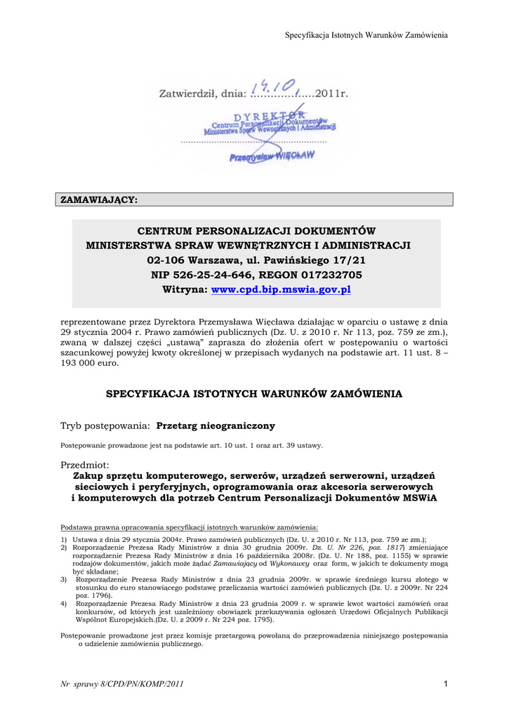 Specyfikacja Istotnych Warunków Zamówienia Zatwierdził, dnia: …………….…2011r. ………………………………….…………….. ZAMAWIAJĄCY: CENTRUM PERSONALIZACJI DOKUMENTÓW MINISTERSTWA SPRAW WEWNĘTRZNYCH I ADMINISTRACJI 02-106 Warszawa, ul. Pawińskiego 17/21 NIP 526-25-24-646, REGON 017232705 Witryna: www.cpd.bip.mswia.gov.pl reprezentowane przez Dyrektora Przemysława Więcława działając w oparciu o ustawę z dnia 29 stycznia 2004 r. Prawo zamówień publicznych (Dz. U. z 2010 r. Nr 113, poz. 759 ze zm.), zwaną w dalszej części „ustawą” zaprasza do złożenia ofert w postępowaniu o wartości szacunkowej powyżej kwoty określonej w przepisach wydanych na podstawie art. 11 ust. 8 – 193 000 euro. SPECYFIKACJA ISTOTNYCH WARUNKÓW ZAMÓWIENIA Tryb postępowania: Przetarg nieograniczony Postępowanie prowadzone jest na podstawie art. 10 ust. 1 oraz art. 39 ustawy. Przedmiot: Zakup sprzętu komputerowego, serwerów, urządzeń serwerowni, urządzeń sieciowych i peryferyjnych, oprogramowania oraz akcesoria serwerowych i komputerowych dla potrzeb Centrum Personalizacji Dokumentów MSWiA Podstawa prawna opracowania specyfikacji istotnych warunków zamówienia: 1) Ustawa z dnia 29 stycznia 2004r. Prawo zamówień publicznych (Dz. U. z 2010 r. Nr 113, poz. 759 ze zm.); 2) Rozporządzenie Prezesa Rady Ministrów z dnia 30 grudnia 2009r. Dz. U. Nr 226, poz. 1817) zmieniające rozporządzenie Prezesa Rady Ministrów z dnia 16 października 2008r. (Dz. U. Nr 188, poz. 1155) w sprawie rodzajów dokumentów, jakich może żądać Zamawiający od Wykonawcy oraz form, w jakich te dokumenty mogą być składane; 3) Rozporządzenie Prezesa Rady Ministrów z dnia 23 grudnia 2009r. w sprawie średniego kursu złotego w stosunku do euro stanowiącego podstawę przeliczania wartości zamówień publicznych (Dz. U. z 2009r. Nr 224 poz. 1796). 4) Rozporządzenie Prezesa Rady Ministrów z dnia 23 grudnia 2009 r. w sprawie kwot wartości zamówień oraz konkursów, od których jest uzależniony obowiązek przekazywania ogłoszeń Urzędowi Oficjalnych Publikacji Wspólnot Europejskich.(Dz. U. z 2009 r. Nr 224 poz. 1795). Postępowanie prowadzone jest przez komisję przetargową powołaną do przeprowadzenia niniejszego postępowania o udzielenie zamówienia publicznego. Nr sprawy 8/CPD/PN/KOMP/2011 1 Specyfikacja Istotnych Warunków Zamówienia I. WPROWADZENIE 1. O udzielenie zamówienia mogą ubiegać się wyłącznie Wykonawcy, których oferta zgodna jest z przepisami ustawy i spełnia wymagania określone w specyfikacji istotnych warunków zamówienia. 2. Wykonawcą może być osoba fizyczna, osoba prawna lub jednostka organizacyjna nieposiadająca osobowości prawnej oraz podmioty te występujące wspólnie. 3. Wykonawcy występujący wspólnie ponoszą solidarną odpowiedzialność za niewykonanie lub nienależyte wykonanie zamówienia. 4. Koszty związane z przygotowaniem i złożeniem oferty ponosi Wykonawca. Wykonawca powinien zapoznać się z całością SIWZ, których integralną część stanowią załączniki. 5. Postępowanie prowadzone jest w języku polskim. II. INFORMACJE DODATKOWE 1. Zamawiający dopuszcza składanie ofert częściowych. Jeden Wykonawca może złożyć ofertę na jedną lub więcej części wskazanych poniżej. 2. Zamawiający nie przewiduje zamówień uzupełniających. 3. Zamawiający nie dopuszcza składania ofert wariantowych w rozumieniu art. 83 ustawy. 4. Zamawiający nie przewiduje zawarcia umowy ramowej. 5. Zamawiający nie przewiduje rozliczenia w walutach obcych. Rozliczenia miedzy Zamawiającym a Wykonawcą będą w PLN. 6. Zamawiający nie przewiduje aukcji elektronicznej. 7. Zamawiający nie przewiduje zwrotu kosztów udziału w postępowaniu z zastrzeżeniem art. 93 ust. 4 ustawy. 8. Zamawiający przewiduje możliwość dokonania zmian umowy na warunkach określonych w Rozdziale XVI SIWZ (Istotnych Postanowień Umowy). III. OPIS PRZEDMIOTU ZAMÓWIENIA Przedmiotem zamówienia jest zakup i dostawa całkowicie nowego, nie używanego sprzętu komputerowego, serwerów, urządzeń serwerowni, urządzeń sieciowych i peryferyjnych, oprogramowania oraz akcesoriów serwerowych i komputerowych. Szczegółowy opis przedmiotu zamówienia określający wymagania techniczne sprzętu zawiera załącznik nr 5 do SIWZ – Opis przedmiotu zamówienia – parametry techniczne. Przedmiot zamówienia został podzielony na następujące części: Część I zamówienia – 1. Jednostka stacjonarna w ilości 30 sztuk; 2. Jednostka stacjonarna w ilości 2 sztuki; 3. Jednostka stacjonarna w ilości 24 sztuki. Część II zamówienia – 1. Notebook, w ilości 5 2. Notebook, w ilości 1 3. Notebook, w ilości 7 4. Notebook, w ilości 1 5. Notebook, w ilości 1 sztuk; sztuka; sztuk; sztuka; sztuka. Część III zamówienia – 1. Serwer typu RACK, w ilości 2 sztuki; 2. Modułowa Macierz Dyskowa, w ilości 1 sztuka; 3. Serwer typu RACK, w ilości 2 sztuki. Część IV zamówienia – 1. Drukarka laserowa, w ilości10 sztuk; 2. Drukarka laserowa, w ilości 1 sztuka; 3. Drukarka atramentowa przenośna, w ilości 1 sztuka; 4. Drukarka laserowa, w ilości 1 sztuka; 5. Urządzenie wielofunkcyjne, w ilości 1 sztuka; Nr sprawy 8/CPD/PN/KOMP/2011 2 Specyfikacja Istotnych Warunków Zamówienia 6. 7. 8. 9. 10. 11. 12. Monitor LCD, w ilości 27 sztuk; Monitor LCD, w ilości 19 sztuk; Monitor LCD, w ilości 1 sztuka; Monitor LCD, w ilości 1 sztuka; Monitor LCD, w ilości 2 sztuki; Projektor, w ilości 1 sztuka; Projektor, w ilości 1 sztuka. Część V zamówienia – 1. Oprogramowanie, w ilości 1 sztuka; 2. Oprogramowanie, w ilości 1 sztuka; 3. Oprogramowanie, w ilości 1 sztuka; 4. Oprogramowanie, w ilości 4 sztuki; 5. Oprogramowanie, w ilości 2 sztuki; 6. Oprogramowanie, w ilości 1 sztuka; 7. Oprogramowanie, w ilości 11 sztuk. 8. Oprogramowanie, w ilości 80 sztuk; 9. System operacyjny, w ilości 7 sztuk. Część VI zamówienia – 1. Dysk twardy zewn
