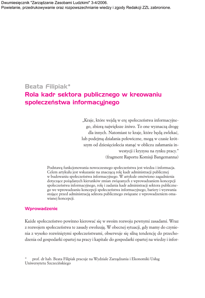 Dwumiesięcznik "Zarządzanie Zasobami Ludzkimi" 3-4/2006. Powielanie, przedrukowywanie oraz rozpowszechnianie wiedzy i zgody Redakcji ZZL zabronione. Beata Filipiak* Rola kadr sektora publicznego w kreowaniu spo³eczeñstwa informacyjnego Kraje, które wejd¹ w erê spo³eczeñstwa informacyjnego, zbior¹ najwiêksze ¿niwo. To one wyznacz¹ drogê dla innych. Natomiast te kraje, które bêd¹ zwlekaæ, lub podejm¹ dzia³ania po³owiczne, mog¹ w czasie krótszym od dziesiêciolecia stan¹æ w obliczu za³amania inwestycji i kryzysu na rynku pracy." (fragment Raportu Komisji Bangemanna) Podstaw¹ funkcjonowania nowoczesnego spo³eczeñstwa jest wiedza i informacja. Celem artyku³u jest wskazanie na znacz¹c¹ rolê kadr administracji publicznej w budowaniu spo³eczeñstwa informacyjnego. W artykule omówiono zagadnienia dotycz¹ce po¿¹danych kierunków zmian zwi¹zanych z wprowadzaniem koncepcji spo³eczeñstwa informacyjnego, rolê i zadania kadr administracji sektora publicznego we wprowadzaniu koncepcji spo³eczeñstwa informacyjnego, bariery i wyzwania stoj¹ce przed administracj¹ sektora publicznego zwi¹zane z wprowadzeniem omawianej koncepcji. Beatakadr Rola Filipiak sektora publicznego... Wprowadzenie Ka¿de spo³eczeñstwo powinno kierowaæ siê w swoim rozwoju pewnymi zasadami. Wraz z rozwojem spo³eczeñstwa te zasady ewoluuj¹. W obecnej sytuacji, gdy mamy do czynienia z wysoko rozwiniêtymi spo³eczeñstwami, obserwuje siê siln¹ tendencjê do przechodzenia od gospodarki opartej na pracy i kapitale do gospodarki opartej na wiedzy i infor- * prof. dr hab. Beata Filipiak pracuje na Wydziale Zarz¹dzania i Ekonomiki Us³ug Uniwersytetu Szczeciñskiego 76 Beata Filipiak macji. W tej gospodarce podstawow¹ rolê pe³ni informacja oraz technologie informacyjne. Wiedza i informacja staj¹ siê podstawowym zasobem. Konsekwencj¹ tych zmian jest fakt powi¹zania materialnych instytucji oraz obiektów z obiektami i instytucjami wirtualnymi realizuj¹cymi podobne funkcje. Efektem tego s¹ zmiany w charakterze powi¹zañ gospodarczych i spo³ecznych. Na tym tle rysuje siê nowy system funkcjonowania spo³eczeñstwa, oparty na nowych zasadach. System ten nosi nazwê spo³eczeñstwa informacyjnego. Obecnie nie ma jednoznacznych definicji tego pojêcia, ale dla celów niniejszego opracowania nale¿y przyj¹æ, ¿e: spo³eczeñstwo, w którym informacja jest intensywnie wykorzystywana w ¿yciu ekonomicznym, spo³ecznym, kulturalnym i politycznym, to spo³eczeñstwo, które posiada bogate rodki komunikacji i przetwarzania informacji, bêd¹ce podstaw¹ tworzenia wiêkszoci dochodu narodowego oraz zapewniaj¹ce ród³o utrzymania wiêkszoci ludzi [Krzysztofek, Szczepañski, 2002, s. 170]. Aby sprostaæ wyzwaniom gospodarki globalnej, nad¹¿yæ za wiatowymi trendami, a zw³aszcza stworzyæ warunki rozwoju spo³eczeñstwa, trzeba umo¿liwiæ powszechny dostêp do informacji. Polska musi dostosowaæ siê do zachodz¹cych zmian, st¹d te¿ konieczne jest wprowadzenie obywateli, szkó³, przedsiêbiorstw oraz administracji publicznej w wiek cywilizacji informacyjnej oraz wspieranie nowych technologii informatycznych i w zakresie komunikowania siê. Na tym tle mo¿na wskazaæ, ¿e podstawow¹ rolê w kreowaniu idei spo³eczeñstwa informacyjnego pe³ni administracja publiczna szczebla rz¹dowego i samorz¹dowego. Wiadomo, ¿e aby pe³na i szczegó³owa informacja by³a dostêpna, kto musi w³o¿yæ niema³o pracy w jej przygotowanie. Kto musi wskazaæ, ¿e jest to potrzebne, przydatne i u³atwia kontakty z otoczeniem. Kto musi pe³niæ rolê porz¹dkuj¹c¹ przestrzeñ informacyjn¹, formu³uj¹c pewne strategie, regu³y i zasady korzystania z niej. S¹ to zadania najczêciej spoczywaj¹ce na administracji publicznej. Oczywicie sektor prywatny przoduje w wykorzystaniu informacji, ale spo³eczeñstwo oczekuje równie¿ konkretnych zachowañ w tym zakresie od administracji publicznej, które bêd¹ zmierza³y do wykorzystania e-informacji w funkcjonowaniu urzêdu. Administracja publiczna z jednej strony jest kreatorem spo³eczeñstwa informacyjnego, z drugiej za musi nad¹¿aæ za technologiami wprowadzanymi przez sektor prywatny. Celem artyku³u jest wskazanie na bardzo wa¿n¹ rolê kadr administracji publicznej w budowaniu spo³eczeñstwa informacyjnego. Rola kadr sektora publicznego... 77 Po¿¹dane kierunki zmian zwi¹zane z wprowadzeniem koncepcji spo³eczeñstwa informacyjnego Ogó³ czynników determinuj¹cych zmiany w dotychczasowym postrzeganiu funkcjonowania urzêdu administracji publicznej mo¿na podzieliæ na czynniki zewnêtrzne i wewnêtrzne. Ogó³ czynników zewnêtrznych jest zwi¹zany z cz³onkostwem Polski w strukturach Unii Europejskiej. W szczególnoci nale¿y wskazaæ na nastêpuj¹ce determinanty rozwoju spo³eczeñstwa informacyjnego wynikaj¹ce z naszego uczestnictwa w strukturach Unii Europejskiej [MNiI, 2005a]: c nowe mo¿liwoci i wymagania dostosowawcze zwi¹zane z cz³onkostwem c zwiêkszenie komunikatywnoci spo³ecznej, organizacyjnej i biznesowej c potrzeba akceptacji spo³ecznej c realizacja podstawowych swobód: przep³ywu osób, towarów, kapita³u i us³ug c przyjêcie, a nastêpnie modyfikacja strategii lizboñskiej, podkrelaj¹cej rolê spo³eczeñstwa informacyjnego dla zwiêkszenia konkurencyjnoci i dobrobytu Europy c przeznaczenie z bud¿etu Unii Europejskiej rodków finansowych na skuteczne stosowanie i przyswajanie produktów teleinformatyki c wprowadzenie inicjatywy i2010 Europejskie spo³eczeñstwo informacyjne na rzecz wzrostu i zatrudnienia c powo³anie programów wspieraj¹cych rozwój spo³eczeñstwa informacyjnego, m.in. eTEN, IDA BC, e Content, eSafe c rozwój e-technologii. Ogó³ czynników wewnêtrznych wynika z potrzeb gospodarczych, spo³ecznych i administracyjnych, odczuwanych przez spo³eczeñstwo. W szczególnoci nale¿y wskazaæ na nastêpuj¹ce determinanty rozwoju spo³eczeñstwa informacyjnego wynikaj¹ce z wskazanego zespo³u czyn