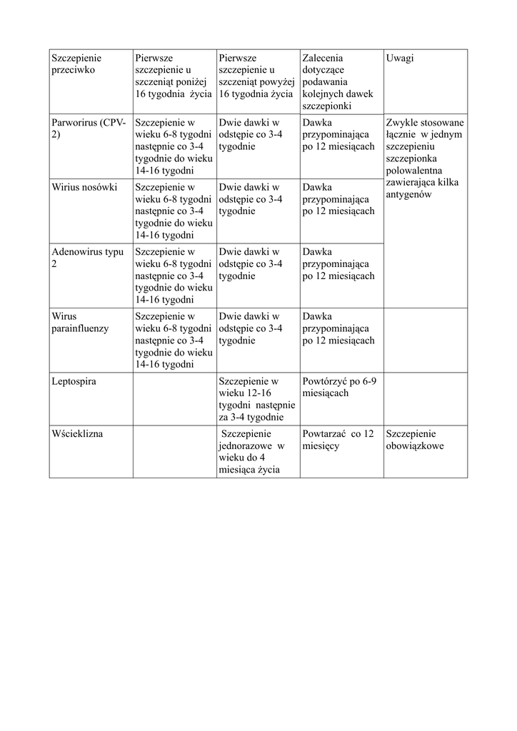 Szczepienie przeciwko Pierwsze szczepienie u szczeniąt poniżej 16 tygodnia życia Pierwsze szczepienie u szczeniąt powyżej 16 tygodnia życia Zalecenia dotyczące podawania kolejnych dawek szczepionki Uwagi Parworirus (CPV- Szczepienie w Dwie dawki w 2) wieku 6-8 tygodni odstępie co 3-4 następnie co 3-4 tygodnie tygodnie do wieku 14-16 tygodni Dawka przypominająca po 12 miesiącach Wirius nosówki Szczepienie w Dwie dawki w wieku 6-8 tygodni odstępie co 3-4 następnie co 3-4 tygodnie tygodnie do wieku 14-16 tygodni Dawka przypominająca po 12 miesiącach Zwykle stosowane łącznie w jednym szczepieniu szczepionka polowalentna zawierająca kilka antygenów Adenowirus typu 2 Szczepienie w Dwie dawki w wieku 6-8 tygodni odstępie co 3-4 następnie co 3-4 tygodnie tygodnie do wieku 14-16 tygodni Dawka przypominająca po 12 miesiącach Wirus parainfluenzy Szczepienie w Dwie dawki w wieku 6-8 tygodni odstępie co 3-4 następnie co 3-4 tygodnie tygodnie do wieku 14-16 tygodni Dawka przypominająca po 12 miesiącach Leptospira Szczepienie w Powtórzyć po 6-9 wieku 12-16 miesiącach tygodni następnie za 3-4 tygodnie Wścieklizna Szczepienie jednorazowe w wieku do 4 miesiąca życia Powtarzać co 12 miesięcy Szczepienie obowiązkowe Szczepienie przeciwko Pierwsze szczepienie u kociąt poniżej 16 tygodnia życia Wirus panleukopeni Zalecenia dotyczące podawania kolejnych dawek szczepionki Uwagi Pierwsza dawka w Dwie dawki w wieku 8-9 odstępie 3-4 tygodnii następna tygodni za 3-4 tygodnie następna w wieku 16 tygodni Powtórzyć po 12 miesiącach Herpeswirus Pierwsza dawka w Dwie dawki w wieku 8-9 odstępie 3-4 tygodnii następna tygodni za 3-4 tygodnie następna w wieku 16 tygodni Powtórzyć po 12 miesiącach Zwykle stosowane łącznie w jednym szczepieniu szczepionka polowalentna zawierająca kilka antygenów Kaliciwirus Pierwsza dawka w Dwie dawki w wieku 8-9 odstępie 3-4 tygodnii następna tygodni za 3-4 tygodnie następna w wieku 16 tygodni Powtórzyć po 12 miesiącach Wirus wścieklizny Dawka w wieku co najmniej 8 tygodni Pierwsze szczepienie u kotów powyżej 16 tygodnia życia Dawka w wieku co najmniej 8 tygodni Zwykle co 2 do 4 lat zależnie od użytej szczepionki Wirus białaczki Pierwsza dawka w Dwie dawki co 3- Co 12 miesięcy wieku 8 tygodni 4 tygodnie kolejna za 3-4 tygodnie Chlamydophyla felis Pierwsza dawka w Dwie dawki w wieku 9 tygodni odstępie 3-4 kolejana co 3-4 tygodni tygodnie Szczepienie co 12 miesięcy