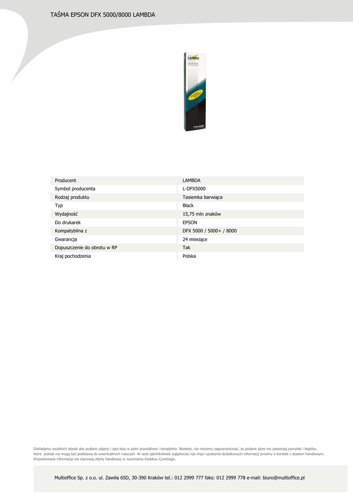 TAŚMA EPSON DFX 5000/8000 LAMBDA Producent LAMBDA Symbol producenta L-DFX5000 Rodzaj produktu Tasiemka barwiąca Typ Black Wydajność 15,75 mln znaków Do drukarek EPSON Kompatybilna z DFX 5000 / 5000+ / 8000 Gwarancja 24 miesiące Dopuszczenie do obrotu w RP Tak Kraj pochodzenia Polska Dokładamy wszelkich starań aby podane zdjęcie i opis były w pełni prawidłowe i kompletne. Niestety, nie możemy zagwarantować, że podane dane nie zawierają pomyłek i błędów, które jednak nie mogą być podstawą do ewentualnych roszczeń. W razie jakichkolwiek wątpliwości lub chęci uzyskania dodatkowych informacji prosimy o kontakt z działem handlowym. Prezentowane informacje nie stanowią oferty handlowej w rozumieniu Kodeksu Cywilnego. Multioffice Sp. z o.o. ul. Zawiła 65D, 30-390 Kraków tel.: 012 2999 777 faks: 012 2999 778 e-mail: [email protected]