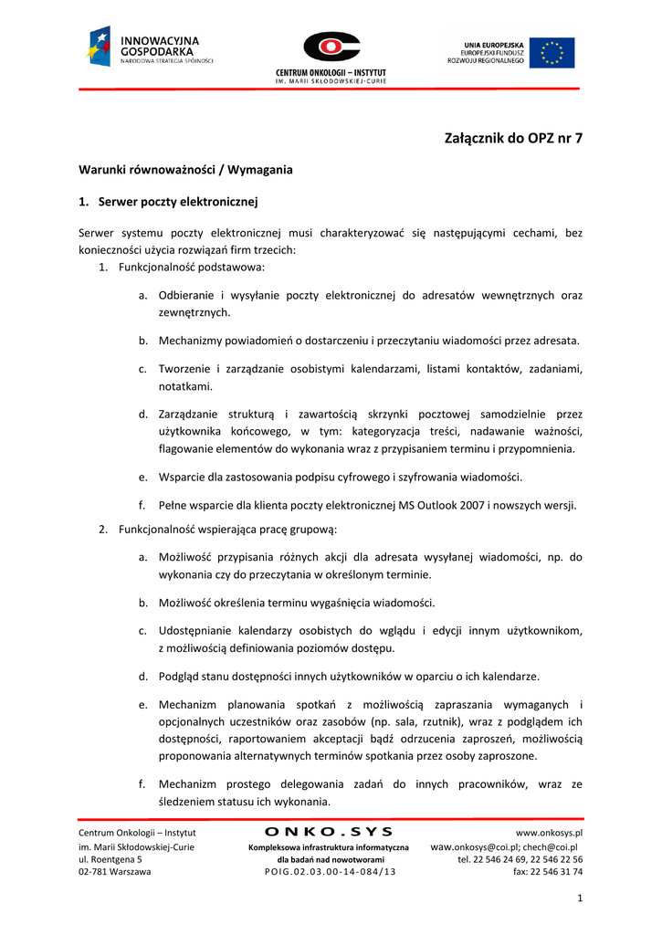 Załącznik do OPZ nr 7 Warunki równoważności / Wymagania 1. Serwer poczty elektronicznej Serwer systemu poczty elektronicznej musi charakteryzować się następującymi cechami, bez konieczności użycia rozwiązań firm trzecich: 1. Funkcjonalność podstawowa: a. Odbieranie i wysyłanie poczty elektronicznej do adresatów wewnętrznych oraz zewnętrznych. b. Mechanizmy powiadomień o dostarczeniu i przeczytaniu wiadomości przez adresata. c. Tworzenie i zarządzanie osobistymi kalendarzami, listami kontaktów, zadaniami, notatkami. d. Zarządzanie strukturą i zawartością skrzynki pocztowej samodzielnie przez użytkownika końcowego, w tym: kategoryzacja treści, nadawanie ważności, flagowanie elementów do wykonania wraz z przypisaniem terminu i przypomnienia. e. Wsparcie dla zastosowania podpisu cyfrowego i szyfrowania wiadomości. f. Pełne wsparcie dla klienta poczty elektronicznej MS Outlook 2007 i nowszych wersji. 2. Funkcjonalność wspierająca pracę grupową: a. Możliwość przypisania różnych akcji dla adresata wysyłanej wiadomości, np. do wykonania czy do przeczytania w określonym terminie. b. Możliwość określenia terminu wygaśnięcia wiadomości. c. Udostępnianie kalendarzy osobistych do wglądu i edycji innym użytkownikom, z możliwością definiowania poziomów dostępu. d. Podgląd stanu dostępności innych użytkowników w oparciu o ich kalendarze. e. Mechanizm planowania spotkań z możliwością zapraszania wymaganych i opcjonalnych uczestników oraz zasobów (np. sala, rzutnik), wraz z podglądem ich dostępności, raportowaniem akceptacji bądź odrzucenia zaproszeń, możliwością proponowania alternatywnych terminów spotkania przez osoby zaproszone. f. Mechanizm prostego delegowania zadań do innych pracowników, wraz ze śledzeniem statusu ich wykonania. Centrum Onkologii – Instytut im. Marii Skłodowskiej-Curie ul. Roentgena 5 02-781 Warszawa ONKO.SYS Kompleksowa infrastruktura informatyczna dla badań nad nowotworami POIG.02.03.00-14-084/13 www.onkosys.pl [email protected]; [email protected] tel. 22 546 24 69, 22 546 22 56 fax: 22 546 31 74 1 g. Tworzenie i zarządzanie współdzielonymi repozytoriami kontaktów, kalendarzy, zadań. h. Mechanizm udostępniania współdzielonych skrzynek pocztowych. i. Obsługa list i grup dystrybucyjnych. j. Dostęp ze skrzynki do poczty elektronicznej, poczty głosowej, wiadomości błyskawicznych i SMS-ów. k. Możliwość informowania zewnętrznych użytkowników poczty elektronicznej o dostępności lub niedostępności. l. Możliwość wyboru dostępności. poziomu szczegółowości udostępnianych informacji o m. Widok rozmowy, automatycznie organizujący wątki wiadomości w oparciu o przebieg wymiany wiadomości między stronami. n. Konfigurowalna funkcja informująca użytkowników przed kliknięciem przycisku wysyłania o szczegółach wiadomości, które mogą spowodować jej niedostarczenie lub wysłanie pod niewłaściwy adres, obejmująca przypadkowe wysłanie poufnych informacji do odbiorców zewnętrznych, wysyłanie wiadomości do dużych grup dystrybucyjnych lub odbiorców, którzy pozostawili informacje o nieobecności. o. Transkrypcja tekstowa wiadomości głosowej, pozwalająca użytkownikom na szybkie priorytetyzowanie wiadomości bez potrzeby odsłuchiwania pliku dźwiękowego. p. Możliwość uruchomienia osobistego automatycznego asystenta poczty głosowej. q. Telefoniczny dostęp do całej skrzynki odbiorczej – w tym poczty elektronicznej, kalendarza i listy kontaktów. r. Udostępnienie użytkownikom możliwości aktualizacji danych kontaktowych i śledzenia odbierania wiadomości e-mail bez potrzeby wsparcia ze strony informatyków. s. Mechanizm automatycznego dostosowywania się funkcji wyszukiwania kontaktów do najczęstszych działań użytkownika skutkujący priorytetyzacją wyników wyszukiwania. t. Możliwość wyszukiwania i łączenia danych (zgodnie z nadanymi uprawnieniami) z systemu poczty elektronicznej oraz innych systemów w organizacji (portali wielofunkcyjnych, komunikacji wielokanałowej i serwerów plików). u. Możliwość dostępu do poczty elektronicznej i dokumentów przechowywanych w portalu wielofunkcyjnym z poziomu jednego interfejsu zarządzanego przez serwer poczty elektronicznej. 3. Funkcjonalność wspierająca zarządzanie systemem poczty: Centrum Onkologii – Instytut im. Marii Skłodowskiej-Curie ul. Roentgena 5 02-781 Warszawa ONKO.SYS Kompleksowa infrastruktura informatyczna dla badań nad nowotworami POIG.02.03.00-14-084/13 www.onkosys.pl [email protected]; [email protected] tel. 22 546 24 69, 22 546 22 56 fax: 22 546 31 74 2 a. Oparcie się o profile użytkowników usługi katalogowej Active Directory. b. Wielofunkcyjna konsola administracyjna umożliwiająca zarządzanie systemem poczty oraz dostęp do statystyk i logów użytkowników. c. Definiowanie kwot na rozmiar skrzynek pocztowych użytkowników, z możliwością ustawiania progu ostrzegawczego poniżej górnego limitu. d. Możliwość definiowania różnych limitów pojemności skrzynek dla różnych grup użytkowników. e. Możliwość przeniesienia lokalnych archiwów skrzynki pocztowej z komputera na serwer. f. Możliwość korzystania interfejsu internetowego w celu wykonywania często spotykanych zadań związanych z pomocą techniczną. g. Narzędzia kreowania, wdrażania i zarządzania politykami nazewnictwa grup dystrybucyjnych. 4. Utrzymanie bezpieczeństwa informacji a. Centralne zarządzanie cyklem życia informacji przechowywanych w systemie pocztowym, w tym: śledzenie i rejestrowanie ich przepływu, wygaszanie po zdefiniowanym okresie czasu, oraz archiwizacja danych. b. Możliwość wprowadzenia modelu kontroli dostępu, który umożliwia nadanie specjalistom uprawnień do wykonywania określonych zadań – na przykład pracownikom odpowiedzialnym za zgodność z uregulowaniami uprawnień do przeszukiwania wielu skrzynek pocztowych – bez przyznawania pełnych