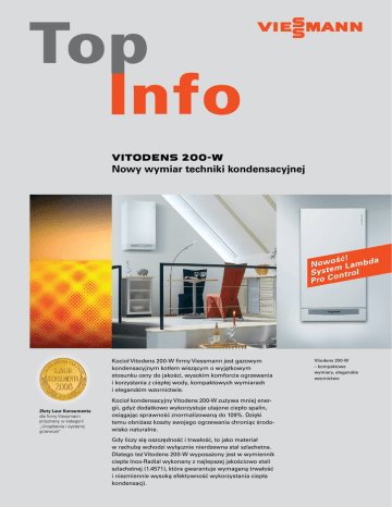 VITODENS 200-W Nowy wymiar techniki kondensacyjnej ść! a Nowom L a m b d e S y s t o n t ro l P ro C Kocioł Vitodens 200-W firmy Viessmannjest gazowym kondensacyjnym kotłem wiszącym o wyjątkowym stosunku ceny do jakości, wysokim komforcie ogrzewania i korzystania z ciepłej wody, kompaktowych wymiarach i eleganckim wzornictwie. Złoty Laur Konsumenta dla firmy Viessmann przyznany w kategorii „Urządzenia i systemy grzewcze” Kocioł kondensacyjny Vitodens 200-W zużywa mniej energii, gdyż dodatkowo wykorzystuje utajone ciepło spalin, osiągając sprawność znormalizowaną do 109%. Dzięki temu obniżasz koszty swojego ogrzewania chroniąc środowisko naturalne. Gdy liczy się oszczędność i trwałość, to jako materiał w rachubę wchodzi wyłącznie nierdzewna stal szlachetna. Dlatego też Vitodens 200-W wyposażony jest w wymiennik ciepła Inox-Radial wykonany z najlepszej jakościowo stali szlachetnej (1.4571), która gwarantuje wymaganą trwałość i niezmiennie wysoką efektywność wykorzystania ciepła kondensacji. Vitodens 200-W – kompaktowe wymiary, eleganckie wzornictwo VITODENS 200-W z nowym, gazowym palnikiem cylindrycznym MatriX i systemem Lambda Pro Control Viessmann sp. z o.o. ul. Karkonoska 65 53-015 Wrocław tel. 071/ 36 07 100 Infolinia: 0801 0801 24 www.viessmann.pl Innowacją jest nowy, opracowany konstrukcyjnie i produkowany w całości w firmie Viessmann palnik cylindryczny MatriX, dysponujący zwiększonym zakresem modulacji 1:4. Również nowością jest zastosowanie w kotłach serii Vitodens 200-W systemu kontroli procesu spalania Lambda Pro Control, dopasowującego warunki spalania do wahań kaloryczności gazu. Zapewnia on zachowanie zawsze wysokiej efektywności energetycznej i najwyższej sprawności spalania. Cyfrowy regulator pogodowy Vitotronic 200 Przegląd zalet: Gazowy, jednofunkcyjny kocioł kondensacyjny, zakresy mocy: – gaz ziemny lub płynny: 4,8 – 19,0 kW; 6,5 – 26,0 kW; 8,8 – 35,0 kW; 17,0 – 45,0 kW i 17,0 – 60 kW – gaz ziemny: 30,0 – 80,0 kW i 30,0 – 105,0 kW. Nowy palnik cylindryczny MatriX Vitodens 200-W Sprawność znormalizowana do 109%. Duży zakres modulacji palnika: 1:4 Powierzchnia grzewcza Inox-Radial z wysokojakościowej stali szlachetnej (1.4571) zapewnia wysoką nieza wodność i wysoką sprawność kotła. System Lambda Pro Control rozpoznający automatycznie każdy rodzaj zastosowanego gazu, reguluje ciągle skład mieszanki gazowo–powietrznej – brak konieczności wymiany dysz przy zmianie rodzaju gazu – niskoemisyjne i efektywne spalanie, także przy niestabilnej kaloryczności gazu, – gwarantowana cicha praca palnika poprzezzastosowanie wentylatora o niskiejprędkości obrotowej. VITODENS 200-W Moc cieplna Wymiary (dług.× szer.× wys.) kW 4,8 – 19 mm 6,5 – 26 8,8 – 26 360 × 450 × 850 17 – 45 380 × 480 × 850 Sprawn. znorm. % 109 109 109 109 Przyłącza kotła spalin/nawiewu ∅ mm 60/100 60/100 60/100 80/125 kg 43 45 47 65 Ciężar 17 – 60 109 30 – 80 30 – 105 530 × 480 × 850 109 109 80/125 100/150 100/150 65 83 83 Twój Fachowy Doradca: Zmiany techniczne zastrzeżone T002 31 PL 07/2008 Modulowany palnik cylindryczny MatriX, skonstruowany i wyprodukowany w zakładach firmy Viessmann – ekstremalnie niska emisja substancji szkodliwych – długoletnia a eksploatacja poprzez zastosowanie siatki MatriX ze stali nierdzewnej – optymalne dopasowanie palnika do wymiennika spaliny/woda. Powierzchnia grzewcza Inox–Radial z wysokojakościowej stali szlachetnej