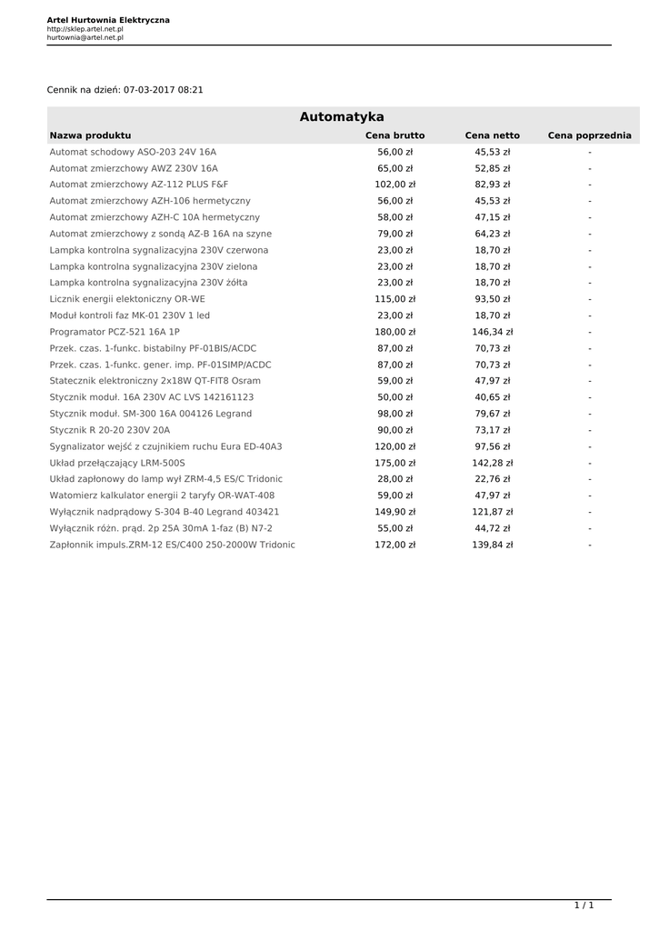 Pobierz cennik - Sklep Artel Hurtownia Elektryczna