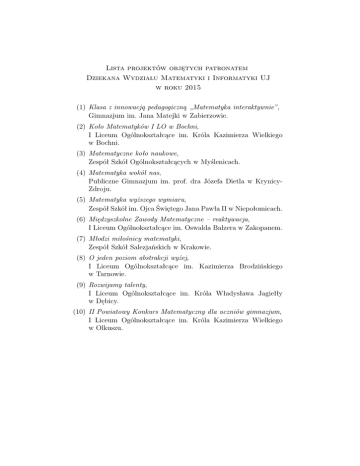 Lista projektów objętych patronatem Dziekana Wydziału Matematyki i Informatyki UJ w roku 2015 (1) Klasa z innowacją pedagogiczną „Matematyka interaktywnie”, Gimnazjum im. Jana Matejki w Zabierzowie. (2) Koło Matematyków I LO w Bochni, I Liceum Ogólnokształcące im. Króla Kazimierza Wielkiego w Bochni. (3) Matematyczne koło naukowe, Zespół Szkół Ogólnokształcących w Myślenicach. (4) Matematyka wokół nas, Publiczne Gimnazjum im. prof. dra Józefa Dietla w KrynicyZdroju. (5) Matematyka wyższego wymiaru, Zespół Szkół im. Ojca Świętego Jana Pawła II w Niepołomicach. (6) Międzyszkolne Zawody Matematyczne – reaktywacja, I Liceum Ogólnokształcące im. Oswalda Balzera w Zakopanem. (7) Młodzi miłośnicy matematyki, Zespół Szkół Salezjańskich w Krakowie. (8) O jeden poziom abstrakcji wyżej, I Liceum Ogólnokształcące im. Kazimierza Brodzińskiego w Tarnowie. (9) Rozwijamy talenty, I Liceum Ogólnokształcące im. Króla Władysława Jagiełły w Dębicy. (10) II Powiatowy Konkurs Matematyczny dla uczniów gimnazjum, I Liceum Ogólnokształcące im. Króla Kazimierza Wielkiego w Olkuszu.