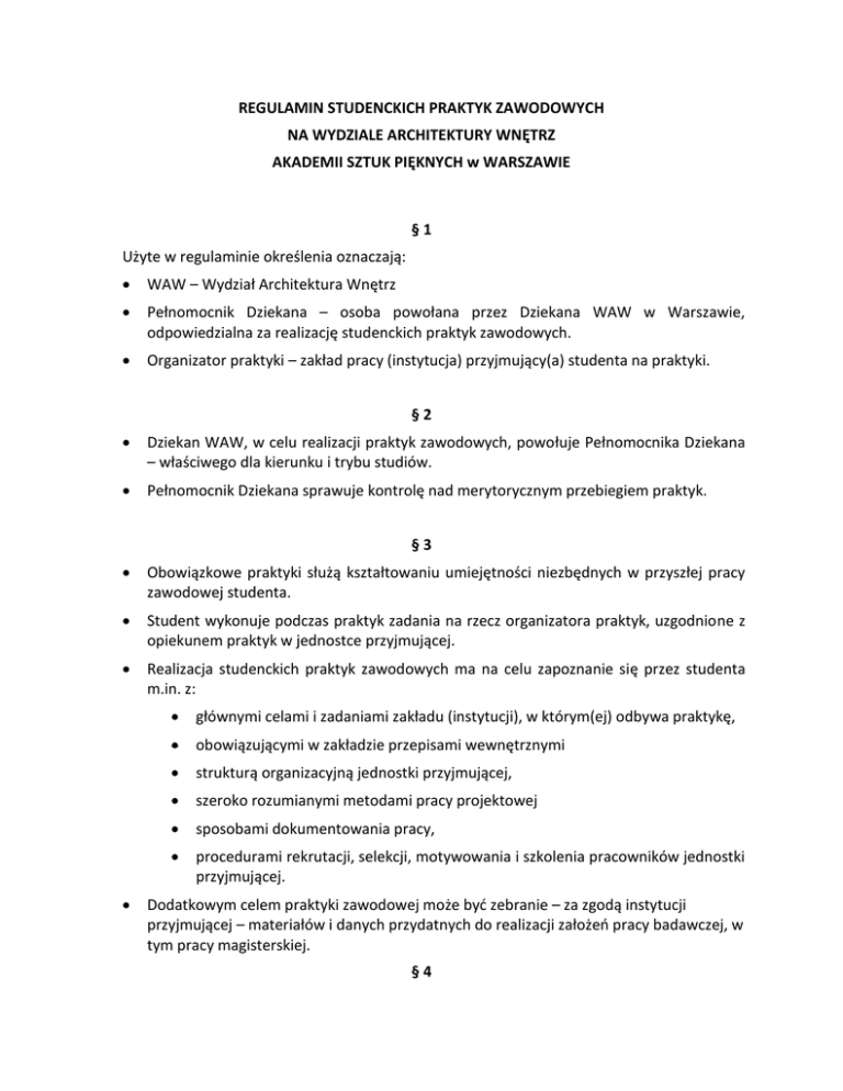 REGULAMIN STUDENCKICH PRAKTYK ZAWODOWYCH NA WYDZIALE ARCHITEKTURY WNĘTRZ AKADEMII SZTUK PIĘKNYCH w WARSZAWIE §1 Użyte w regulaminie określenia oznaczają: WAW – Wydział Architektura Wnętrz Pełnomocnik Dziekana – osoba powołana przez Dziekana WAW w Warszawie, odpowiedzialna za realizację studenckich praktyk zawodowych. Organizator praktyki – zakład pracy (instytucja) przyjmujący(a) studenta na praktyki. §2 Dziekan WAW, w celu realizacji praktyk zawodowych, powołuje Pełnomocnika Dziekana – właściwego dla kierunku i trybu studiów. Pełnomocnik Dziekana sprawuje kontrolę nad merytorycznym przebiegiem praktyk. §3 Obowiązkowe praktyki służą kształtowaniu umiejętności niezbędnych w przyszłej pracy zawodowej studenta. Student wykonuje podczas praktyk zadania na rzecz organizatora praktyk, uzgodnione z opiekunem praktyk w jednostce przyjmującej. Realizacja studenckich praktyk zawodowych ma na celu zapoznanie się przez studenta m.in. z: głównymi celami i zadaniami zakładu (instytucji), w którym(ej) odbywa praktykę, obowiązującymi w zakładzie przepisami wewnętrznymi strukturą organizacyjną jednostki przyjmującej, szeroko rozumianymi metodami pracy projektowej sposobami dokumentowania pracy, procedurami rekrutacji, selekcji, motywowania i szkolenia pracowników jednostki przyjmującej. Dodatkowym celem praktyki zawodowej może być zebranie – za zgodą instytucji przyjmującej – materiałów i danych przydatnych do realizacji założeń pracy badawczej, w tym pracy magisterskiej. §4 Studenckie praktyki zawodowe stanowią integralną część kształcenia na Wydziale Architektury Wnętrz w Warszawie. Mają charakter obowiązkowy. Zakres przedmiotowy praktyki powinien być zgodny z wybranym przez studenta kierunkiem studiów. Student powinien zrealizować praktykę zawodową do końca ostatniego semestru ostatniego roku studiów I stopnia. Praktyki powinny odbywać się podczas letnich wakacji, od czerwca do końca września, aby nie zaburzać porządku zajęć. Najodpowiedniejszym momentem odbywania praktyk są wakacje pomiędzy 4 i 5 semestrem studiów licencjackich. Jednak w przypadku studentów wyróżniających się, mogą to być wakacje pomiędzy semestrem 3 i 4. Minimalny czas praktyk wynosi: co najmniej 4-5 tygodni.-dla SSL i NSL §5 Praktyki mogą być realizowane w biurach projektów i pracowniach projektowych. Dopuszcza się też pracę w wydawnictwach, domach medialnych, redakcjach (gazet, telewizyjnych, radiowych, internetowych), agencjach public relations i reklamowych, instytucjach naukowo-badawczych, instytucjach oświatowych, placówkach kultury, jednostkach gospodarczych (krajowych i korporacjach transnarodowych), itp., pod warunkiem, że praca ta będzie miała związek z szeroko rozumianym projektowaniem. Student ma prawo do samodzielnego zaproponowania miejsca odbywania praktyki. O właściwości przedmiotowej wybranej przez studenta praktyki decyduje Dziekan lub Pełnomocnik Dziekana. Praktyki mogą być odbywane zarówno na terytorium Rzeczypospolitej Polskiej, jak i poza jej granicami. Realizacja praktyk nie powinna kolidować z zajęciami odbywanymi na Wydziale. Student otrzymuje zaliczenie odbytej praktyki poprzez wpis do indeksu po przedstawieniu satysfakcjonującego sprawozdania w postaci wizualizacji i opisu wykonanych zadań wydrukowanych w formacie A4. §6 Praktyka studencka jest realizowana na podstawie Umowy o realizację praktyki zawartej pomiędzy AW ASP (reprezentowanym przez Dziekana lub Pełnomocnika Dziekana), studentem oraz organizatorem praktyk. Umowa jest sporządzana w 3 egzemplarzach. Pierwszy egzemplarz zostaje złożony u właściwego Pełnomocnika Dziekana, drugi otrzymuje organizator praktyk, trzeci – student. Umowa o realizację praktyki powinna być podpisana przez studenta. Obowiązkiem studenta jest przedstawienie umowy o realizację praktyki do podpisu osobie reprezentującej organizatora praktyk oraz Dziekanowi lub Pełnomocnikowi Dziekana. Wzór Umowy o realizację praktyki określa załącznik nr 1 do Regulaminu Dziekan lub Pełnomocnik Dziekana może zaakceptować umowę o praktykę odbiegającą od przyjętego przez AW wzoru. §7 W przypadku zaistnienia ze strony jednostki przyjmującej wymogu pisemnego skierowania na praktyki, Pełnomocnik Dziekana wystawia studentowi Skierowanie na praktykę zawodową. Wzór Skierowania na praktykę zawodową określa załącznik nr 2 do Regulaminu. §8 Do obowiązków studenta realizującego praktykę zawodową należy: zapoznanie się z Regulaminem studenckich praktyk zawodowych na Wydziale Architektury Wnętrz w Warszawie, właściwa realizacja założeń praktyki, przestrzeganie zasad odbywania praktyki określonych przez Wydział, jak i przez organizatora praktyki, stosowanie się do przepisów ochrony przeciwpożarowej oraz bhp, zachowanie tajemnicy służbowej i państwowej oraz ochrona poufności danych w zakresie określonym przez organizatora praktyk. Student podejmujący praktykę zawodową musi ubezpieczyć się od następstw nieszczęśliwych wypadków na okres trwania praktyki. §9 Zaliczenie praktyk odbywa się na podstawie złożonej przez studenta Karty praktyki zawodowej. Wzór Karty praktyki zawodowej określa załącznik nr 3 do Regulaminu. Student w Karcie praktyki zawodowej dokonuje opisu przebiegu praktyki i zakresu wykonywanych podczas jej trwania obowiązków. Zaliczenia praktyki zawodowej dokonuje Dziekan lub Pełnomocnik Dziekana. Zaliczenie dokonywane jest w formie wpisu w indeksie ‘zal.’ Wpis w indeksie jest jednokrotny – niezależnie od ilości odbytych przez studenta praktyk. Student powinien złożyć Pełnomocnikowi Dziekana swoją Kartę praktyki zawodowej (lub Kartę praktyki jako okresu wykonywanej pracy, Kartę praktyki jako okresu stażu, wolontariatu lub praktyki odbytej na innym kierunku/innej uczelni) nie później niż do 30 września danego roku kalendarzowego. § 10 Oprócz procedury zaliczenia praktyk