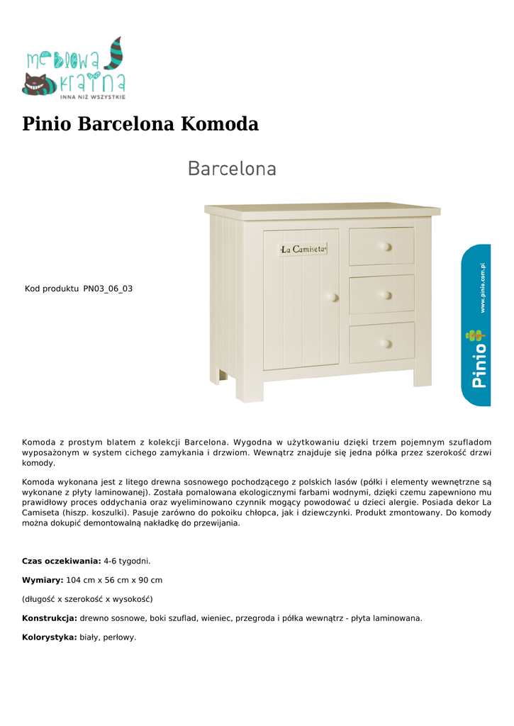 Pinio Barcelona Komoda Kod produktu PN03_06_03 Komoda z prostym blatem z kolekcji Barcelona. Wygodna w użytkowaniu dzięki trzem pojemnym szufladom wyposażonym w system cichego zamykania i drzwiom. Wewnątrz znajduje się jedna półka przez szerokość drzwi komody. Komoda wykonana jest z litego drewna sosnowego pochodzącego z polskich lasów (półki i elementy wewnętrzne są wykonane z płyty laminowanej). Została pomalowana ekologicznymi farbami wodnymi, dzięki czemu zapewniono mu prawidłowy proces oddychania oraz wyeliminowano czynnik mogący powodować u dzieci alergie. Posiada dekor La Camiseta (hiszp. koszulki). Pasuje zarówno do pokoiku chłopca, jak i dziewczynki. Produkt zmontowany. Do komody można dokupić demontowalną nakładkę do przewijania. Czas oczekiwania: 4-6 tygodni. Wymiary: 104 cm x 56 cm x 90 cm (długość x szerokość x wysokość) Konstrukcja: drewno sosnowe, boki szuflad, wieniec, przegroda i półka wewnątrz - płyta laminowana. Kolorystyka: biały, perłowy. Gwarancja: 24 miesiące. Mebel jest zmontowany.
