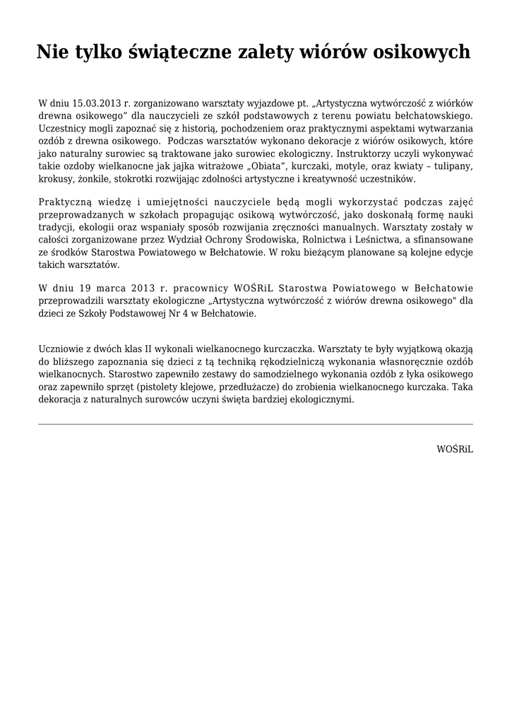 Nie tylko świąteczne zalety wiórów osikowych W dniu 15.03.2013 r. zorganizowano warsztaty wyjazdowe pt. „Artystyczna wytwórczość z wiórków drewna osikowego” dla nauczycieli ze szkół podstawowych z terenu powiatu bełchatowskiego. Uczestnicy mogli zapoznać się z historią, pochodzeniem oraz praktycznymi aspektami wytwarzania ozdób z drewna osikowego. Podczas warsztatów wykonano dekoracje z wiórów osikowych, które jako naturalny surowiec są traktowane jako surowiec ekologiczny. Instruktorzy uczyli wykonywać takie ozdoby wielkanocne jak jajka witrażowe „Obiata”, kurczaki, motyle, oraz kwiaty – tulipany, krokusy, żonkile, stokrotki rozwijając zdolności artystyczne i kreatywność uczestników. Praktyczną wiedzę i umiejętności nauczyciele będą mogli wykorzystać podczas zajęć przeprowadzanych w szkołach propagując osikową wytwórczość, jako doskonałą formę nauki tradycji, ekologii oraz wspaniały sposób rozwijania zręczności manualnych. Warsztaty zostały w całości zorganizowane przez Wydział Ochrony Środowiska, Rolnictwa i Leśnictwa, a sfinansowane ze środków Starostwa Powiatowego w Bełchatowie. W roku bieżącym planowane są kolejne edycje takich warsztatów. W dniu 19 marca 2013 r. pracownicy WOŚRiL Starostwa Powiatowego w Bełchatowie przeprowadzili warsztaty ekologiczne „Artystyczna wytwórczość z wiórów drewna osikowego" dla dzieci ze Szkoły Podstawowej Nr 4 w Bełchatowie. Uczniowie z dwóch klas II wykonali wielkanocnego kurczaczka. Warsztaty te były wyjątkową okazją do bliższego zapoznania się dzieci z tą techniką rękodzielniczą wykonania własnoręcznie ozdób wielkanocnych. Starostwo zapewniło zestawy do samodzielnego wykonania ozdób z łyka osikowego oraz zapewniło sprzęt (pistolety klejowe, przedłużacze) do zrobienia wielkanocnego kurczaka. Taka dekoracja z naturalnych surowców uczyni święta bardziej ekologicznymi. WOŚRiL