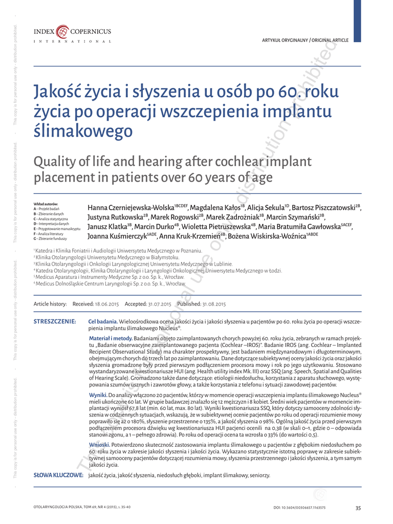 - ed . ibu tio np roh ibit Jakość życia i słyszenia u osób po 60. roku życia po operacji wszczepienia implantu ślimakowego Hanna Czerniejewska-Wolska1BCDEF, Magdalena Kałos1B, Alicja Sekula1D, Bartosz Piszczatowski2B, Justyna Rutkowska2B, Marek Rogowski2B, Marek Zadrożniak3B, Marcin Szymański3B, Janusz Klatka3B, Marcin Durko4B, Wioletta Pietruszewska4B, Maria Bratumiła Gawłowska5ACEF, Joanna Kuśmierczyk5ADE, Anna Kruk-Krzemień6B, Bożena Wiskirska-Woźnica1ABDE nly Wkład autorów: A – Projekt badań B – Zbieranie danych C – Analiza statystyczna D – Interpretacja danych E – Przygotowanie manuskryptu F – Analiza literatury G – Zbieranie funduszy -d istr Quality of life and hearing after cochlear implant placement in patients over 60 years of age eo This copy is for personal use only - distribution prohibited. This copy is for personal use only - distribution prohibited. - artykuł oryginalny / original article Katedra i Klinika Foniatrii i Audiologii Uniwersytetu Medycznego w Poznaniu. Klinika Otolaryngologii Uniwersytetu Medycznego w Białymstoku. 3 Klinika Otolaryngologii i Onkologii Laryngologicznej Uniwersytetu Medycznego w Lublinie. 4 Katedra Otolaryngologii, Klinika Otolaryngologii i Laryngologii Onkologicznej Uniwersytetu Medycznego w Łodzi. 5 Medicus Aparatura i Instrumenty Medyczne Sp. z o.o. Sp. k., Wrocław. 6 Medicus Dolnośląskie Centrum Laryngologii Sp. z o.o. Sp. k., Wrocław. 1 us al on Article history: Received: 18.06.2015 Accepted: 31.07.2015 Published: 31.08.2015 pe rs STRESZCZENIE: Cel badania. Wieloośrodkowa ocena jakości życia i jakości słyszenia u pacjentów po 60. roku życia po operacji wszczepienia implantu ślimakowego Nucleus®. y is for Materiał i metody. Badaniami objęto zaimplantowanych chorych powyżej 60. roku życia, zebranych w ramach projektu „Badanie obserwacyjne zaimplantowanego pacjenta (Cochlear –IROS)”. Badanie IROS (ang. Cochlear – Implanted Recipient Observational Study) ma charakter prospektywny, jest badaniem międzynarodowym i długoterminowym, obejmującym chorych do trzech lat po zaimplantowaniu. Dane dotyczące subiektywnej oceny jakości życia oraz jakości słyszenia gromadzone były przed pierwszym podłączeniem procesora mowy i rok po jego użytkowaniu. Stosowano wystandaryzowane kwestionariusze HUI (ang. Health utility index Mk. III) oraz SSQ (ang. Speech, Spatial and Qualities of Hearing Scale). Gromadzono także dane dotyczące: etiologii niedosłuchu, korzystania z aparatu słuchowego, występowania szumów usznych i zawrotów głowy, a także korzystania z telefonu i sytuacji zawodowej pacjentów. is c op Wyniki. Do analizy włączono 20 pacjentów, którzy w momencie operacji wszczepienia implantu ślimakowego Nucleus® mieli ukończone 60 lat. W grupie badawczej znalazło się 12 mężczyzn i 8 kobiet. Średni wiek pacjentów w momencie implantacji wyniósł 67,8 lat (min. 60 lat, max. 80 lat). Wyniki kwestionariusza SSQ, który dotyczy samooceny zdolności słyszenia w codziennych sytuacjach, wskazują, że w subiektywnej ocenie pacjentów po roku od operacji rozumienie mowy poprawiło się aż o 180%, słyszenie przestrzenne o 135%, a jakość słyszenia o 98%. Ogólną jakość życia przed pierwszym podłączeniem procesora dźwięku wg kwestionariusza HUI pacjenci ocenili na 0,38 (w skali 0–1, gdzie 0 – odpowiada stanowi zgonu, a 1 – pełnego zdrowia). Po roku od operacji ocena ta wzrosła o 33% (do wartości 0,5). Th Wnioski. Potwierdzono skuteczność zastosowania implantu ślimakowego u pacjentów z głębokim niedosłuchem po 60. roku życia w zakresie jakości słyszenia i jakości życia. Wykazano statystycznie istotną poprawę w zakresie subiektywnej samooceny pacjentów dotyczącej rozumienia mowy, słyszenia przestrzennego i jakości słyszenia, a tym samym jakości życia. SŁOWA KLUCZOWE: jakość życia, jakość słyszenia, niedosłuch głęboki, implant ślimakowy, seniorzy. - This copy is for personal use only - distribution prohibited. - This copy is for personal use only - distribution prohibited. 2 OTOLARYNGOLOGIA POLSKA, TOM 69, NR 4 (2015), s. 35-40 DOI: 10.5604/00306657.1163575 35 - ed . ibu tio np roh ibit patients over 60 years of age. Reference and Method. Evaluation was performed in patients receiving cochlear implants after the age of 60 years as a part of the Cochlear-Implanted Recipient Observational Study (Cochlear-IROS). This study is a prospective, international and long-term assessment which enables observation of recipients for up to three years after implantation. Data regarding subjective evaluation of the quality of life and quality of hearing were gathered before the first switch-on of the sound processor and one year afterwards. Standardized questionnaires were used in this evaluation, including Health Utility Index (HUI Mk.. III) and Speech, Spatial and Qualities of Hearing (SSQ) Scale. Data were also gathered regarding the aetiology of hearing loss, hearing aid usage, tinnitus and vertigo, as well as on the telephone usage and the professional status of recipients. -d istr Results. Included in the evaluation, were 20 subjects who were over 60 years old at the moment of the cochlear implant surgery. The study group consisted of 12 male and 8 female patients. The average age of CI recipients at the moment of implantation was 67.8 years (min. 60, max. 80 years). The SSQ questionnaire outcomes regarding self-assessment in the field of ability to hear in everyday situations one year after the surgery indicate that speech understanding increased by 180%, spatial hearing increased by 135 % and quality of hearing increased by 98%. Overall quality of life before the first sound processor switch-on as assessed using the HUI questionnaire was at the level of 0.38 (on 0-1 scale, where 0 equals death, and 1 equals full health). One year after the implantation, this assessment increased by 33% (up to 0.5 on the scale). KEY WORDS: nly Conclusion. 
