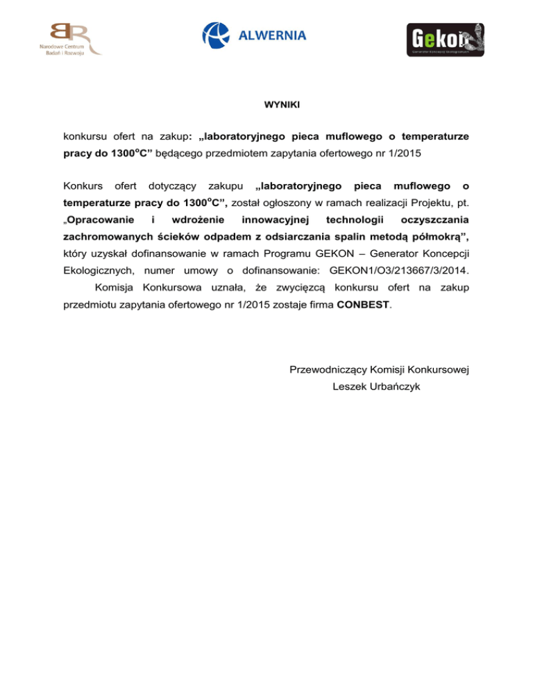 WYNIKI konkursu ofert na zakup: „laboratoryjnego pieca muflowego o temperaturze pracy do 1300oC” będącego przedmiotem zapytania ofertowego nr 1/2015 Konkurs ofert dotyczący zakupu „laboratoryjnego pieca muflowego o temperaturze pracy do 1300oC”, został ogłoszony w ramach realizacji Projektu, pt. „Opracowanie i wdrożenie innowacyjnej technologii oczyszczania zachromowanych ścieków odpadem z odsiarczania spalin metodą półmokrą”, który uzyskał dofinansowanie w ramach Programu GEKON – Generator Koncepcji Ekologicznych, numer umowy o dofinansowanie: GEKON1/O3/213667/3/2014. Komisja Konkursowa uznała, że zwycięzcą konkursu ofert na zakup przedmiotu zapytania ofertowego nr 1/2015 zostaje firma CONBEST. Przewodniczący Komisji Konkursowej Leszek Urbańczyk