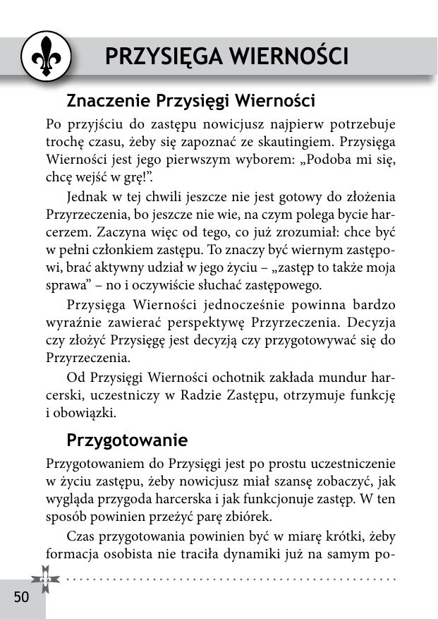 Przysięga Wierności Znaczenie Przysięgi Wierności Po przyjściu do zastępu nowicjusz najpierw potrzebuje trochę czasu, żeby się zapoznać ze skautingiem. Przysięga Wierności jest jego pierwszym wyborem: „Podoba mi się, chcę wejść w grę!”. Jednak w tej chwili jeszcze nie jest gotowy do złożenia Przyrzeczenia, bo jeszcze nie wie, na czym polega bycie harcerzem. Zaczyna więc od tego, co już zrozumiał: chce być w pełni członkiem zastępu. To znaczy być wiernym zastępowi, brać aktywny udział w jego życiu – „zastęp to także moja sprawa” – no i oczywiście słuchać zastępowego. Przysięga Wierności jednocześnie powinna bardzo wyraźnie zawierać perspektywę Przyrzeczenia. Decyzja czy złożyć Przysięgę jest decyzją czy przygotowywać się do Przyrzeczenia. Od Przysięgi Wierności ochotnik zakłada mundur harcerski, uczestniczy w Radzie Zastępu, otrzymuje funkcję i obowiązki. Przygotowanie Przygotowaniem do Przysięgi jest po prostu uczestniczenie w życiu zastępu, żeby nowicjusz miał szansę zobaczyć, jak wygląda przygoda harcerska i jak funkcjonuje zastęp. W ten sposób powinien przeżyć parę zbiórek. Czas przygotowania powinien być w miarę krótki, żeby formacja osobista nie traciła dynamiki już na samym po50 czątku. Nowicjusz powinien złożyć Przysięgę na najbliższym biwaku drużyny, jednak nie później niż 1-2 miesiące po wejściu do drużyny, u byłych wilczków jeszcze wcześniej. Przed Przysięgą odbywa się Rada Zastępu, która wyraża zgodę na przyjęcie nowego członka zastępu. Obrzęd Obrzęd odbywa się na apelu drużyny.* Przysięgę może odbierać tylko zastępowy mianowany. Kandydat przychodzi w mundurze ze wszystkimi naszywkami, bez chusty i nawęzu zastępu. Najpierw drużynowy tłumaczy znaczenie obrzędu. Zastępowy przedstawia nowego członka swego zastępu lub, jeżeli był wilczkiem i został już przedstawiony podczas przejścia, ogłasza, że dany chło pak zdecydował się złożyć Przysięgę Wierności. (Dialog jest przykła dowy, drużynowy i zastępowy mówią własnymi słowami.) Drużynowy: W naszej drużynie pojawiło się kilku nowych chłopców, którzy chcą zostać ochotnikami i przygotować się do Przyrzeczenia. Zastępowy: Przedstawiam wam N. (imię), który chce wstąpić do zastępu Z. (nazwa zastępu). Przedstawiony kandydat występuje krok do przodu. Drużynowy: Bardzo się cieszę. Niech swoje pragnienie potwierdzi Przysięgą Wierności swojemu zastępowemu. Zastępowy podchodzi do drużynowego, bierze od niego chustę(y), po tem występuje na środek kwadratu (plecami do linii szefów), stawia przed sobą proporzec i kładzie na nim swoją lewą dłoń. Kandydat podchodzi i staje naprzeciw zastępowego. Kładzie na dłoni zastę 51 powego swoją prawą dłoń. Zastępowy zamyka ją gestem wierności poprzez nakrycie swoją prawą dłonią. Kandydat: Przyrzekam być ci posłusznym jako mojemu wodzowi (mojej zastępowej), być wiernym zastępowi Z. (nazwa zastępu) i pracować z tobą każdego dnia, by lepiej poznać Prawo Harcerskie, moją Ojczyznę i moją wiarę. Zastępowy: Możesz na mnie polegać. Następnie zastępowy przyczepia ochotnikowi nawęz zastępu, po czym zakłada mu chustę szczepu. Po tym ochotnik i zastępowy wra cają na swoje miejsce. Zastęp wita nowego członka okrzykiem. Gdy Przysięgę Wierności składa kilku kandydatów razem, najpierw są przedstawiani kandydaci ze wszystkich zastępów. Do obrzędu przystępują razem kandydaci z jednego zastępu, tekst Przysięgi jed nak każdy mówi sam. Następnie kolejny zastęp. Przysięga Wierności odbywa się także po mianowaniu nowego zastę powego (bez przedstawiania i bez przyczepiania nawęzów). Na zakończenie obrzędu Przysięgi Wierności zastępowi oraz szefo wie zawsze odmawiają Modlitwę zastępowego. * Przysięga Wierności może się także odbywać na zbiórce zastępu – wtedy drużynowy powinien być obecny na takiej zbiórce. Możliwy jest także inny wariant: obrzęd Przysięgi Wierności odbywa się tuż przed apelem w gronie samego zastępu w odosobnionym miej scu. Bezpośrednio po nim następuje apel drużyny, podczas którego drużynowy wręcza chustę szczepu (w ten sam sposób jak stopnie). Podobnie w przypadku mianowania nowego zastępowego, Przysięga Wierności może nastąpić bezpośrednio po apelu drużyny, w gronie samego zastępu w odosobnionym miejscu. 52