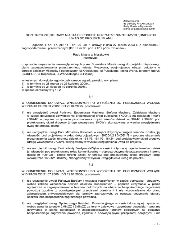 Załącznik nr 3 do Uchwały Nr XXIV/212/08 Rady Miasta w Myszkowie z dnia 29 października 2008r. ROZSTRZYGNIĘCIE RADY MIASTA O SPOSOBIE ROZPATRZENIA NIEUWZGLĘDNIONYCH UWAG DO PROJEKTU PLANU Zgodnie z art. 17. pkt 14 i art. 20 ust. 1 ustawy z dnia 27 marca 2003 r. o planowaniu i zagospodarowaniu przestrzennym (Dz. U. nr 80. poz. 717 z późn. zmianami), Rada Miasta w Myszkowie rozstrzyga: o sposobie rozpatrzenia nieuwzględnionych przez Burmistrza Miasta uwag do projektu miejscowego planu zagospodarowania przestrzennego miasta Myszkowa, obejmującego obszar połoŜony w obrębie dzielnicy Mijaczów i ograniczony: ul.Krasickiego, ul.Pułaskiego, rzeką Wartą, terenem fabryki „SOKPOL”, ul.Kopernika, ul.Waryńskiego i ul.Piękną wniesionych do wyłoŜonego do publicznego wglądu projektu ww. planu: 1) w terminie od 28 marca do 25 kwietnia 2008r., 2) w terminie od 21 lipca do 19 sierpnia 2008r., w sposób określony w § 1 i 2. §1 W ODNIESIENIU DO UWAG, WNIESIONYCH PO WYŁOśENIU DO PUBLICZNEGO WGLĄDU W DNIACH OD 28.03.2008r. DO 25.04.2008r. postanawia: 1) nie uwzględnić uwagi Państwa: Eugeniusza Machura, Stefana Machura, Zdzisława Machura w części dotyczącej zlikwidowania projektowanej drogi publicznej 5KDD1/2 na działkach 1490/1 i 9974/1 – poprzez utrzymanie przeznaczenia części terenów działek nr 9974/1 i 9948/1 pod projektowany układ drogowy (drogę wewnętrzną 8KDW), skorygowany w wyniku uwzględnienia uwag do projektu planu. 2) nie uwzględnić uwagi Pani Mirosławy Kwiecień w części dotyczącej zajęcia terenów działek, jej własności pod projektowany układ dróg dojazdowych 2KDD1/2 i 3KDD1/2 – poprzez utrzymanie przeznaczenia części terenów działek nr 1641/5, 1641/3, 1642/1 pod projektowany układ drogowy (drogę wewnętrzną 7KDW), skorygowany w wyniku uwzględnienia uwag do projektu. 3) nie uwzględnić uwagi Pani Jolanty Ferdynand-Zięba w części dotyczącej zajęcia terenów działek jej własności pod projektowany układ komunikacyjny – poprzez utrzymanie przeznaczenia i terenu działki nr 10019/8 i części terenu działki nr 9964/3 pod projektowany układ drogowy (drogi wewnętrzne 16KDW i 8KDW), skorygowany w wyniku uwzględnienia uwag do projektu. §2 W ODNIESIENIU DO UWAG, WNIESIONYCH PO WYŁOśENIU DO PUBLICZNEGO WGLĄDU W DNIACH OD 21.07.2008r. DO 19.08.2008r. postanawia: 1) nie uwzględnić uwagi Państwa Barbary i Andrzeja Kaczyńskich w części dotyczącej sprzeciwu wobec zakazu wznoszenia nowych obiektów budowlanych – poprzez utrzymanie w planie ograniczeń w zagospodarowaniu terenów połoŜonych na obszarze bezpośredniego zagroŜenia powodzią zgodnie z obowiązującymi przepisami odrębnymi i nie wprowadzanie do planu zabezpieczeń antypowodziowych dla terenów zagroŜonych, co oznacza utrzymanie statusu obszaru jako bezpośrednio zagroŜonego powodzią. 2) nie uwzględnić uwagi Społecznego Komitetu Protestacyjnego w części dotyczącej sprzeciwu wobec uznania terenów 2MN/ZZ i 3MN/ZZ za tereny zalewowe i zagroŜone powodzią – poprzez utrzymanie w planie ograniczeń w zagospodarowaniu terenów połoŜonych na obszarze bezpośredniego zagroŜenia powodzią zgodnie z obowiązującymi przepisami odrębnymi i nie -1- wprowadzanie do planu zabezpieczeń antypowodziowych dla terenów zagroŜonych, co oznacza utrzymanie statusu obszaru jako bezpośrednio zagroŜonego powodzią. 3) nie uwzględnić uwagi Pani Jolanty Ferdynand-Zięba dotyczącej braku zgody na poprowadzenie drogi wewnętrznej przez teren działki nr 10019/8 i fragment działki nr 9954/3 – poprzez utrzymanie w planie przebiegu projektowanych dróg wewnętrznych 16KDW i 8KDW. §3 1. Uwag dotyczących projektowanego układu komunikacyjnego nie uwzględnia się ze względu na potrzebę zapewnienia dojazdu projektowanym terenom zabudowy mieszkaniowej. Drogi winny umoŜliwić sprawne funkcjonowanie układu komunikacyjnego oraz zapewniać bezpieczeństwo publiczne, w tym przeciwpoŜarowe. Brak wskazania rezerw terenowych na potrzeby dróg (co oznacza moŜliwość realizacji innej zabudowy) powoduje nieodwracalne skutki dla przyszłej zabudowy i moŜliwości zapewnienia jej dojazdu. Zgodnie z wymogiem art.15, ust.2, pkt10) ustawy o planowaniu i zagospodarowaniu przestrzennym plan winien obowiązkowo określić zasady modernizacji, rozbudowy i budowy systemu komunikacji. Przedstawiony w planie przebieg projektowanych dróg publicznych i wewnętrznych jest kompromisem osiągniętym w wyniku rozstrzygnięć uwag wniesionych po pierwszym wyłoŜeniu projektu planu do publicznego wglądu, w większości zaakceptowanym w trakcie ponownego wyłoŜenia. 2. Uwag dotyczących obszaru bezpośredniego zagroŜenia powodzią nie uwzględnia się ze względu na obowiązujące regulacje prawne: a) zgodnie z art. 15 ust.2, pkt 7) ustawy z dnia 27 marca 2003r. o planowaniu i zagospodarowaniu przestrzennym w planie miejscowym określa się obowiązkowo granice i sposoby zagospodarowania terenów naraŜonych na niebezpieczeństwo powodzi, b) Zgodnie z art. 40, ust.1 i art.82, ust.2 ustawy z dnia 18 lipca 2001r. Prawo wodne zagospodarowanie obszarów bezpośredniego zagroŜenia powodzią poddane jest ograniczeniom włącznie z zakazem wznoszenia obiektów budowlanych. Za podstawę ustaleń planu posłuŜyły dostarczone przez Regionalny Zarząd Gospodarki Wodnej w Poznaniu materiały ze studium granic bezpośredniego zagroŜenia powodzią dla Warty. -2-