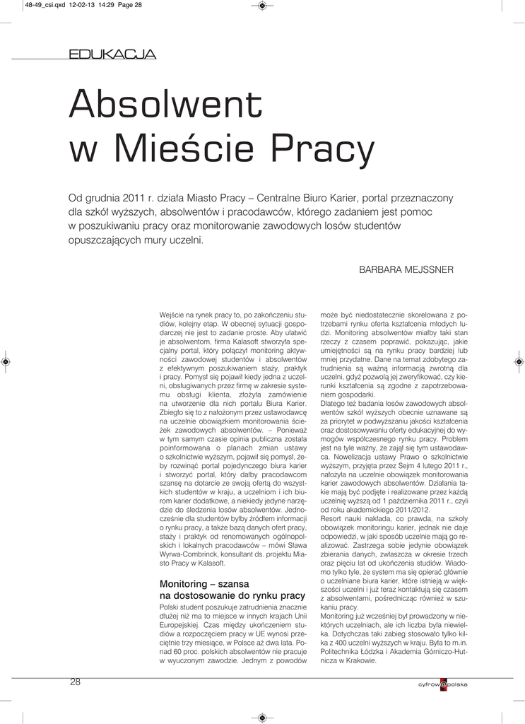 48-49_csi.qxd 12-02-13 14:29 Page 28 edukacja Absolwent w Mieście Pracy Od grudnia 2011 r. działa Miasto Pracy – Centralne Biuro Karier, portal przeznaczony dla szkół wyższych, absolwentów i pracodawców, którego zadaniem jest pomoc w poszukiwaniu pracy oraz monitorowanie zawodowych losów studentów opuszczających mury uczelni. BARBARA MEJSSNER Wejście na rynek pracy to, po zakończeniu studiów, kolejny etap. W obecnej sytuacji gospodarczej nie jest to zadanie proste. Aby ułatwić je absolwentom, firma Kalasoft stworzyła specjalny portal, który połączył monitoring aktywności zawodowej studentów i absolwentów z efektywnym poszukiwaniem staży, praktyk i pracy. Pomysł się pojawił kiedy jedna z uczelni, obsługiwanych przez firmę w zakresie systemu obsługi klienta, złożyła zamówienie na utworzenie dla nich portalu Biura Karier. Zbiegło się to z nałożonym przez ustawodawcę na uczelnie obowiązkiem monitorowania ścieżek zawodowych absolwentów. – Ponieważ w tym samym czasie opinia publiczna została poinformowana o planach zmian ustawy o szkolnictwie wyższym, pojawił się pomysł, żeby rozwinąć portal pojedynczego biura karier i stworzyć portal, który dałby pracodawcom szansę na dotarcie ze swoją ofertą do wszystkich studentów w kraju, a uczelniom i ich biurom karier dodatkowe, a niekiedy jedyne narzędzie do śledzenia losów absolwentów. Jednocześnie dla studentów byłby źródłem informacji o rynku pracy, a także bazą danych ofert pracy, staży i praktyk od renomowanych ogólnopolskich i lokalnych pracodawców – mówi Sława Wyrwa-Combrinck, konsultant ds. projektu Miasto Pracy w Kalasoft. Monitoring – szansa na dostosowanie do rynku pracy Polski student poszukuje zatrudnienia znacznie dłużej niż ma to miejsce w innych krajach Unii Europejskiej. Czas między ukończeniem studiów a rozpoczęciem pracy w UE wynosi przeciętnie trzy miesiące, w Polsce aż dwa lata. Ponad 60 proc. polskich absolwentów nie pracuje w wyuczonym zawodzie. Jednym z powodów 28 może być niedostatecznie skorelowana z potrzebami rynku oferta kształcenia młodych ludzi. Monitoring absolwentów miałby taki stan rzeczy z czasem poprawić, pokazując, jakie umiejętności są na rynku pracy bardziej lub mniej przydatne. Dane na temat zdobytego zatrudnienia są ważną informacją zwrotną dla uczelni, gdyż pozwolą jej zweryfikować, czy kierunki kształcenia są zgodne z zapotrzebowaniem gospodarki. Dlatego też badania losów zawodowych absolwentów szkół wyższych obecnie uznawane są za priorytet w podwyższaniu jakości kształcenia oraz dostosowywaniu oferty edukacyjnej do wymogów współczesnego rynku pracy. Problem jest na tyle ważny, że zajął się tym ustawodawca. Nowelizacja ustawy Prawo o szkolnictwie wyższym, przyjęta przez Sejm 4 lutego 2011 r., nałożyła na uczelnie obowiązek monitorowania karier zawodowych absolwentów. Działania takie mają być podjęte i realizowane przez każdą uczelnię wyższą od 1 października 2011 r., czyli od roku akademickiego 2011/2012. Resort nauki nakłada, co prawda, na szkoły obowiązek monitoringu karier, jednak nie daje odpowiedzi, w jaki sposób uczelnie mają go realizować. Zastrzega sobie jedynie obowiązek zbierania danych, zwłaszcza w okresie trzech oraz pięciu lat od ukończenia studiów. Wiadomo tylko tyle, że system ma się opierać głównie o uczelniane biura karier, które istnieją w większości uczelni i już teraz kontaktują się czasem z absolwentami, pośrednicząc również w szukaniu pracy. Monitoring już wcześniej był prowadzony w niektórych uczelniach, ale ich liczba była niewielka. Dotychczas taki zabieg stosowało tylko kilka z 400 uczelni wyższych w kraju. Była to m.in. Politechnika Łódzka i Akademia Górniczo-Hutnicza w Krakowie. 48-49_csi.qxd 12-02-13 14:30 Page 29 edukacja OdwiedzajcieMiastoPracy Taką szansę daje portal Miasto Pracy – Centralne Biuro Karier (www.miasto-pracy.pl) stworzony przez firmę Kalasoft – producenta oprogramowania dla uczelni. Miasto Pracy to, jak na razie, unikalne rozwiązanie na polskim rynku. Portal rozpoczął działalność niedawno, 7 grudnia 2011 r., i działa na zasadzie centralnego portalu, z którego mogą korzystać lokalne biura karier. Jest przeznaczony dla studentów, szkół wyższych, instytucji publicznych i niepublicznych, pracodawców i agencji pośrednictwa pracy. Zapewnia płynną komunikację pomiędzy wszystkimi zainteresowanymi stronami. Dostęp do rodzaju usług jest zależny od strefy, w której użytkownik zostanie zarejestrowany i zalogowany, czyli od tego, czy jest studentem, pracodawcą czy uczelnią. Użytkownikami portalu mogą być studenci korzystający z lokalnych biur karier zarejestrowani w systemie eHMS (system Kalasoft do obsługi szkół wyższych), z którego korzystają szkoły zintegrowane z portalem. Jest to niezbędne, ponieważ rejestracja użytkownika na Mieście Pracy wiąże się z logowaniem studenta w wirtualnym dziekanacie uczelni, z którego pobierane są dane, a potem z przejściem do portalu. Taki proces rejestracji daje gwarancję wiarygodnych danych ze strony kandydata. Ma to umożliwić pracodawcom dostęp do zweryfikowanych danych potencjalnych pracowników. – Uczelnie, które w pierwszej kolejności chcemy zainteresować portalem, to użytkownicy eHMS, z tego względu, że portal jest już w chwili obecnej przygotowany na integrację z tym modułem, co jednocześnie umożliwia studentom i absolwentom rejestrację na portalu już dziś. W niedalekiej przyszłości planujemy umożliwić integrację portalu z innymi systemami, których używają uczelnie do obsługi studenta – mówi Sława Wyrwa-Combrinck. Biura karier poszczególnych uczelni mają możliwość logowania się na stronie i spraw- dzania, ilu studentów uczelni założyło konta na Mieście Pracy, mają również dostęp do statystyk dotyczących studentów, którzy odpowiedzieli na oferty