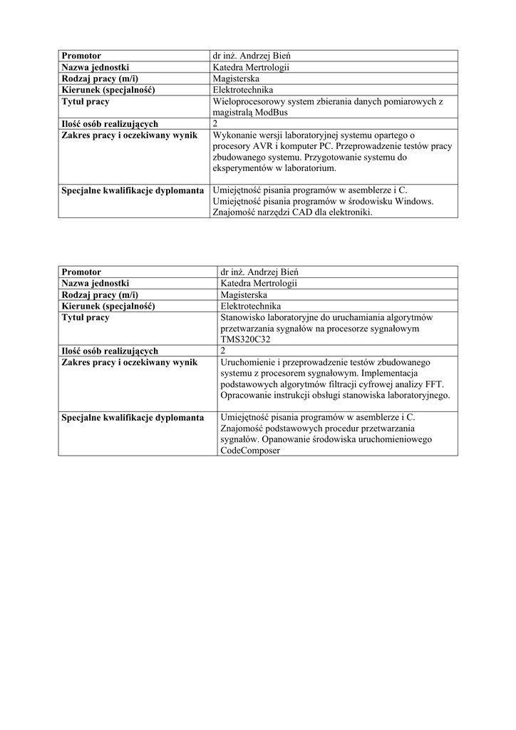 Promotor Nazwa jednostki Rodzaj pracy (m/i) .LHUXQHNVSHFMDOQRü 7\WXáSUDF\ ,ORüRVyEUHDOL]XMF\FK Zakres pracy i oczekiwany wynik GULQ*$QGU]HM%LH Katedra Mertrologii Magisterska Elektrotechnika Wieloprocesorowy system zbierania danych pomiarowych z PDJLVWUDO0RG%XV 2 Wykonanie wersji laboratoryjnej systemu opartego o procesory AVR i komputer PC. Przeprowadzenie testów pracy zbudowanego systemu. Przygotowanie systemu do eksperymentów w laboratorium. Specjalne kwalifikacje dyplomanta 8PLHM WQRüSLVDQLDSURJUDPyZZDVHPEOHU]HL& 8PLHM WQRüSLVDQLDSURJUDPyZZURGRZLVNX:LQGRZV =QDMRPRüQDU] G]L&$'GODHOHNWURQLNL Promotor Nazwa jednostki Rodzaj pracy (m/i) Kierunek (VSHFMDOQRü 7\WXáSUDF\ ,ORüRVyEUHDOL]XMF\FK Zakres pracy i oczekiwany wynik Specjalne kwalifikacje dyplomanta GULQ*$QGU]HM%LH Katedra Mertrologii Magisterska Elektrotechnika Stanowisko laboratoryjne do uruchamiania algorytmów SU]HWZDU]DQLDV\JQDáyZQDSURFHVRU]HV\JQDáRZ\P TMS320C32 2 Uruchomienie i przeprowadzenie testów zbudowanego V\VWHPX]SURFHVRUHPV\JQDáRZ\P,PSOHPHQWDFMD podstawowych algorytmów filtracji cyfrowej analizy FFT. 2SUDFRZDQLHLQVWUXNFMLREVáXJLVWDQRZLVNDODERUDWRU\MQHJR 8PLHM WQRüSLVDQLDSURJUDPyZZDVHPEOHU]HL& =QDMRPRüSRGVWDZRZ\FKSURFHGXUSU]HWZDU]DQLD V\JQDáyZ2SDQRZDQLHURGRZLVNDXUXFKRPLHQLRZHJR CodeComposer Promotor Nazwa jednostki Rodzaj pracy (m/i) .LHUXQHNVSHFMDOQRü TyWXáSUDF\ ,ORüRVyEUHDOL]XMF\FK Zakres pracy i oczekiwany wynik Specjalne kwalifikacje dyplomanta GULQ*$QGU]HM%LH Katedra Mertrologii Magisterska Elektrotechnika Pomiar parametrów energii elektrycznej z wykorzystaniem dedykowanego systemu DSP 2 Wykonanie i przeprowadzenie prób systemu pomiarowego opartego o dedykowany system DSP firmy Crystal.6\VWHPE G]LH ZVSyáSUDFRZDá]NRPSXWHUHP3&]DSRPRF]áF]D86% 8PLHM WQRüSLVDQLDSURJUDPyZZDVHPEOHU]HL&8PLHM WQRü SLVDQLDSURJUDPyZZURGRZLVNX:LQGRZV=QDMRPRüQDU] G]L CAD dla elektroniki. Promotor Nazwa jednostki Rodzaj pracy (m/i) .LHUXQHNVSHFMDOQRü 7\WXáSUDF\ ,ORüRVyEUHDOL]XMF\FK Zakres pracy i oczekiwany wynik Specjalne kwalifikacje dyplomanta GULQ*$QGU]HM%LH Katedra Mertrologii Magisterska Elektrotechnika Stanowisko laboratoryjne do testów sytemu pomiarowego z procesorem AVR. 1 Uruchomienie i przeprowadzenie testów zbudowanego systemu z procesorem ATmega. Implementacja algorytmów pomiarowych i sterowania dla potrzeb laboratorium V\VWHPyZSRPLDURZ\FK2SUDFRZDQLHLQVWUXNFMLREVáXJL stanowiska laboratoryjnego. 8PLHM WQRüSLVDQLDSURJUDPyZZDVHPEOHU]HL& =QDMRPRüSRGVWDZRZ\FKSURFHGXUSU]HWZDU]DQLD V\JQDáyZ2SDQRZDQLHURGRZLVNDXUXFKRPLHQLRZHJRGOD procesorów AVR. Promotor Nazwa jednostki Rodzaj pracy (m/i) .LHUXQHNVSHFMDOQRü 7\WXáSUDF\ ,ORüRVyEUHDOL]XMF\FK Zakres pracy i oczekiwany wynik GULQ*$QGU]HM%LH Katedra Mertrologii Magisterska Elektrotechnika $QDOL]DGUJDNU\VWDOL]DWRUDOLQLLFLJáHJRRGOHZDQLDVWDOL 1 Przygotowanie iZ\NRQDQLHUHMHVWUDFMLGUJDIUDJPHQWyZ konstrukcji krystalizatora COS. Wykonanie analizy V\JQDáyZGUJDSUyEDRFHQ\VWDQXSUDF\NU\VWDOL]DWRUDZ RSDUFLXRSDUDPHWU\V\JQDáyZMHJRGUJD Specjalne kwalifikacje dyplomanta =QDMRPRüDOJRU\WPyZSU]HWZDU]DQLDV\JQDáyZLDQDOL]\ statystycznej. Promotor Nazwa jednostki Rodzaj pracy (m/i) .LHUXQHNVSHFMDOQRü 7\WXáSUDF\ GULQ*$QGU]HM%LH Katedra Mertrologii Magisterska Elektrotechnika Mikromocowy system pomiarowy z procesorem MSP430 do pracy w truGQ\FKZDUXQNDFKSU]HP\VáRZ\FK 1 Uruchomienie i przeprowadzenie testów zbudowanego systemu z procesorem MSP430. Opracowanie instrukcji REVáXJLVWDQRZLVNDODERUDWRU\MQHJRGRXUXFKDPLDQLD algorytmów pomiarowych. ,ORüRVyEUHDOL]XMF\FK Zakres pracy i oczekiwany wynik Specjalne kwalifikacje dyplomanta 8PLHM WQRüSLVDQLDSURJUDPyZZDVHPEOHU]HL& =QDMRPRüSRGVWDZRZ\FKSURFHGXUSU]HWZDU]DQLD V\JQDáyZ8PLHM WQRüSRVáXJLZDQLDVL QDU] G]LDPL&$' dla elektroniki. Promotor Nazwa jednostki Rodzaj pracy (m/i) .LHUXQHNVSHFMDOQRü 7\WXáSUDF\ ,ORüRVyEUHDOL]XMF\FK Zakres pracy i oczekiwany wynik GULQ*$QGU]HM%LH Katedra Mertrologii Magisterska Elektrotechnika, Automatyka i Robotyka Wieloprocesorowy system pozycjonowania modelu robota 2 Projekt wieloprocesorowego sytemu mikroprocesorowego opartego o procesory AVR. Uruchomienie i przeprowadzenie testów zbudowanego systemu pomiarów i sterowania. Specjalne kwalifikacje dyplomanta 8PLHM WQRüSLVDQLDSURJUDPyZZDVHPEOHU]HL& ZnajomoüSRGVWDZRZ\FKSURFHGXUSU]HWZDU]DQLD V\JQDáyZ8PLHM WQRüSRVáXJLZDQLDVL QDU] G]LDPL&$' dla elektroniki. Promotor Nazwa jednostki Rodzaj pracy (m/i) .LHUXQHNVSHFMDOQRü 7\WXáSUDF\ GULQ*$QGU]HM%LH Katedra Mertrologii ,Q*\QLHUVND Elektrotechnika Analiza dokumentów i procedur pomiarowych Z\NRU]\VW\ZDQ\FKGRRFHQ\MDNRFL]DVLODQLDHQHUJL HOHNWU\F]Q 1 Analiza dokumentów prawnych – norm stosowanych do RFHQ\MDNRFL]DVLODQLDHQHUJLHOHNWU\F]Q2SUDFRZDQLH PHWRG\NLSRVW SRZDQLDSU]\SRPLDUDFKRUD]DQDOL]DLFK wyników. ,ORüRVyEUHDOL]XMF\FK Zakres pracy i oczekiwany wynik Specjalne kwalifikacje dyplomanta Praca wymaga analizy sporej liczby dokumentów pisanych ZM ]\NXSROVNLPLDQJLHOVNLP Promotor Nazwa jednostki Rodzaj pracy (m/i) .LHUXQHNVSHFMDOQRü 7\WXáSUDF\ ,ORüRVyEUHDOL]XMF\FK Zakres pracy i oczekiwany wynik GULQ*$QGU]HM%LH Katedra Mertrologii ,Q*\QLHUVND Elektrotechnika &\IURZDLPSOHPHQWDFMDPRGHOXPLHUQLNDXFL*OLZRFL PLJRWDQLDZLDWáD 1 :\NRQDQLHPRGHOXPLHUQLNDXFL*OLZRFLPLJRWDQLDZLDWáD ZM ]\NX&6SUDZG]HQLHSRSUDZQRFLLPSOHPHQWDFML Specjalne kwalifikacje dyplomanta 8PLHM WQRüSURJUDPRZDQLDZM ]\NX&&3RGVWDZ\ ]QDMRPRFLDOJRU\WPyZF\IURZHJRSU]HWZDU]DQLDV\JQDáyZ Promotor Nazwa jednostki Rodzaj pracy (m/i) .LHUXQHNVSHFMDOQRü 7\WXáSUDF\ GULQ*$QGU]HM%LH Katedra Mertrologii ,Q*\QLHUVND Elektrotechnika )RUPDOQHLSUDZQHXZDUXQNRZDQLHSU]\U]GyZ pomiarowych.. 1 $QDOL]DGRNXPHQWyZSUDZQ\FKLQRUP]ZL]DQ\FK] SRPLDUDPL2SUDFRZDQLHPHWRG\NLSRVW SRZDQLDSU]\ SRPLDUDFK3U]\NáDTGRZHSURFHGXU\SRPLDURZH ,ORüRVyEUHDOL]XMF\FK Zakres pracy i oczekiwany wynik Specjalne kwalifikacje dyplomanta 'REUD]QDMRPRüSRGVWDZPHWURORJLL Promotor Nazwa jednostki Rodzaj pracy (m/i) .LHUXQHNVSHFMDOQRü 7\WXáSUDF\ ,ORüRVyEUHDOL]XMF\FK Zakres pracy i oczekiwany wynik S