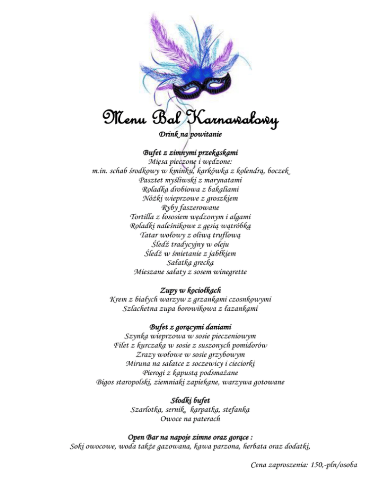 Menu Bal Karnawałowy Drink na powitanie Bufet z zimnymi przekąskami Mięsa pieczone i wędzone: m.in. schab środkowy w kminku, karkówka z kolendrą, boczek Pasztet myśliwski z marynatami Roladka drobiowa z bakaliami Nóżki wieprzowe z groszkiem Ryby faszerowane Tortilla z łososiem wędzonym i algami Roladki naleśnikowe z gęsią wątróbką Tatar wołowy z oliwą truflową Śledź tradycyjny w oleju Śledź w śmietanie z jabłkiem Sałatka grecka Mieszane sałaty z sosem winegrette Zupy w kociołkach Krem z białych warzyw z grzankami czosnkowymi Szlachetna zupa borowikowa z łazankami Bufet z gorącymi daniami Szynka wieprzowa w sosie pieczeniowym Filet z kurczaka w sosie z suszonych pomidorów Zrazy wołowe w sosie grzybowym Miruna na sałatce z soczewicy i cieciorki Pierogi z kapustą podsmażane Bigos staropolski, ziemniaki zapiekane, warzywa gotowane Słodki bufet Szarlotka, sernik, karpatka, stefanka Owoce na paterach Open Bar na napoje zimne oraz gorące : Soki owocowe, woda także gazowana, kawa parzona, herbata oraz dodatki, Cena zaproszenia: 150,-pln/osoba