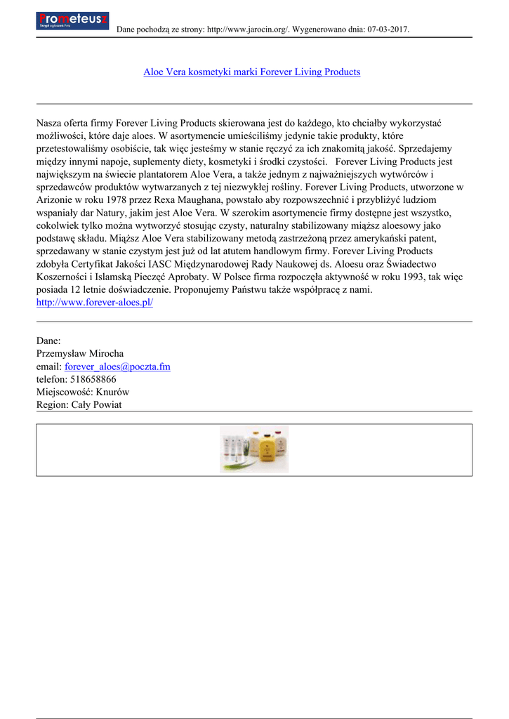 Dane pochodzą ze strony: http://www.jarocin.org/. Wygenerowano dnia: 07-03-2017. Aloe Vera kosmetyki marki Forever Living Products Nasza oferta firmy Forever Living Products skierowana jest do każdego, kto chciałby wykorzystać możliwości, które daje aloes. W asortymencie umieściliśmy jedynie takie produkty, które przetestowaliśmy osobiście, tak więc jesteśmy w stanie ręczyć za ich znakomitą jakość. Sprzedajemy między innymi napoje, suplementy diety, kosmetyki i środki czystości. Forever Living Products jest największym na świecie plantatorem Aloe Vera, a także jednym z najważniejszych wytwórców i sprzedawców produktów wytwarzanych z tej niezwykłej rośliny. Forever Living Products, utworzone w Arizonie w roku 1978 przez Rexa Maughana, powstało aby rozpowszechnić i przybliżyć ludziom wspaniały dar Natury, jakim jest Aloe Vera. W szerokim asortymencie firmy dostępne jest wszystko, cokolwiek tylko można wytworzyć stosując czysty, naturalny stabilizowany miąższ aloesowy jako podstawę składu. Miąższ Aloe Vera stabilizowany metodą zastrzeżoną przez amerykański patent, sprzedawany w stanie czystym jest już od lat atutem handlowym firmy. Forever Living Products zdobyła Certyfikat Jakości IASC Międzynarodowej Rady Naukowej ds. Aloesu oraz Świadectwo Koszerności i Islamską Pieczęć Aprobaty. W Polsce firma rozpoczęła aktywność w roku 1993, tak więc posiada 12 letnie doświadczenie. Proponujemy Państwu także współpracę z nami. http://www.forever-aloes.pl/ Dane: Przemysław Mirocha email: [email protected] telefon: 518658866 Miejscowość: Knurów Region: Cały Powiat