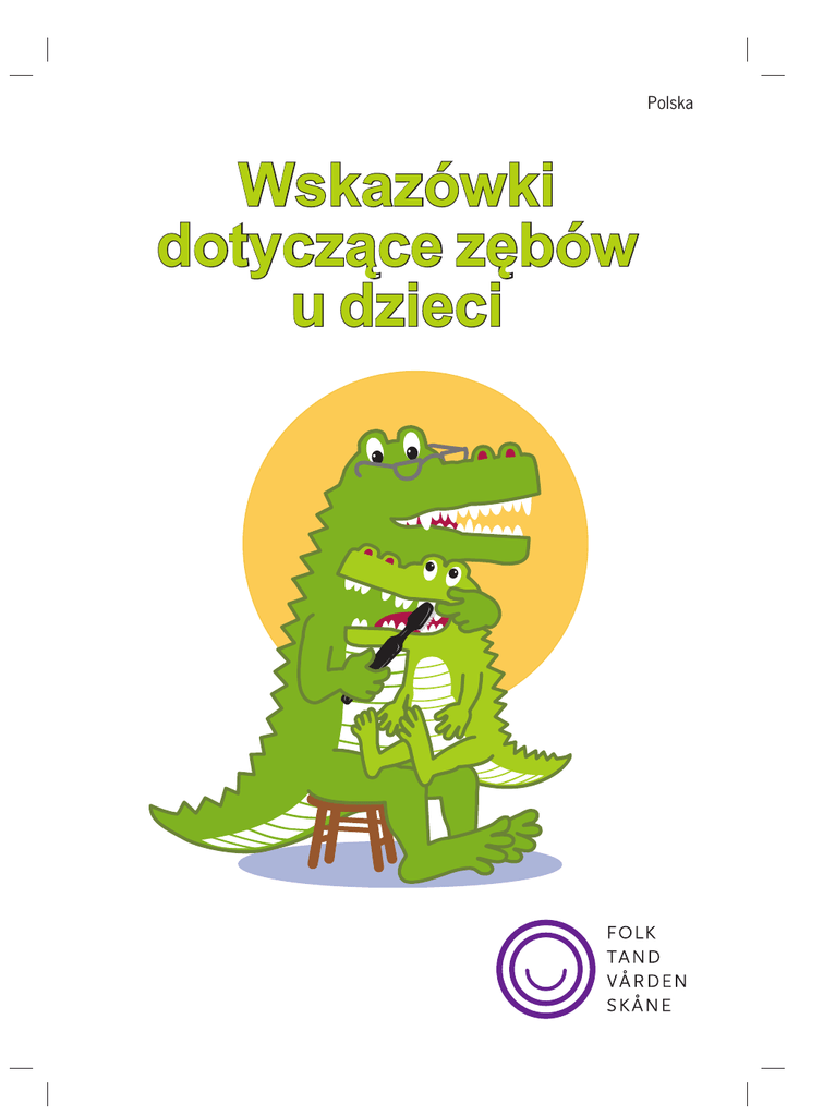 Polska Wskazówki dotyczące zębów u dzieci Zęby dzieci U małych dzieci dziury w zębach robią się łatwiej niż u dorosłych. Zawierające dużo cukru napoje i żywność, słodycze i pojadanie pomiędzy posiłkami są przyczyną powstawania dziur w zębach. Jedzenie i picie Należy przyzwyczaić dziecko do regularnego jedzenia posiłków – trzech posiłków głównych oraz drugiego śniadania i podwieczorku. Nie należy dziecku pozwalać na jedzenie pomiędzy posiłkami. Zęby po jedzeniu i piciu muszą „odpoczywać” przez kilka godzin. Należy także przyzwyczaić dziecko do gaszenia pragnienia wodą. Soki i słodzone napoje gazowane lepiej pić przy specjalnych okazjach, a nie każdego dnia. Podawanie dziecku słodkich napojów, soku lub mleka w butelce w nocy zwiększa ryzyko powstawania dziur w zębach dziecka, ponieważ słodkie płyny zalegają w buzi dłużej. Należy pamiętać o tym, że herbatniki, rodzynki i ciągliwe cukierki przyczepiają się do zębów i dłużej działają na ich powierzchnię. Nie można podawać ich dziecku każdego dnia. Częste karmienie (szczególnie w nocy) dziecka, któremu wyrosły już zęby zwiększa ryzyko powstania dziur w zębach. Mycie zębów Dziecko trzeba przyzwyczajać do mycia zębów od razu, kiedy pojawią się pierwsze zęby. Dziecko przed ukończeniem 8-10 lat nie potrafi samo wymyć zębów w wystarczająco staranny sposób. Należy mu pomóc w myciu zębów rano i wieczorem. Trzeba umyć szczoteczką powierzchnię żującą zębów. Zęby trzonowe nie mają równej powierzchni i wymagają starannego czyszczenia. Zęby należy szczotkować małymi ruchami wzdłuż linii dziąseł, gdzie zbiera się płytka nazębna. Należy używać małej i miękkiej szczotki do zębów. Duży wybór takich szczotek znajduje się w aptekach i sklepach spożywczych. Dziecko powinno spać z dobrze wyczyszczonymi zębami! Fluor wzmacnia zęby Fluor wzmacnia szkliwo zębów. Po ukończeniu pierwszego roku życia dzieci powinny zacząć myć zęby, używając do tego niewielkiej ilości pasty do zębów z fluorem. Zacznij szczotkować zęby twojego dziecka wraz z pojawieniem się pierwszego zęba. Stomatolog może zalecić przyjmowanie fluoru w postaci tabletek lub gumy do żucia, jeżeli dziecko tego potrzebuje. Czy masz własną studnię? Jeżeli wody ze studni używa się do odżywek dla niemowląt lub podaje małym dzieciom do picia, należy poddać ją analizie. Pomocy udzielą władze gminne (kommunkontoret). Kiedy pojawiają się zęby mleczne? 6-8 miesięcy Górna szczęka 8-12 miesięcy 14-16 miesięcy 17-19 miesięcy Dolna szczęka 23-30 miesięcy Dlaczego w zębach robią się dziury? Jeżeli codziennie nie myje się porządnie zębów, pokrywają się one grubą warstwą bakterii. Bakterie tworzą kwas wżerający się w zęby. Szczególnie dużo bakterii znajduje się w jamie ustnej dzieci, które często jedzą lub piją coś słodkiego. Kwas wgryza się w szkliwo zęba i powstaje dziura. Bakterie powodują także zapalenie dziąseł, które objawia się obrzękiem i krwawieniem podczas mycia zębów. Jeżeli dojdzie do wypadku Zdarza się, że dzieci upadają i uderzają się w zęby. Należy skontaktować się ze stomatologiem, jeżeli leci krew lub jeżeli jakiś ząb się rusza albo został wykrzywiony, wciśnięty głębiej lub wybity. Jeśli nie masz pewności, czy doszło do uszkodzenia zębów, skontaktuj się ze stomatologiem na wszelki wypadek! Nigdy nie należy wkładać z powrotem na miejsce wybitego zęba mlecznego! Jeżeli masz więcej pytań dotyczących zębów twojego dziecka, zadzwoń do Folktandvården (powszechnej opieki dentystycznej)! W razie potrzeby otrzymasz od nas porady i wskazówki na temat higieny jamy ustnej zarówno dla siebie, jak i dla twojego dziecka. Troszczymy się o zęby wszystkich, niezależnie od wieku. Przeczytaj więcej na stronie: www.folktandvardenskane.se Wydano na zlecenie: Folktandvården Skånes kansli (zarządu powszechnej opieki dentystycznej w Skåne), 2013. Tekst: Ulla Hallström. Opracowanie graficzne: Jacob de Maré. Ilustracje: Mathias Sköld.