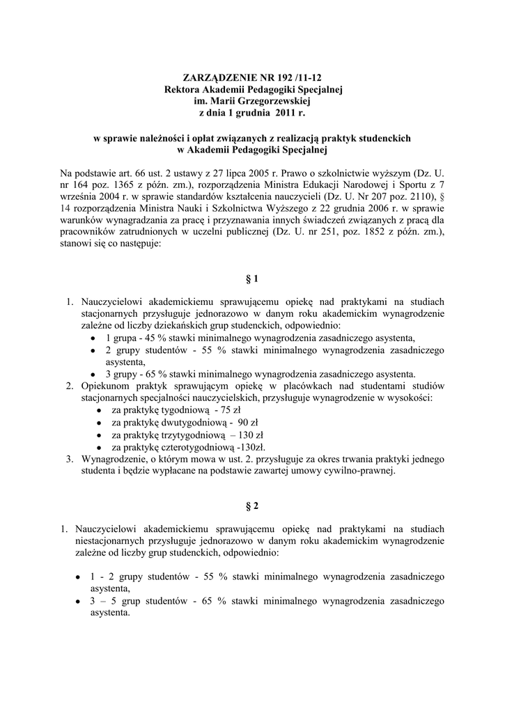 ZARZĄDZENIE NR 192 /11-12 Rektora Akademii Pedagogiki Specjalnej im. Marii Grzegorzewskiej z dnia 1 grudnia 2011 r. w sprawie należności i opłat związanych z realizacją praktyk studenckich w Akademii Pedagogiki Specjalnej Na podstawie art. 66 ust. 2 ustawy z 27 lipca 2005 r. Prawo o szkolnictwie wyższym (Dz. U. nr 164 poz. 1365 z późn. zm.), rozporządzenia Ministra Edukacji Narodowej i Sportu z 7 września 2004 r. w sprawie standardów kształcenia nauczycieli (Dz. U. Nr 207 poz. 2110), § 14 rozporządzenia Ministra Nauki i Szkolnictwa Wyższego z 22 grudnia 2006 r. w sprawie warunków wynagradzania za pracę i przyznawania innych świadczeń związanych z pracą dla pracowników zatrudnionych w uczelni publicznej (Dz. U. nr 251, poz. 1852 z późn. zm.), stanowi się co następuje: §1 1. Nauczycielowi akademickiemu sprawującemu opiekę nad praktykami na studiach stacjonarnych przysługuje jednorazowo w danym roku akademickim wynagrodzenie zależne od liczby dziekańskich grup studenckich, odpowiednio: 1 grupa - 45 % stawki minimalnego wynagrodzenia zasadniczego asystenta, 2 grupy studentów - 55 % stawki minimalnego wynagrodzenia zasadniczego asystenta, 3 grupy - 65 % stawki minimalnego wynagrodzenia zasadniczego asystenta. 2. Opiekunom praktyk sprawującym opiekę w placówkach nad studentami studiów stacjonarnych specjalności nauczycielskich, przysługuje wynagrodzenie w wysokości: za praktykę tygodniową - 75 zł za praktykę dwutygodniową - 90 zł za praktykę trzytygodniową – 130 zł za praktykę czterotygodniową -130zł. 3. Wynagrodzenie, o którym mowa w ust. 2. przysługuje za okres trwania praktyki jednego studenta i będzie wypłacane na podstawie zawartej umowy cywilno-prawnej. §2 1. Nauczycielowi akademickiemu sprawującemu opiekę nad praktykami na studiach niestacjonarnych przysługuje jednorazowo w danym roku akademickim wynagrodzenie zależne od liczby grup studenckich, odpowiednio: 1 - 2 grupy studentów - 55 % stawki minimalnego wynagrodzenia zasadniczego asystenta, 3 – 5 grup studentów - 65 % stawki minimalnego wynagrodzenia zasadniczego asystenta. §3 Wynagrodzenie dla nauczyciela akademickiego sprawującego opiekę nad praktykami rozliczane jest na podstawie sprawozdania i wykazu studentów, którzy odbyli praktykę i jest wypłacane na początku następnego roku akademickiego. §4 1. Nauczycielowi akademickiemu realizującymi zadania związane z praktykami na studiach stacjonarnych na specjalnościach nauczycielskich objętych projektem współfinansowany ze środków Unii Europejskiej w ramach Europejskiego Funduszu Społecznego: „Dobre praktyki – dobrzy nauczyciele – skuteczna szkoła” przysługuje wynagrodzenie określone w wniosku dofinansowanie zgodnie z dokumentacja konkursowa projektu. 2. Wynagrodzenie dla nauczyciela akademickiego rozliczane jest na podstawie dokumentacji określonej w dokumentacji projektowej „Dobre praktyki – dobrzy nauczyciele – skuteczna szkoła” §5 1. Uczelnia nie pokrywa kosztów zakwaterowania i przejazdu studenta do miejsca praktyki. 2. Szczegółowy tryb realizacji praktyk określają regulaminy poszczególnych praktyk i zarządzenia dziekańskie. 3. W sprawach szczególnych nie uwzględnionych w niniejszych zasadach, decyzję podejmuje prorektor ds. dydaktyki na wniosek dziekana. §6 Wykaz specjalności nauczycielskich stanowi załącznik do niniejszego zarządzenia. §7 Traci moc dotychczasowe zarządzenie w sprawie należności i opłat związanych z realizacją praktyk studenckich w Akademii Pedagogiki Specjalnej Nr 115/10-11 z dnia 1 października 2010 r. §8 Zarządzenie obowiązuje od roku akademickiego 2011/2012.
