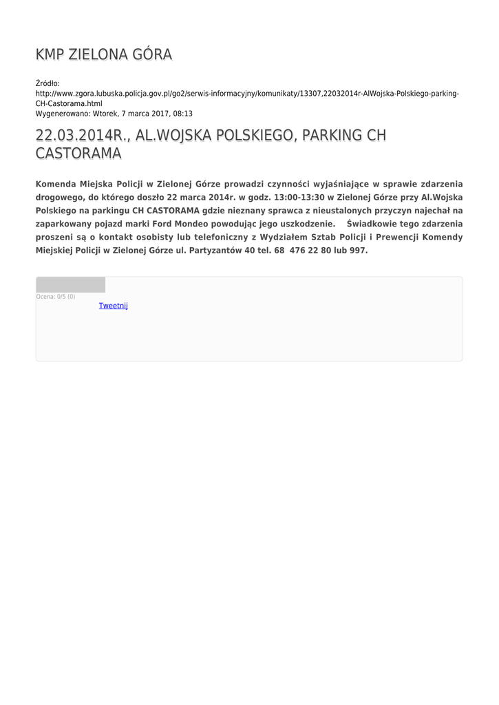 KMP ZIELONA GÓRA Źródło: http://www.zgora.lubuska.policja.gov.pl/go2/serwis-informacyjny/komunikaty/13307,22032014r-AlWojska-Polskiego-parkingCH-Castorama.html Wygenerowano: Wtorek, 7 marca 2017, 08:13 22.03.2014R., AL.WOJSKA POLSKIEGO, PARKING CH CASTORAMA Komenda Miejska Policji w Zielonej Górze prowadzi czynności wyjaśniające w sprawie zdarzenia drogowego, do którego doszło 22 marca 2014r. w godz. 13:00-13:30 w Zielonej Górze przy Al.Wojska Polskiego na parkingu CH CASTORAMA gdzie nieznany sprawca z nieustalonych przyczyn najechał na zaparkowany pojazd marki Ford Mondeo powodując jego uszkodzenie. Świadkowie tego zdarzenia proszeni są o kontakt osobisty lub telefoniczny z Wydziałem Sztab Policji i Prewencji Komendy Miejskiej Policji w Zielonej Górze ul. Partyzantów 40 tel. 68 476 22 80 lub 997. Ocena: 0/5 (0) Tweetnij