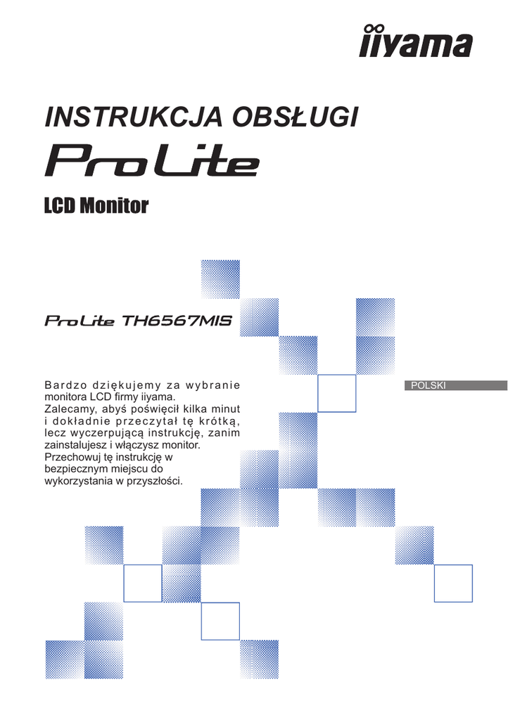 INSTRUKCJA OBSŁUGI Bardzo dziękujemy za wybranie monitora LCD firmy iiyama. Zalecamy, abyś poświęcił kilka minut i dokładnie przeczytał tę krótką, lecz wyczerpującą instrukcję, zanim zainstalujesz i włączysz monitor. Przechowuj tę instrukcję w bezpiecznym miejscu do wykorzystania w przyszłości. POLSKI DEKLARACJA ZGODNOŚCI Z WYMAGANIAMI OZNAKOWANIA CE Niniejszy monitor LCD jest zgodny z wymaganiami następujących Dyrektyw WE/UE: 2014/30/UE “Dyrektywa EMC”, 2014/35/UE “Dyrektywa niskiego napięcia”, 1995/5/EC “Dyrektywa R&TTE” i 2011/65/UE “Dyrektywa RoHS”. Ostrzeżenie Produkt należy do klasy A. W środowisku domowym może powodować zakłócenia radiowe. Użytkownik musi w takim przypadku podjąć odpowiednie kroki. IIYAMA CORPORATION: Wijkermeerstraat 8, 2131 HA Hoofddorp, The Netherlands POLSKI Model Nr. : PL6567 Rezerwujemy sobie prawo do zmiany danych technicznych bez uprzedzenia. Wszystkie znaki towarowe używane w tej instrukcji obsługi stanowią własność ich odpowiednich właścicieli. SPIS TREŚCI W TROSCE O TWOJE BEZPIECZEŃSTWO.......................................1 ZALECENIA DOTYCZĄCE BEZPIECZEŃSTWA.............................1 SPECJALNE UWAGI NA TEMAT MONITORÓW LCD....................3 OBSŁUGA KLIENTA.........................................................................5 CZYSZCZENIE................................................................................5 ZANIM URUCHOMISZ MONITOR........................................................6 WŁAŚCIWOŚCI...............................................................................6 KONTROLA ZAWARTOŚCI OPAKOWANIA....................................6 ROZPAKOWANIE............................................................................7 SPECJALNE UWAGI DOTYCZĄCE EKRANÓW DOTYKOWYCH...7 ELEMENTY STERUJĄCE I ZŁĄCZA : MONITORA........................8 INSTALACJA..................................................................................10 ELEMENTY STERUJĄCE I ZŁĄCZA : Pilot...................................12 PRZYGOTOWANIE PILOTA..........................................................13 GRUNDFUNKTIONEN...................................................................14 PODŁĄCZANIE MONITORA..........................................................17 ZAWARTOŚĆ MENU REGULACJA...............................................23 REGULACJA PARAMETRÓW EKRANU.......................................32 FUNKCJA ZARZĄDZANIA ENERGIĄ............................................35 ROZWIĄZYWANIE PROBLEMÓW.....................................................36 INFORMACJE NA TEMAT RECYKLINGU..........................................37 DODATEK ..........................................................................................38 DANE TECHNICZNE : ProLite TH6567MIS-B1AG........................38 WYMIARY......................................................................................39 SYNCHRONIZACJA.......................................................................40 Zalecamy recykling starego sprzętu. Wszelkie informacje na ten temat można znaleźć klikając link Poland na międzynarodowej stronie internetowej firmy iiyama pod adresem http://www.iiyama.com/recycle POLSKI USTAWIENIA KOMPUTERA..........................................................19 OBSŁUGA MONITORA.......................................................................21 W TROSCE O TWOJE BEZPIECZEŃSTWO ZALECENIA DOTYCZĄCE BEZPIECZEŃSTWA OSTRZEŻENIE ZAPRZESTAŃ UŻYTKOWANIA MONITORA, GDY CZUJESZ, ŻE WYSTĘPUJE JAKIŚ PROBLEM Gdy zauważysz jakiekolwiek nienormalne zjawiska, takie jak dym, dziwne dźwięki lub opary, odłącz monitor i natychmiast skontaktuj się z centrum serwisowym firmy iiyama. Dalsze używanie monitora może być niebezpieczne i spowodować pożar lub porażenie prądem elektrycznym. NIGDY NIE ZDEJMUJ OBUDOWY Wewnątrz monitora znajdują się obwody wysokiego napięcia. Zdjęcie obudowy może narazić na niebezpieczeństwo pożaru lub porażenia prądem elektrycznym. NIE WKŁADAJ ŻADNYCH PRZEDMIOTÓW DO MONITORA USTAW MONITOR NA PŁASKIEJ, STABILNEJ POWIERZCHNI Monitor może spowodować obrażenia ciała w razie upadku lub upuszczenia. NIE UŻYWAJ MONITORA W POBLIŻU WODY Nie używaj monitora w miejscach, gdzie mogłoby dojść do spryskania lub oblania monitora wodą, ponieważ mogłoby to spowodować pożar lub porażenie prądem elektrycznym. MONITOR NALEŻY UŻY WAĆ PRZY OKREŚLONYM ZASILANIU Zadbaj, aby monitor był używany tylko przy określonym zasilaniu energią elektryczną. Korzystanie z zasilania o niewłaściwym napięciu spowoduje nieprawidłowe działanie i może spowodować pożar lub porażenie prądem elektrycznym. CHROŃ PRZEWODY Nie rozciągaj, ani nie zginaj przewodu zasilającego, ani przewodu sygnałowego. Nie kładź monitora, ani żadnych innych ciężkich przedmiotów na przewodach. W przypadku uszkodzenia, przewody mogą spowodować pożar lub porażenie prądem elektrycznym. NIEKORZYSTNE WARUNKI POGODOWE Zaleca się nie używać monitora w czasie silnej burzy z wyładowaniami, ponieważ ustawiczne zaniki zasilania mogą spowodować nieprawidłowe działanie. Zaleca się także nie dotykać wtyczki w takich okolicznościach, ponieważ mogłoby to spowodować porażenie prądem elektrycznym. W TROSCE O TWOJE BEZPIECZEŃSTWO 1 POLSKI Nie dopuszczaj do sytuacji, aby we wnętrzu monitora znalazły się jakiekolwiek ciała stałe lub płyny, na przykład woda. W razie takiego zdarzenia, natychmiast odłącz monitor i skontaktuj się ze swym dostawcą lub z centrum serwisowym firmy iiyama. Używanie monitora z jakimikolwiek obcymi obiektami wewnątrz może spowodować pożar, porażenie prądem elektrycznym lub uszkodzenie. UWAGA MIEJSCE USTAWIENIA MONITORA Nie ustawiaj monitora w miejscach, gdzie mogą wystąpić nagłe zmiany temperatury lub w przestrzeniach wilgotnych, zapylonych lub zadymionych, ponieważ mogłoby to spowodować poża