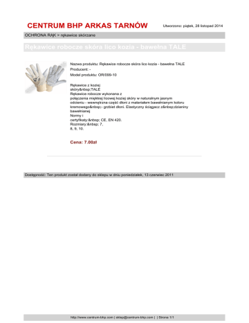 CENTRUM BHP ARKAS TARNÓW Utworzono: piątek, 28 listopad 2014 OCHRONA RĄK > rękawice skórzane Rękawice robocze skóra lico kozia - bawełna TALE Nazwa produktu: Rękawice robocze skóra lico kozia - bawełna TALE Producent: Model produktu: OR/099-10 Rękawice z koziej skóry TALE Rękawice robocze wykonana z połączenia miękkiej licowej koziej skóry w naturalnym jasnym odcieniu - wewnętrzna część dłoni z materiałem bawełnianym koloru kremowego - grzbiet dłoni. Elastyczny ściągacz z dzianiny bawełnianej Normy i certyfikaty: CE, EN 420. Rozmiary: 7, 8, 9, 10. Cena: 7.00zł Dostępność: Ten produkt został dodany do sklepu w dniu poniedziałek, 13 czerwiec 2011 http://www.centrum-bhp.com | [email protected] | | Strona 1/1