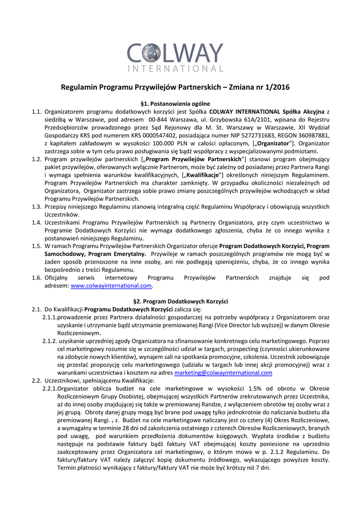Regulamin Programu Przywilejów Partnerskich – Zmiana nr 1/2016 1.1. 1.2. 1.3. 1.4. 1.5. 1.6. §1. Postanowienia ogólne Organizatorem programu dodatkowych korzyści jest Spółka COLWAY INTERNATIONAL Spółka Akcyjna z siedzibą w Warszawie, pod adresem 00-844 Warszawa, ul. Grzybowska 61A/2101, wpisana do Rejestru Przedsiębiorców prowadzonego przez Sąd Rejonowy dla M. St. Warszawy w Warszawie, XII Wydział Gospodarczy KRS pod numerem KRS 0000547402, posiadająca numer NIP 5272731683, REGON 360987881, z kapitałem zakładowym w wysokości 100.000 PLN w całości opłaconym, [„Organizator”]. Organizator zastrzega sobie w tym celu prawo posługiwania się bądź współpracy z wyspecjalizowanymi podmiotami. Program przywilejów partnerskich [„Program Przywilejów Partnerskich”] stanowi program obejmujący pakiet przywilejów, oferowanych wyłącznie Partnerom, może być zależny od posiadanej przez Partnera Rangi i wymaga spełnienia warunków kwalifikacyjnych, [„Kwalifikacje”] określonych niniejszym Regulaminem. Program Przywilejów Partnerskich ma charakter zamknięty. W przypadku okoliczności niezależnych od Organizatora, Organizator zastrzega sobie prawo zmiany poszczególnych przywilejów wchodzących w skład Programu Przywilejów Partnerskich. Przepisy niniejszego Regulaminu stanowią integralną część Regulaminu Współpracy i obowiązują wszystkich Uczestników. Uczestnikami Programu Przywilejów Partnerskich są Partnerzy Organizatora, przy czym uczestnictwo w Programie Dodatkowych Korzyści nie wymaga dodatkowego zgłoszenia, chyba że co innego wynika z postanowień niniejszego Regulaminu. W ramach Programu Przywilejów Partnerskich Organizator oferuje Program Dodatkowych Korzyści, Program Samochodowy, Program Emerytalny. Przywileje w ramach poszczególnych programów nie mogą być w żaden sposób przenoszone na inne osoby, ani nie podlegają spieniężeniu, chyba, że co innego wynika bezpośrednio z treści Regulaminu. Oficjalny serwis internetowy Programu Przywilejów Partnerskich znajduje się pod adresem: www.colwayinternational.com. 2. §2. Program Dodatkowych Korzyści 2.1. Do Kwalifikacji Programu Dodatkowych Korzyści zalicza się: 2.1.1.prowadzenie przez Partnera działalności gospodarczej na potrzeby współpracy z Organizatorem oraz uzyskanie i utrzymanie bądź utrzymanie premiowanej Rangi (Vice Director lub wyższej) w danym Okresie Rozliczeniowym. 2.1.2. uzyskanie uprzedniej zgody Organizatora na sfinansowanie konkretnego celu marketingowego. Poprzez cel marketingowy rozumie się w szczególności udział w targach, prospecting (czynności ukierunkowane na zdobycie nowych klientów), wynajem sali na spotkania promocyjne, szkolenia. Uczestnik zobowiązuje się przesłać propozycję celu marketingowego (udziału w targach lub innej akcji promocyjnej) wraz z warunkami uczestnictwa i kosztem na adres [email protected] 2.2. Uczestnikowi, spełniającemu Kwalifikacje: 2.2.1.Organizator oblicza budżet na cele marketingowe w wysokości 1.5% od obrotu w Okresie Rozliczeniowym Grupy Osobistej, obejmującej wszystkich Partnerów zrekrutowanych przez Uczestnika, aż do innej osoby znajdującej się także w premiowanej Randze, z wyłączeniem obrotów tej osoby wraz z jej grupą. Obroty danej grupy mogą być brane pod uwagę tylko jednokrotnie do naliczania budżetu dla premiowanej Rangi. , z. Budżet na cele marketingowe naliczany jest co cztery (4) Okres Rozliczeniowe, a wymagalny w terminie 28 dni od zakończenia ostatniego z czterech Okresów Rozliczeniowych, branych pod uwagę, pod warunkiem przedłożenia dokumentów księgowych. Wypłata środków z budżetu następuje na podstawie faktury bądź faktury VAT obejmującej koszty poniesione na uprzednio zaakceptowany przez Organizatora cel marketingowy, o którym mowa w p. 2.1.2 Regulaminu. Do faktury/faktury VAT należy załączyć kopię dokumentu źródłowego, wykazującego powyższe koszty. Termin płatności wynikający z faktury/faktury VAT nie może być krótszy niż 7 dni. 2.2.2. Organizator użyczy Uczestnikowi, na mocy odrębnie zawartej umowy użyczenia, materiały służące identyfikacji Produktów Organizatora (standy i inne materiały reklamowe) na potrzeby uczestnictwa w zaakceptowanym wydarzeniu. 3. § 3. Program Samochodowy 3.1. Do Kwalifikacji do Programu Samochodowego zalicza się: 3.1.1. prowadzenie przez Partnera działalności gospodarczej na potrzeby współpracy z Organizatorem oraz uzyskanie i utrzymanie przez 5 Okresów Rozliczeniowych z 8 Okresów Rozliczeniowych poprzedzających przystąpienie do Programu Samochodowego premiowanej Rangi: a) Director lub wyższej - dla głównego Programu Samochodowego; b) Leader lub wyższej - dla Programu Samochodowego „Yaris”. Utrzymanie Rangi premiowanej w kolejnych Okresach Rozliczeniowych po przystąpieniu do Programu Samochodowego jest warunkiem koniecznym dla uzyskania premii samochodowej w kolejnych Okresach Rozliczeniowych. 3.1.2. podpisanie we własnym imieniu, na własny koszt i ryzyko umowy leasingowej bądź umowy najmu długoterminowego samochodu w dedykowanych modelach marki: a) b) dla głównego Programu Samochodowego - marki BMW, Volvo, Toyota, Lexus, przy czym dedykowane modele zależne są od Rangi uzyskanej przez Partnera; dla Programu Samochodowego „Yaris” – wskazanego modelu Toyoty „Yaris;, ze wskazaną przez Organizatora spółką leasingową (np. Masterlease), na warunkach flotowych dla poszczególnych rodzajów samochodów, wynegocjowanych przez Organizatora oraz przedłożenie Organizatorowi uwierzytelnionej kopii podpisanej umowy leasingu bądź umowy najmu długoterminowego. Organizator zastrzega, iż podpisanie umowy leasingu bądź umowy najmu długoterminowego z ze spółką leasingową może zostać poprzedzone jej wewnętrzną odrębną procedurą kwalifikacyjną, w celu zweryfikowania zdolności kredytowej Uczestnika, która nie zależy od Organizatora. 3.1.3. oznakowanie pojazdu
